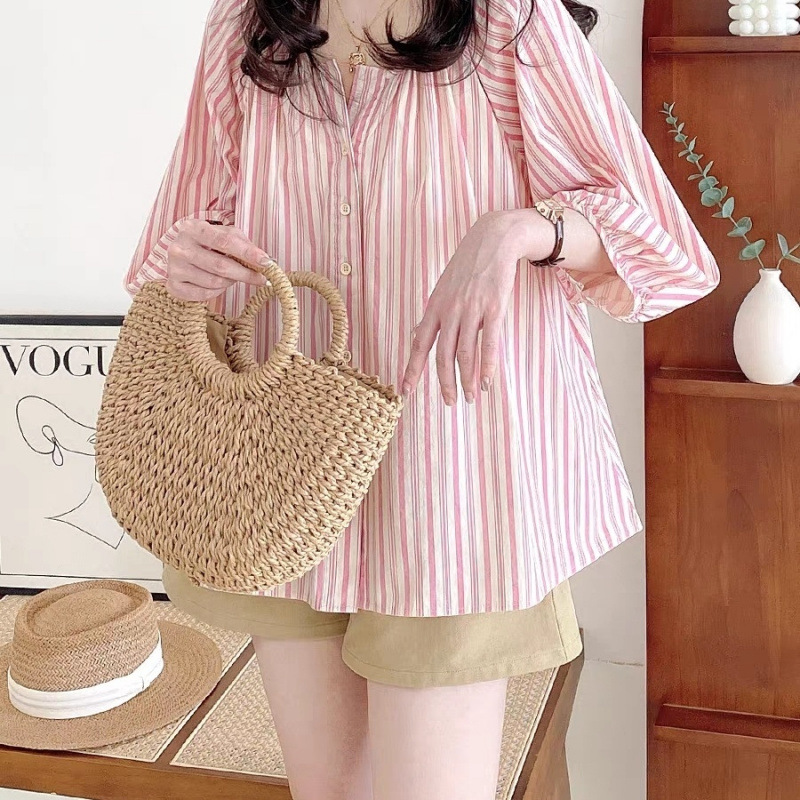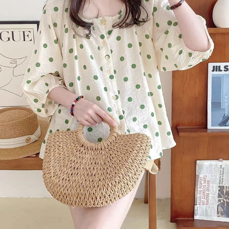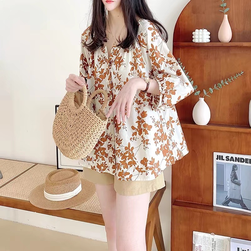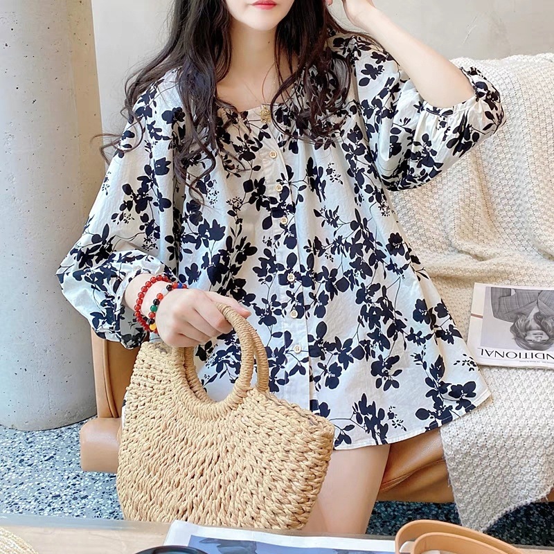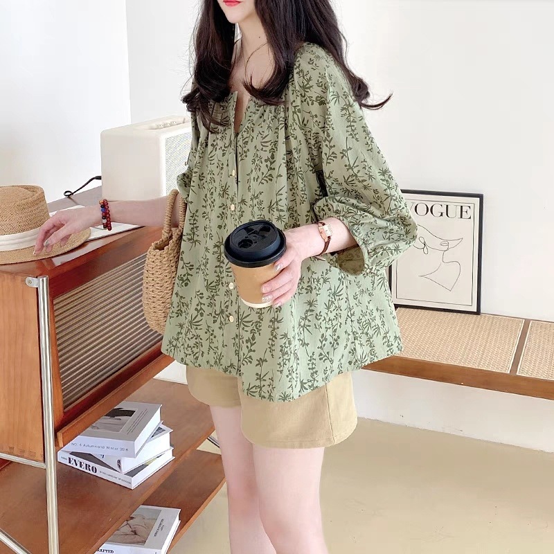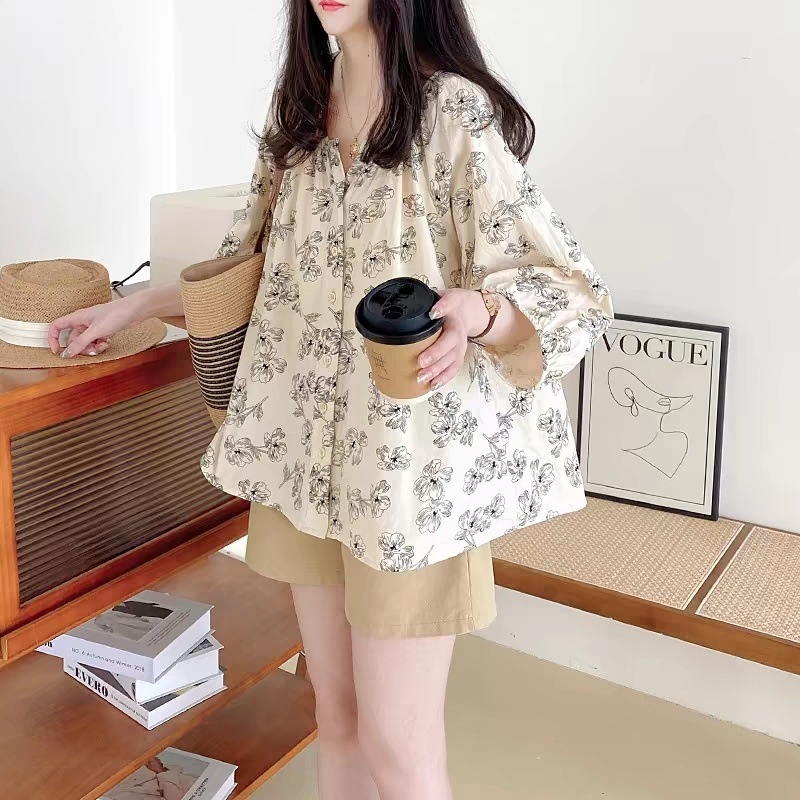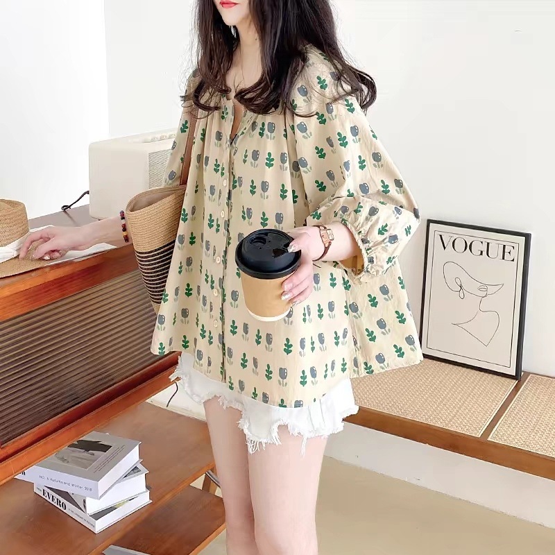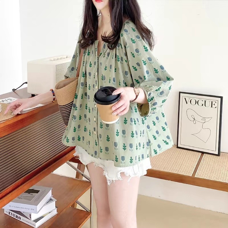 娃娃衫上衣女夏2024年新款法式甜美v领灯笼袖碎花七分袖印花衬衫