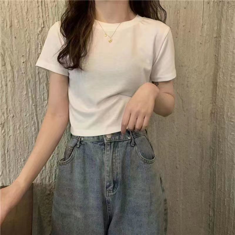 粗横条纹高腰短款纯棉短袖t恤女新款夏季宽松学生半袖上衣服