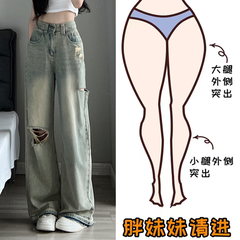 梨形身材复古破洞牛仔裤女直筒夏新款大码胖mm显瘦遮胯拖地阔腿裤