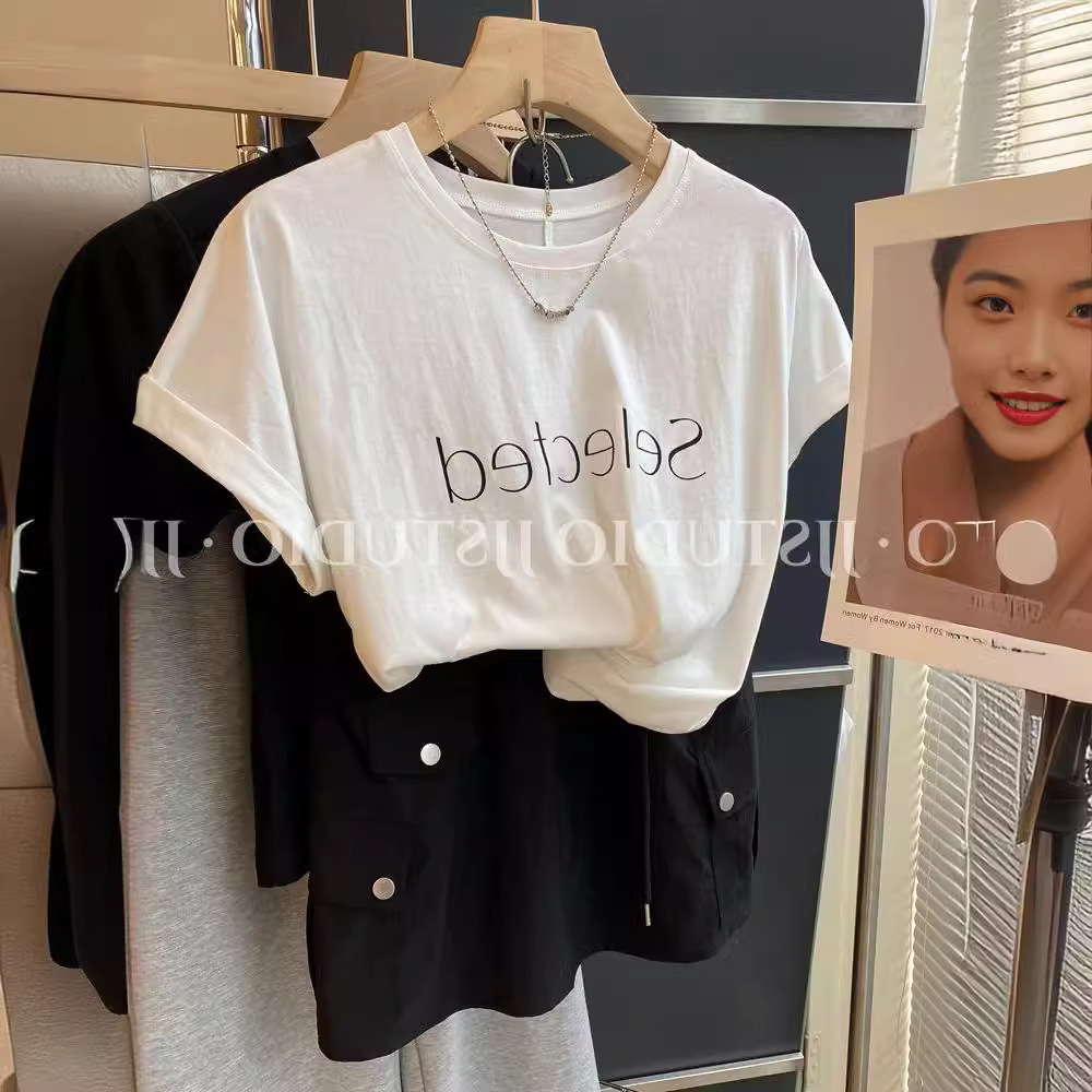 简约百搭字母印花白色短袖夏季正肩T恤夏圆领宽松体恤上衣