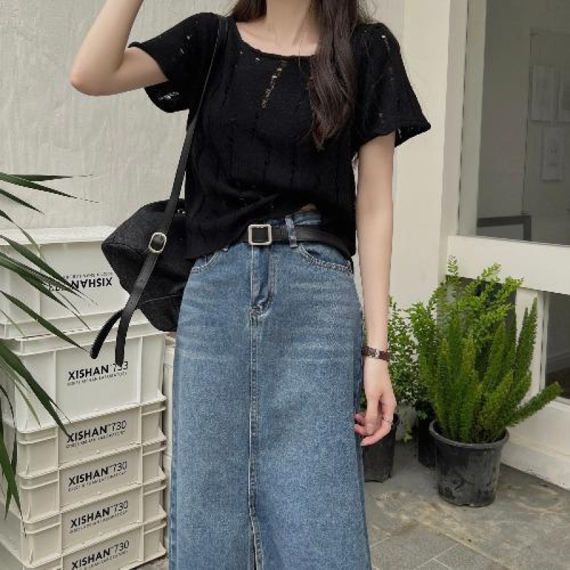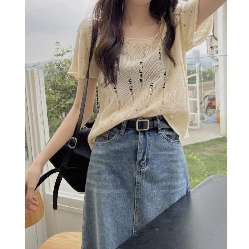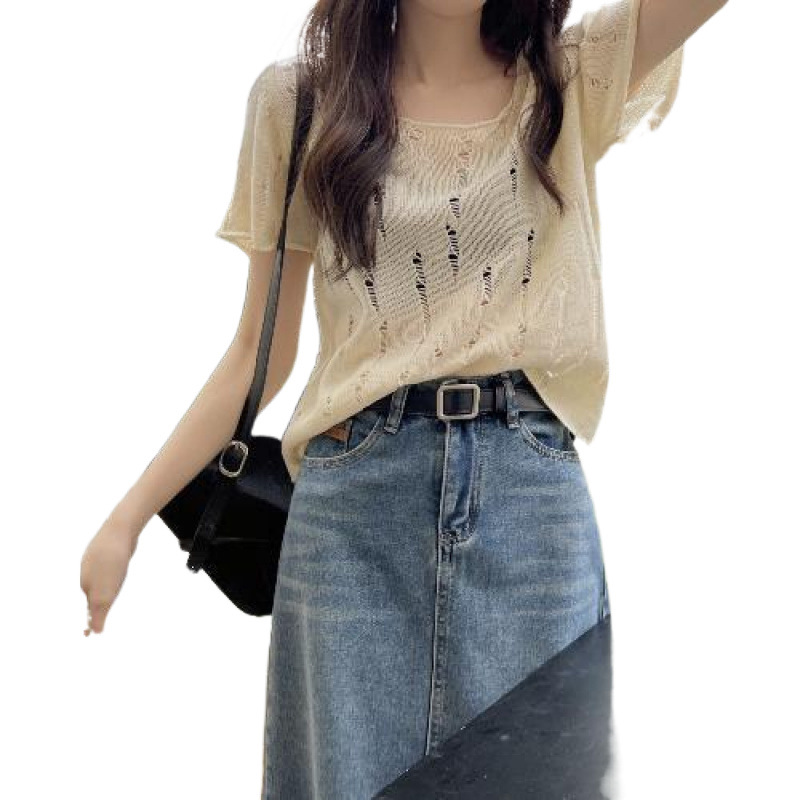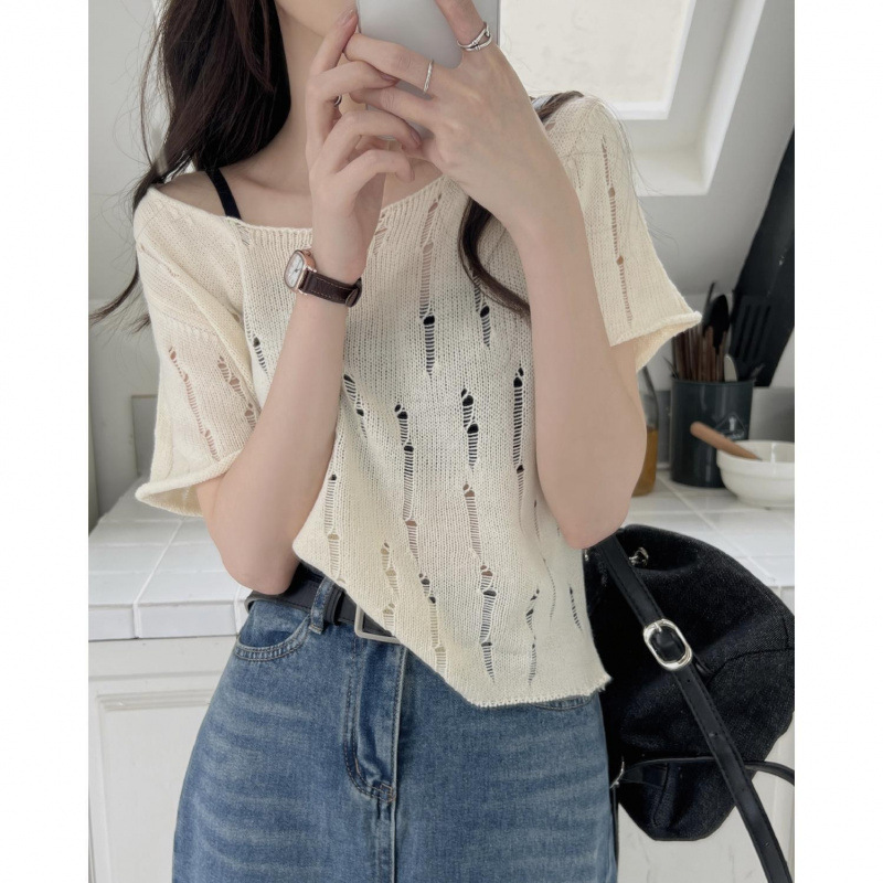 T恤夏季女装韩版百搭纯欲风小心机镂空针织洋气短款显瘦短袖上衣