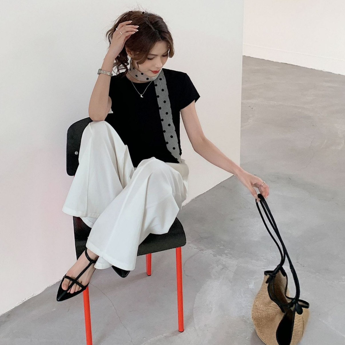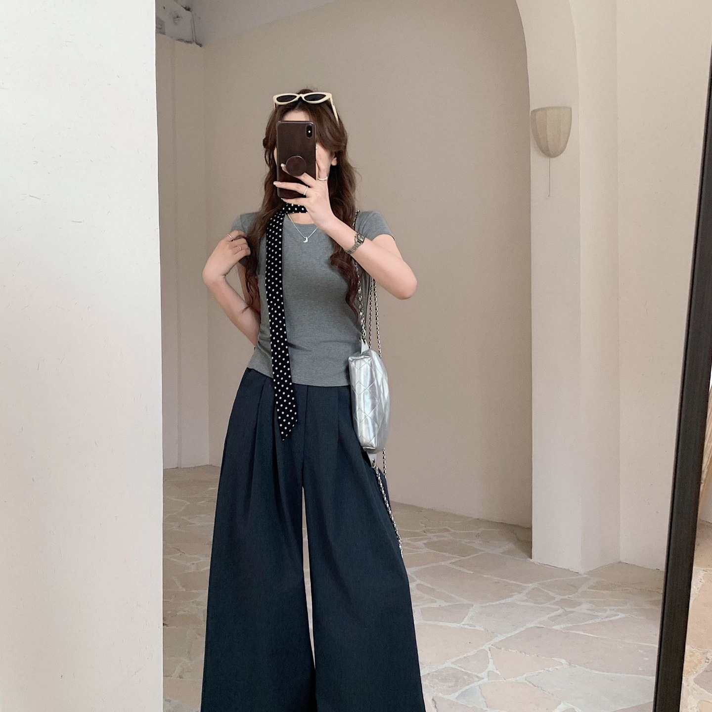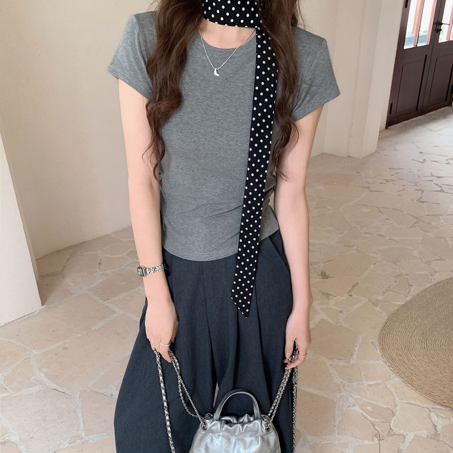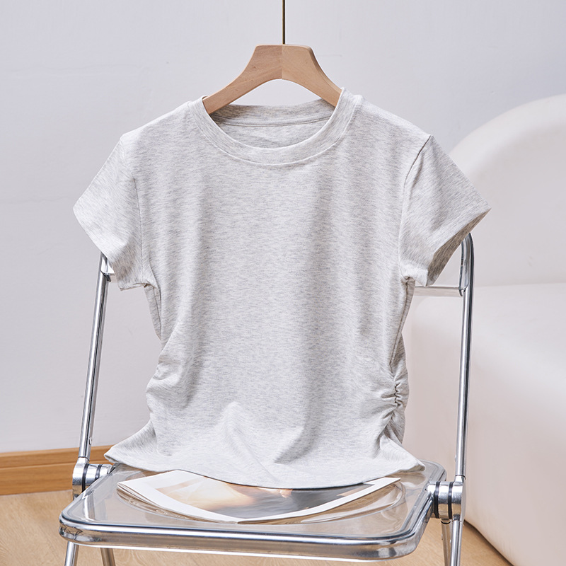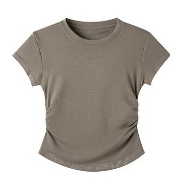 收腰褶皱正肩短袖t恤女法式圆领夏季弹力修身辣妹风显瘦短上衣女
