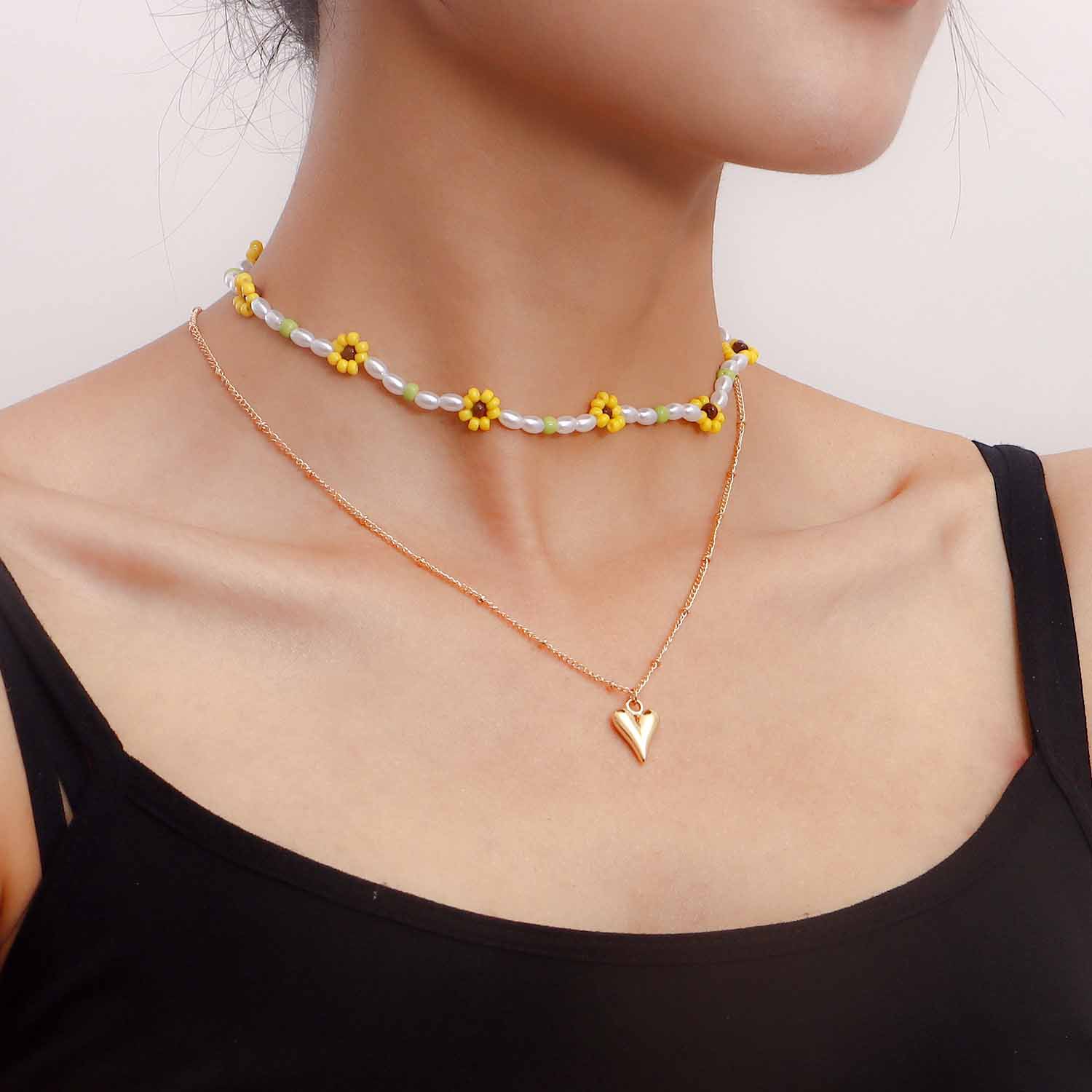 饰品波西米亚双层彩色雏菊花朵爱心吊坠项链女锁骨链项饰