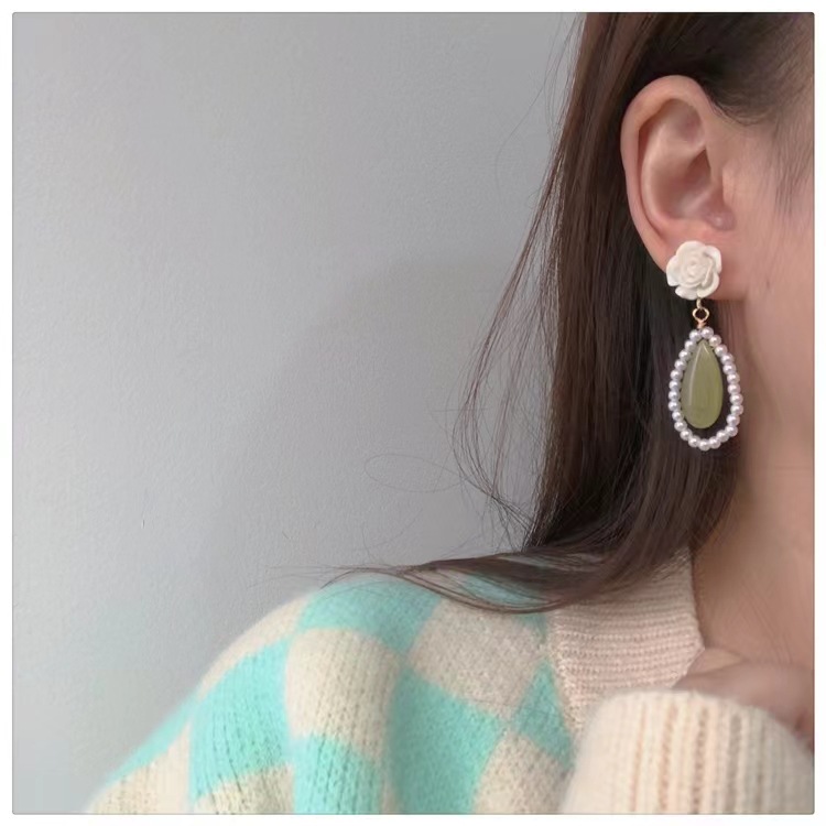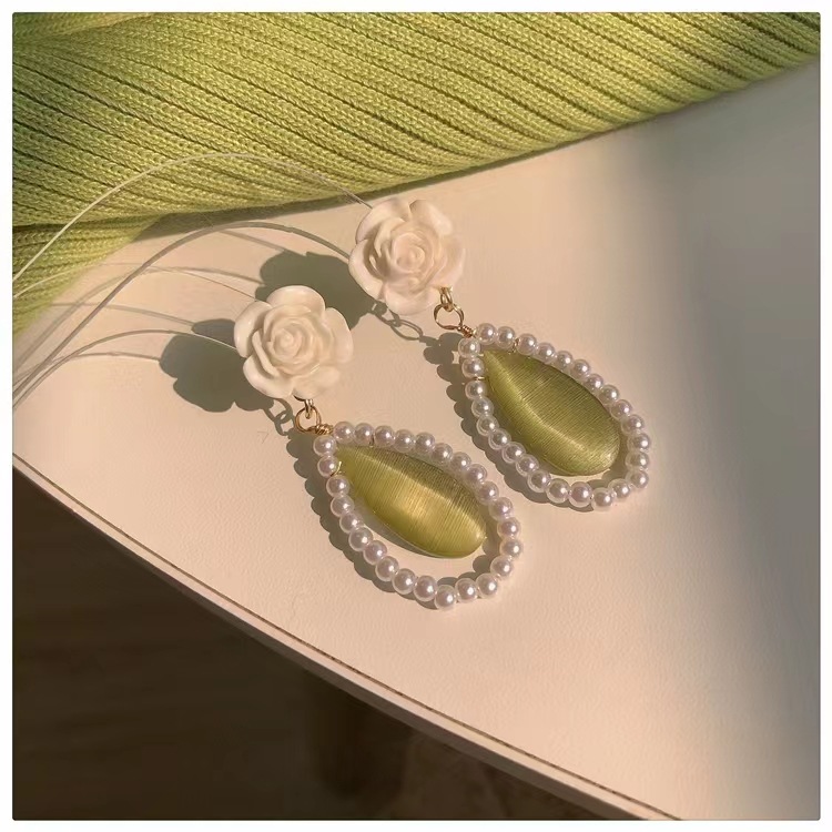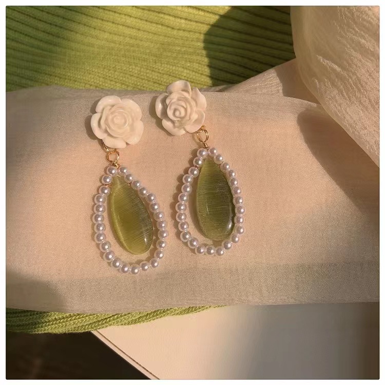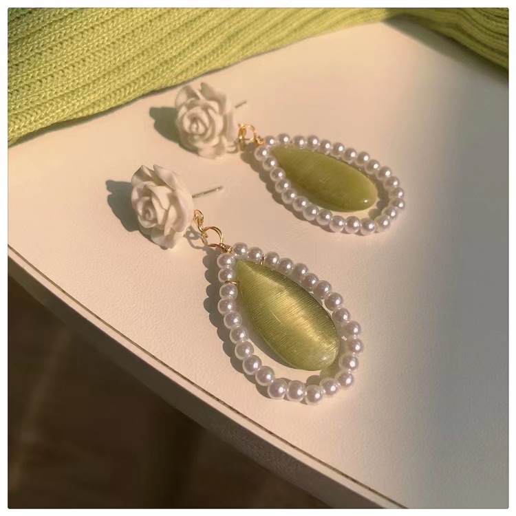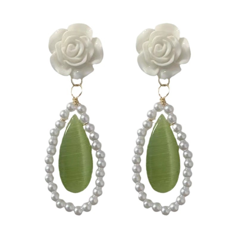 法式复古绿色 猫眼石耳钉~温柔珍珠山茶花玫瑰水滴耳环女夏季耳夹