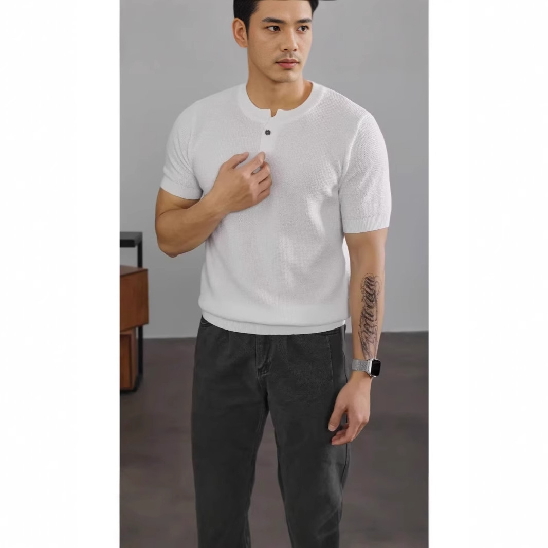 亨利领短袖针织衫男菠萝纹简约夏季冰丝透气百搭内搭