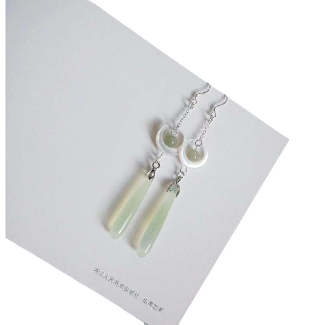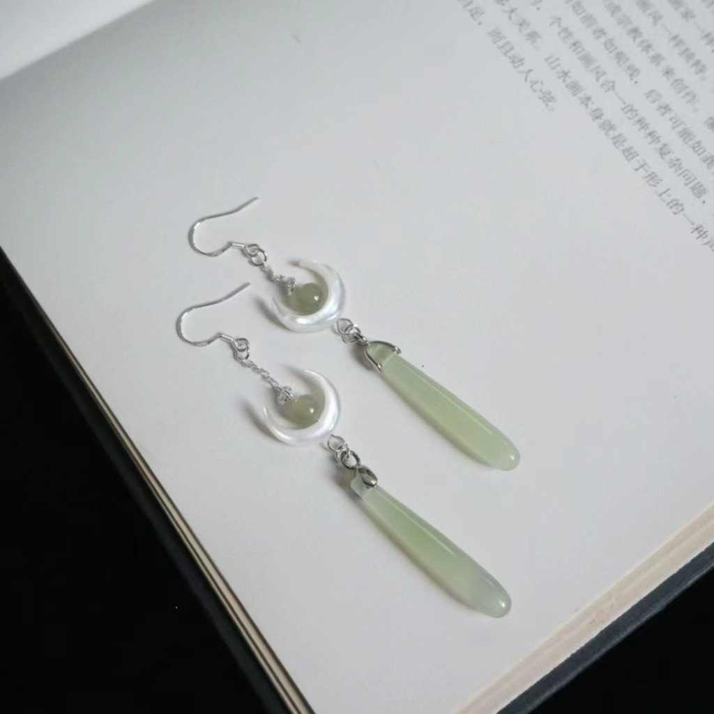 月升沧海仿和田玉月亮耳坠浅绿水滴长款新中式国风蚊香盘耳夹耳环