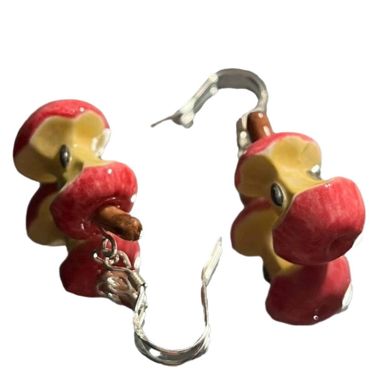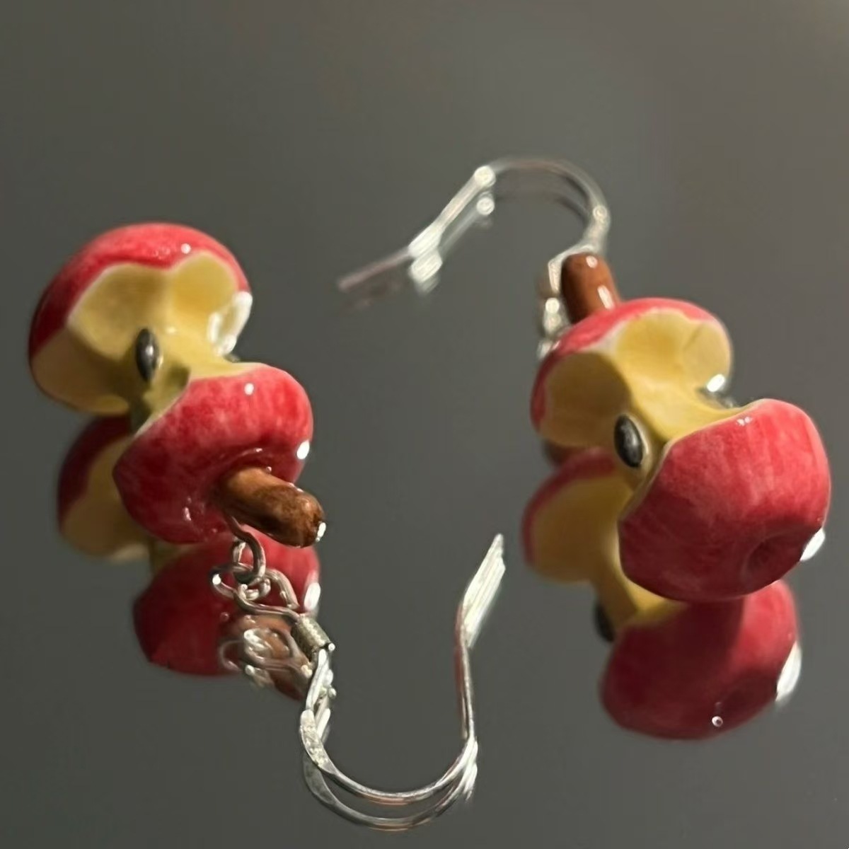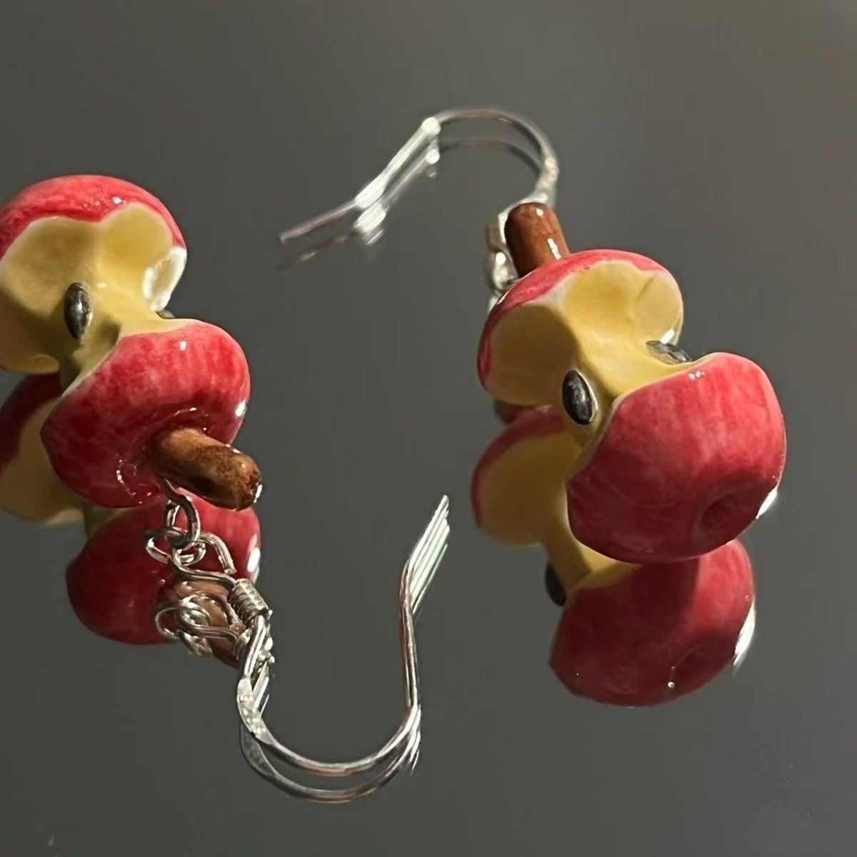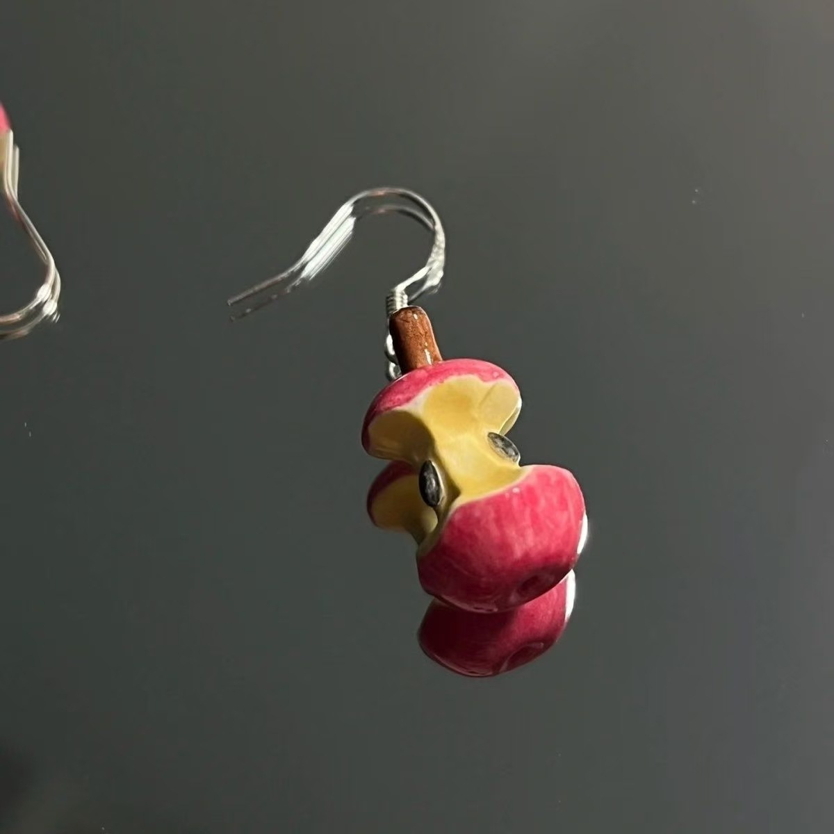 可爱仿真红色苹果核水果搞怪独特s925耳环食物系列不对称耳饰耳夹