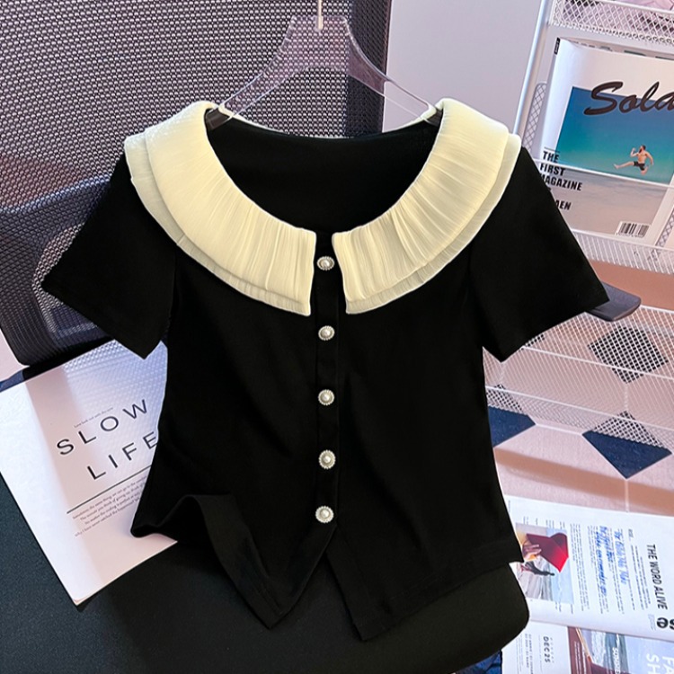 法式撞色网纱娃娃领上衣女夏季感时尚洋气别致小个子短款T恤