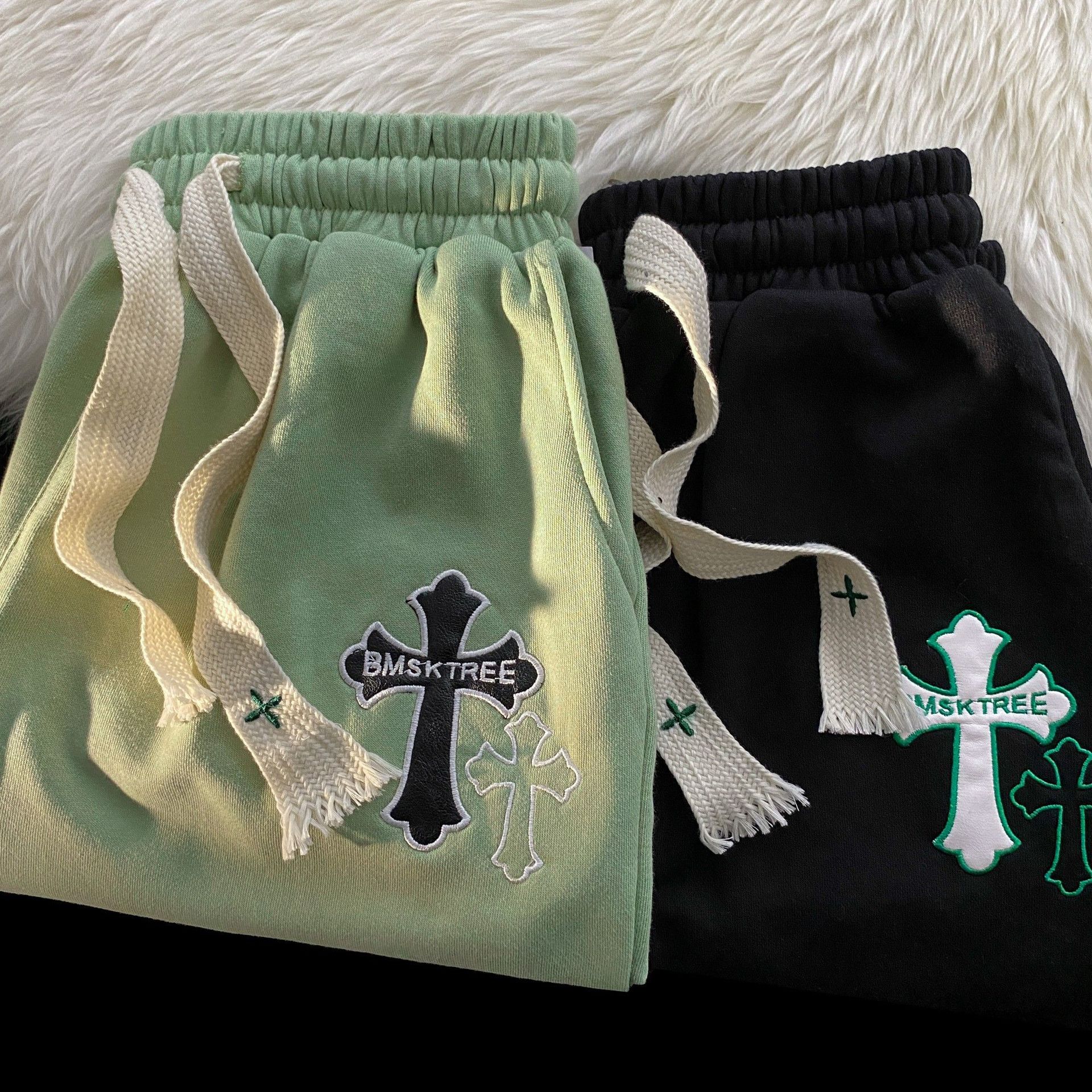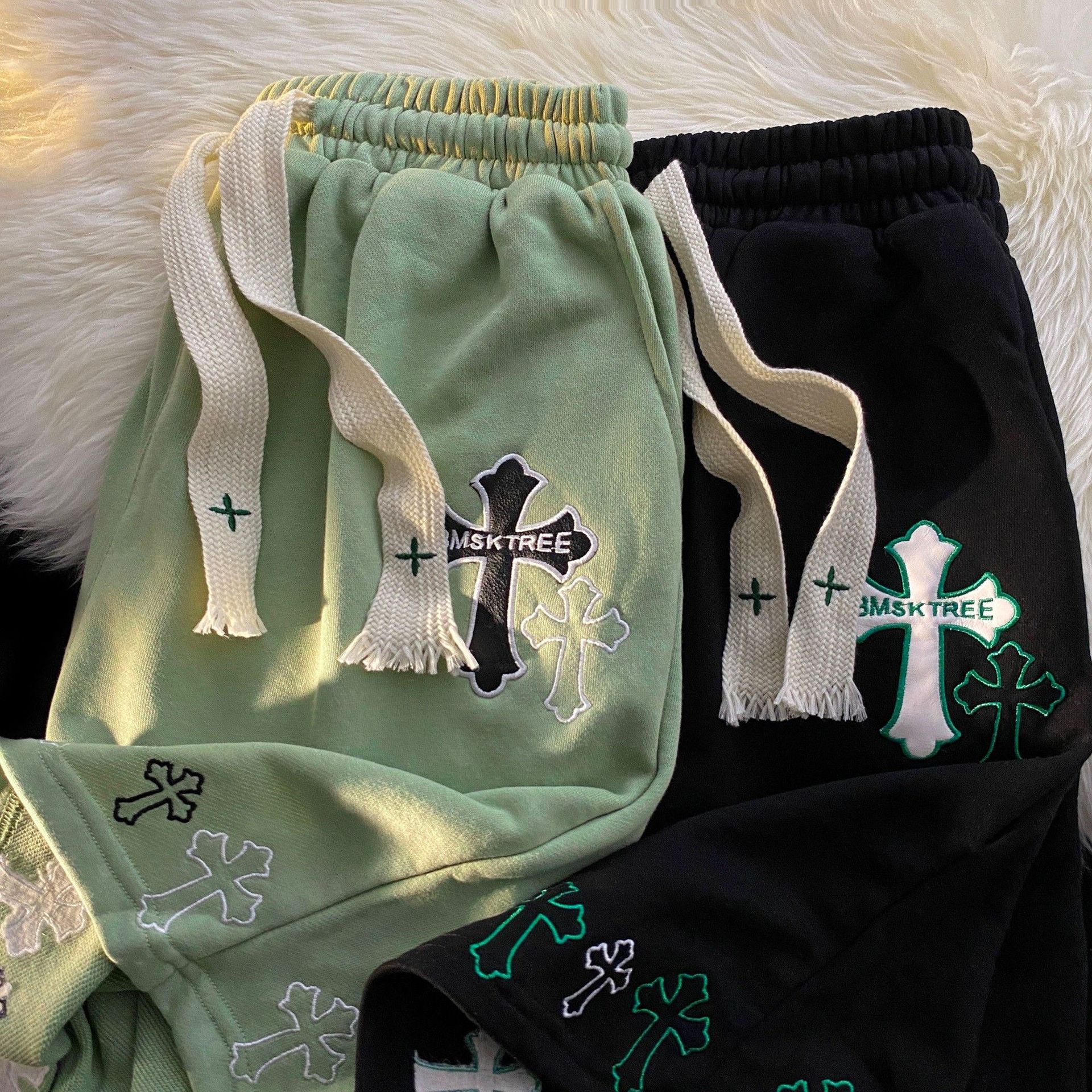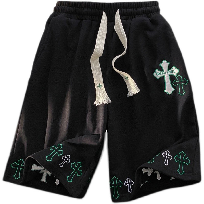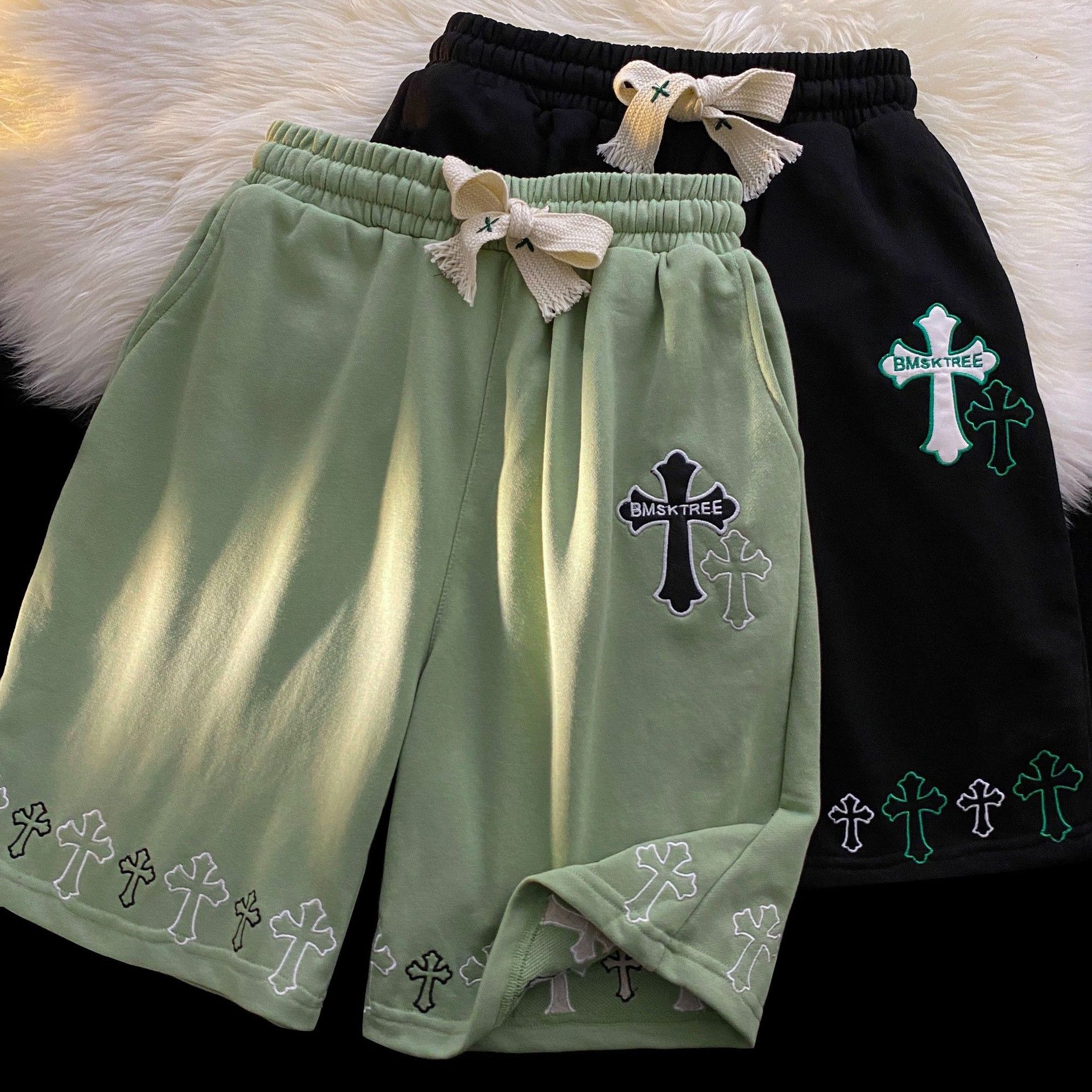 潮牌街头复古vintage十字架贴布运动短裤女ins高街暗黑宽松五分裤