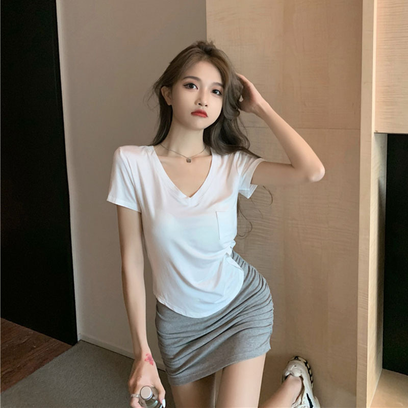 240g莫代尔V领短袖女T恤2025新款夏装体恤韩版宽松显瘦不规则上衣
