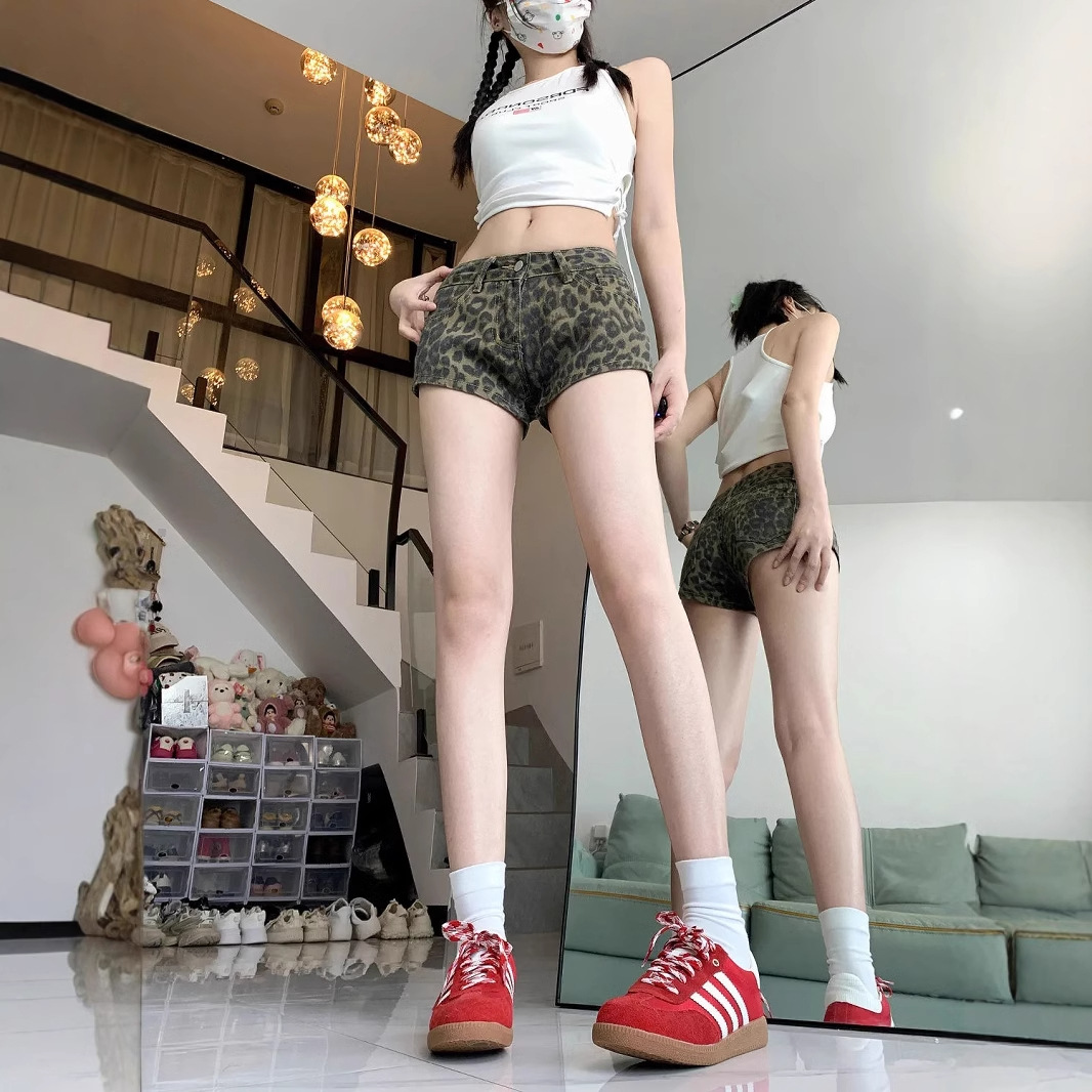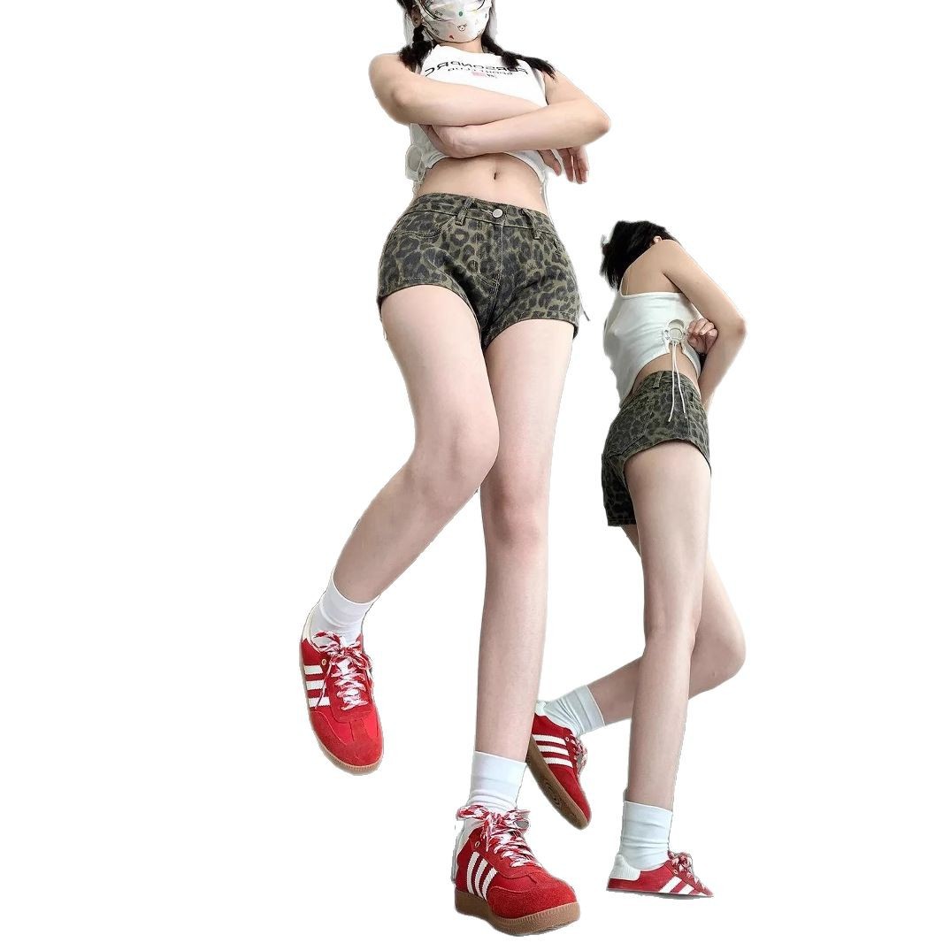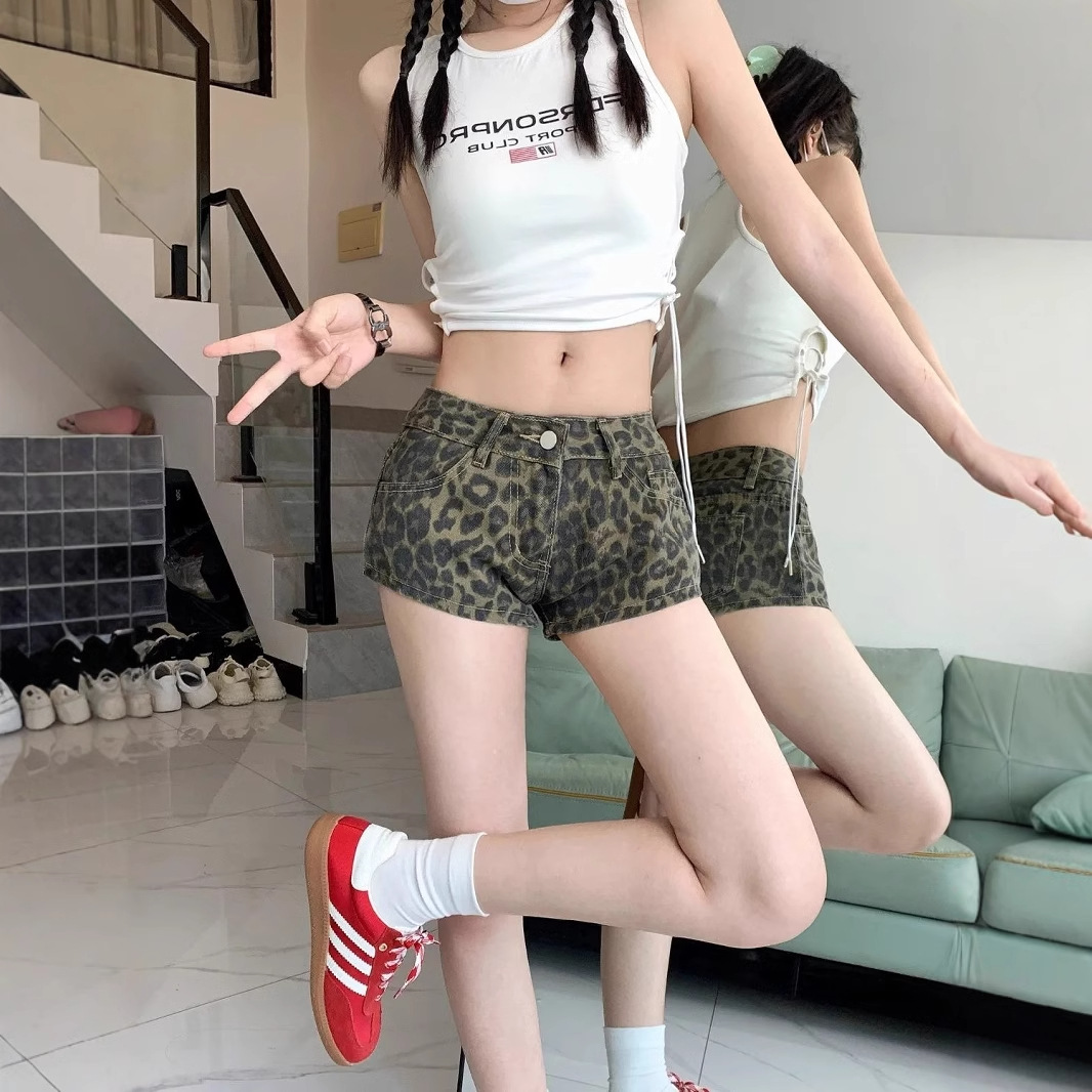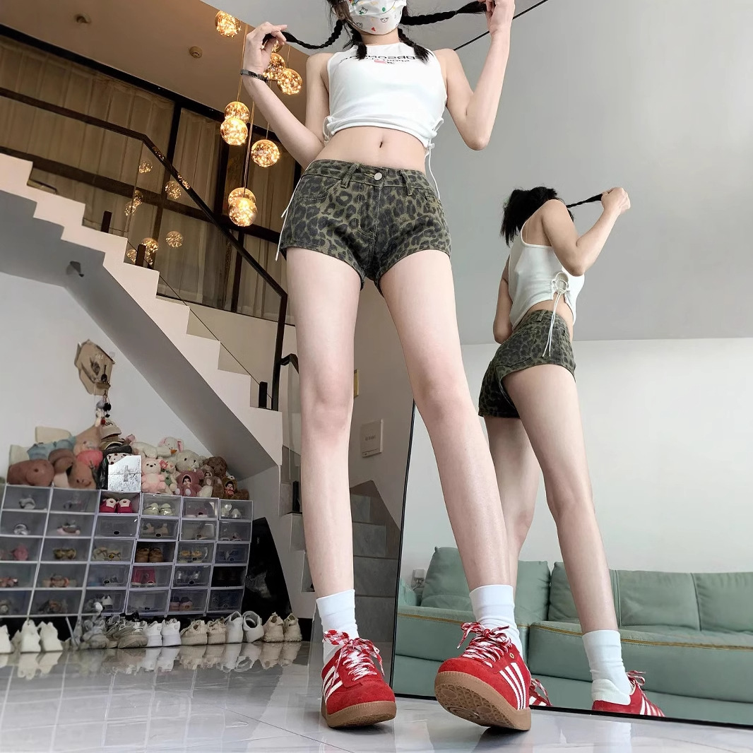 美式复古辣妹低腰牛仔超短裤女装夏季新款直筒显瘦阔腿豹纹热裤子