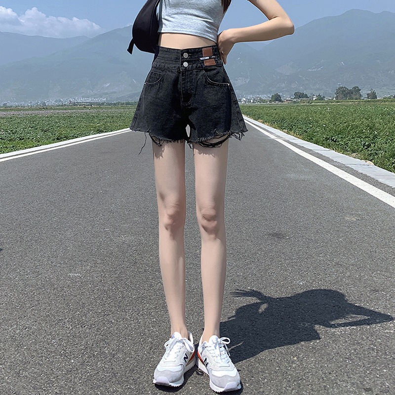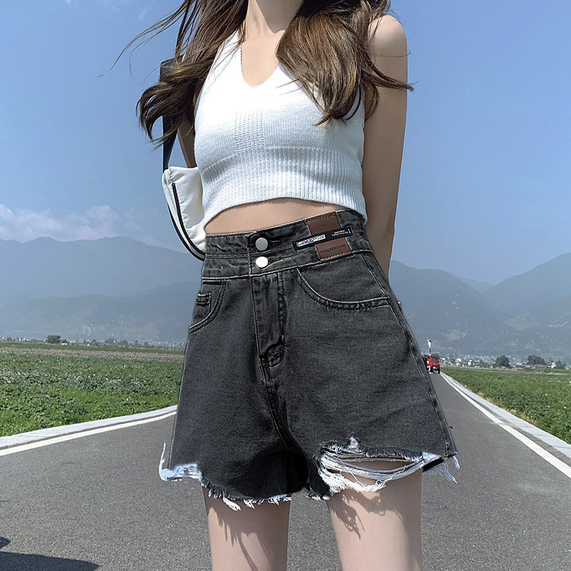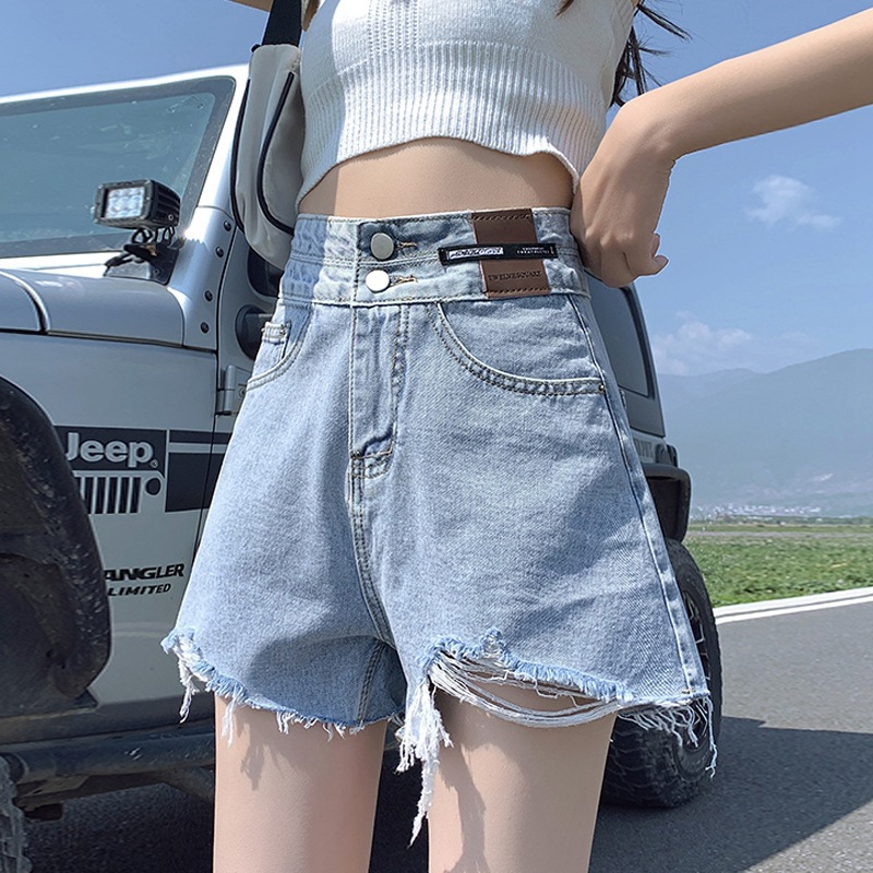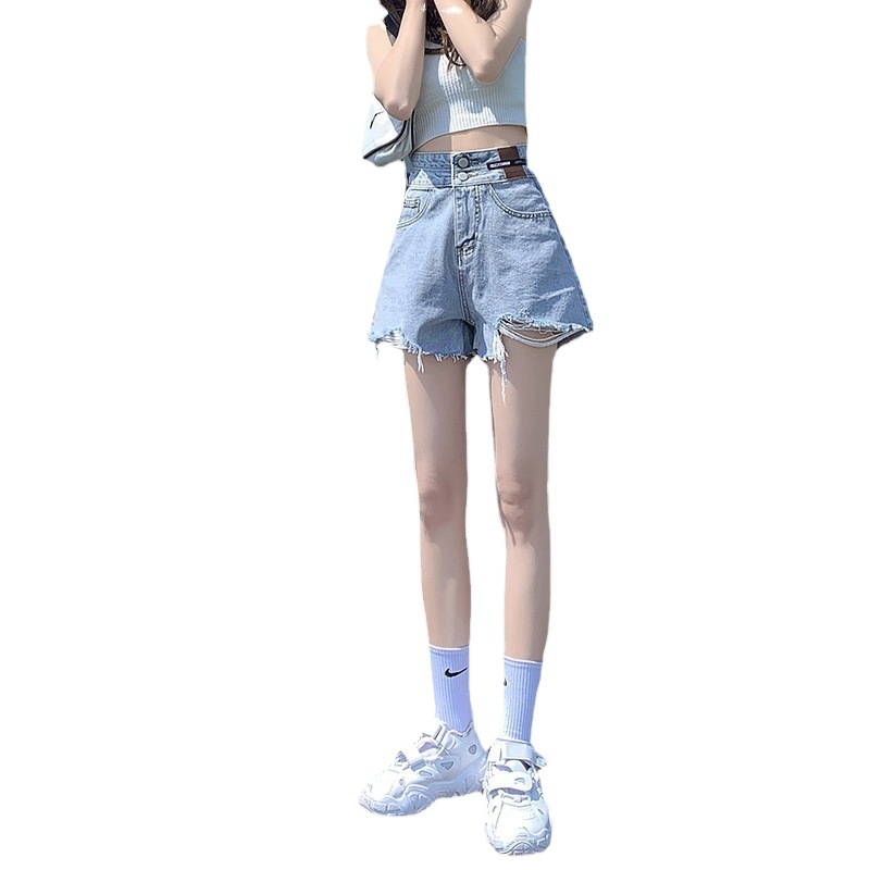 破洞薄牛仔短裤女夏新款双扣高腰显瘦a字宽松韩版阔腿热裤潮
