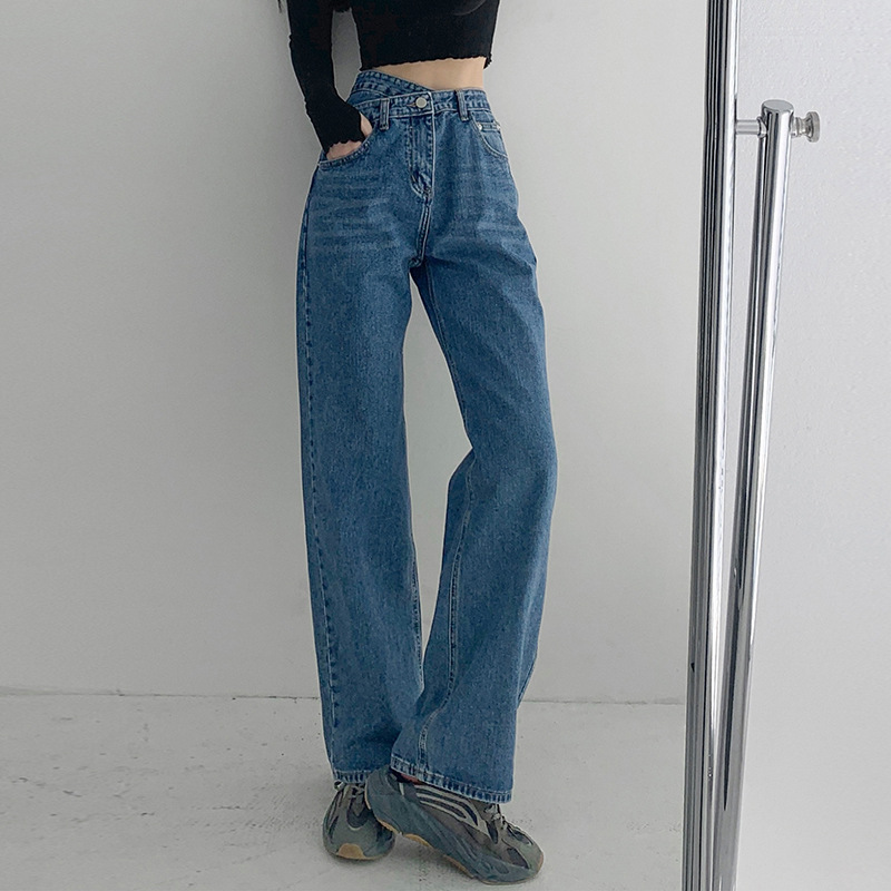 蓝色直筒牛仔裤女夏装高腰显瘦设计感宽松阔腿裤小个子拖地个性潮