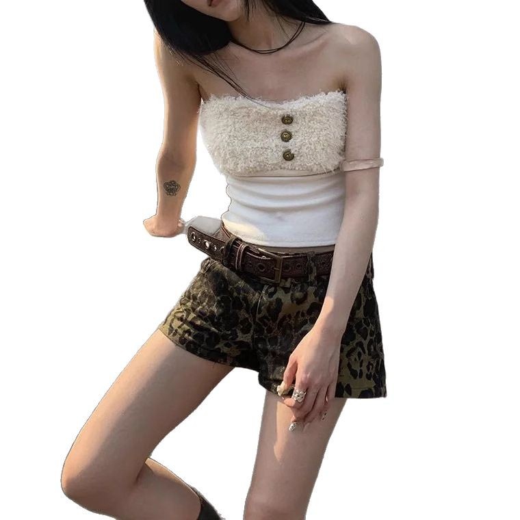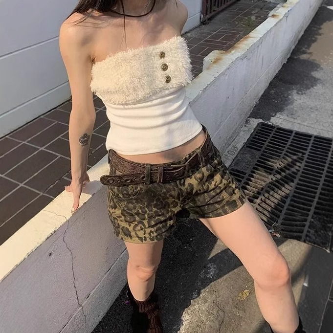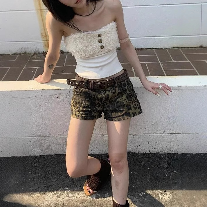 美式复古水洗辣妹豹纹短裤女高街废土风显瘦直筒阔腿包臀热裤子潮