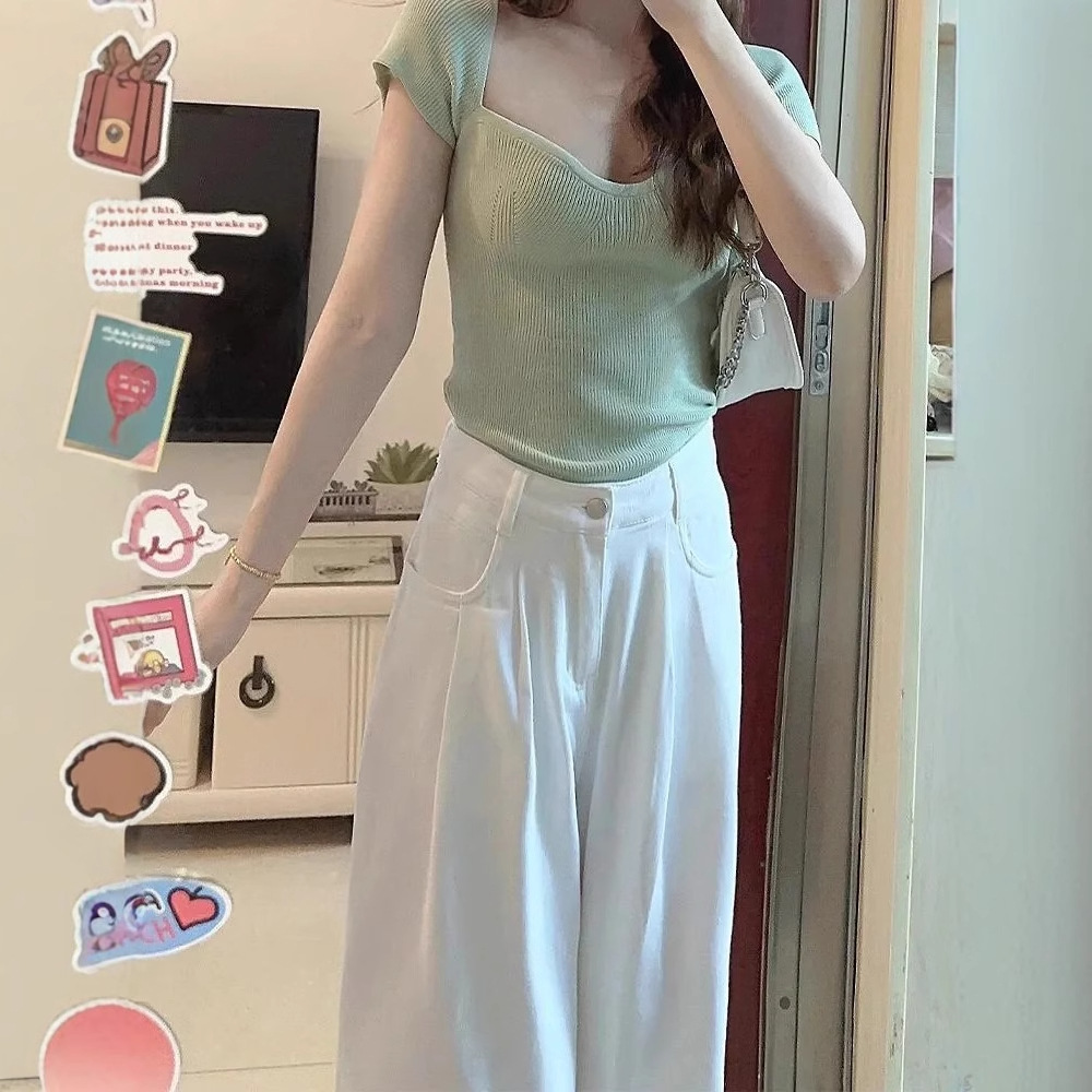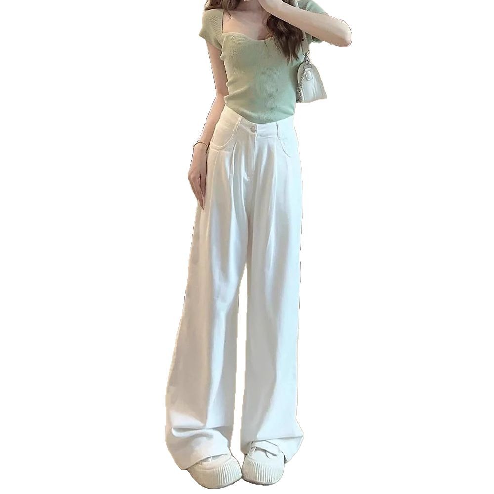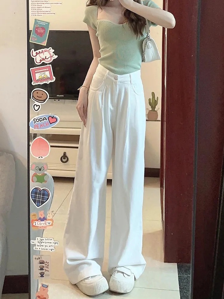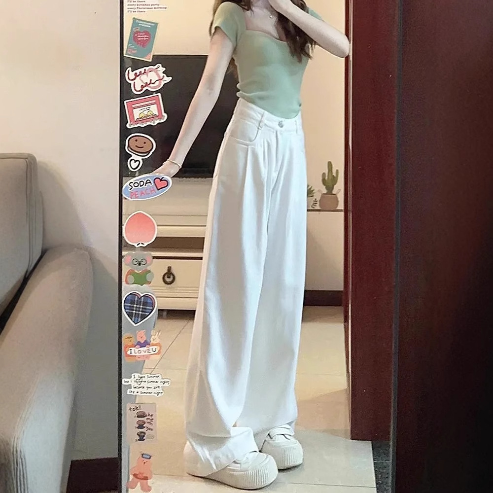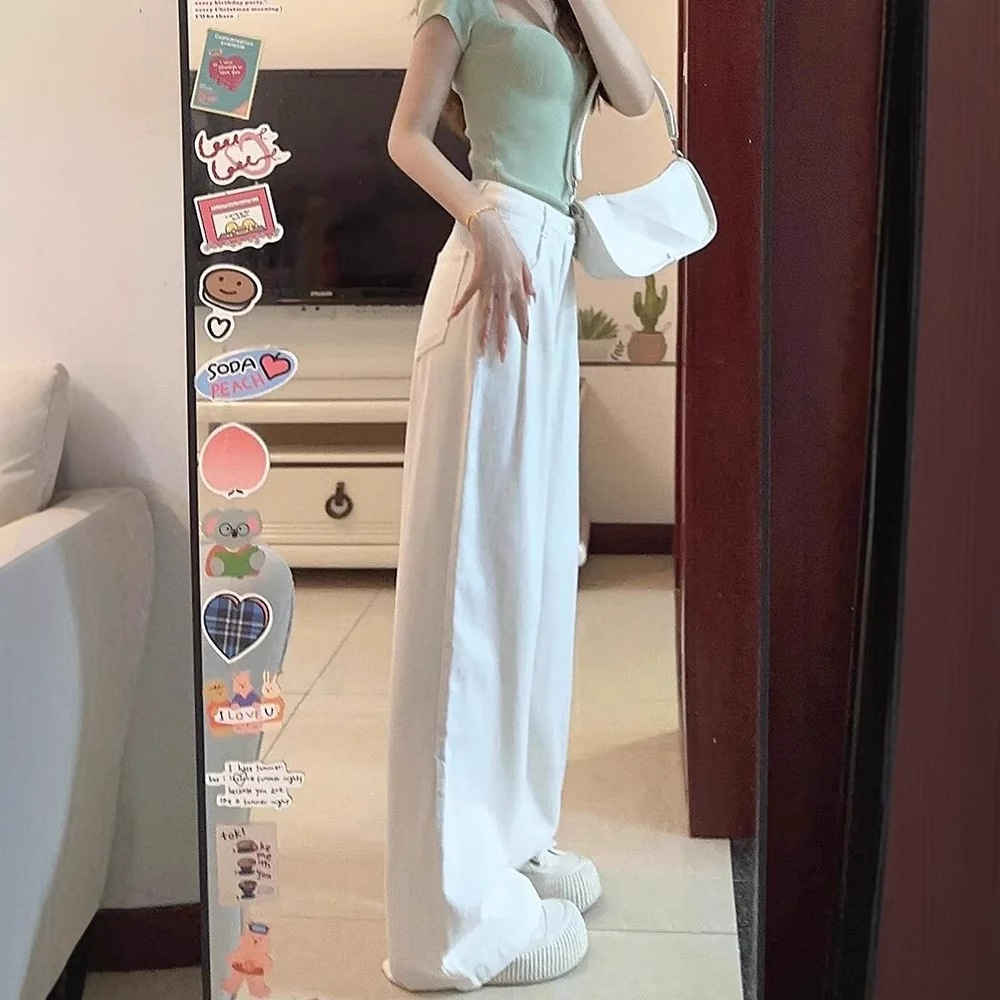大码白色垂感褶皱阔腿牛仔裤女夏季高腰胖mm宽松显瘦直筒拖地裤子