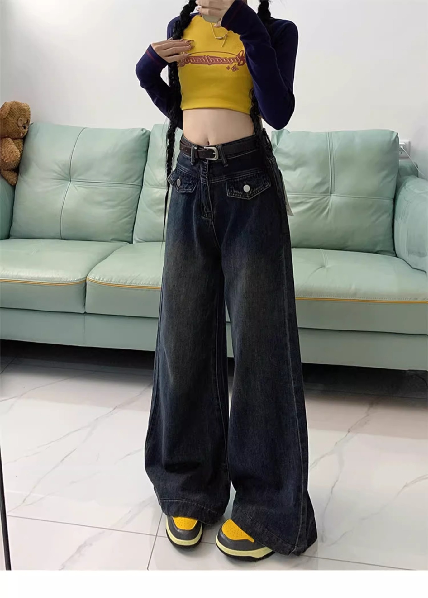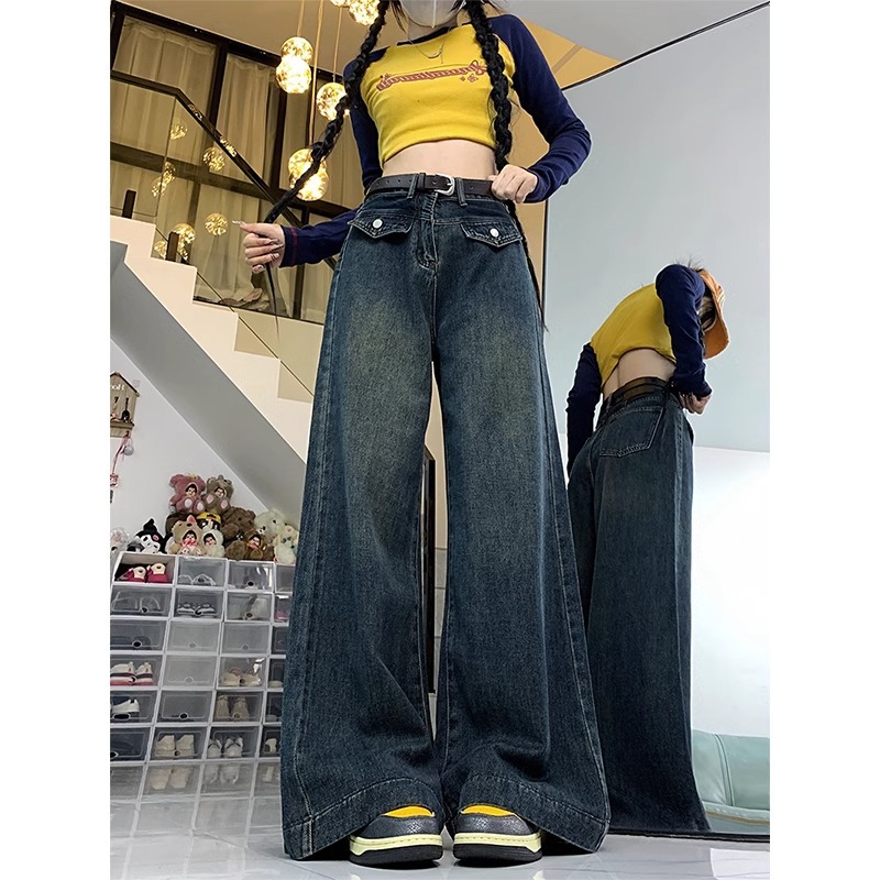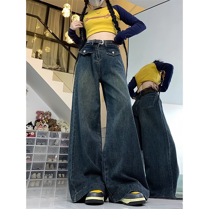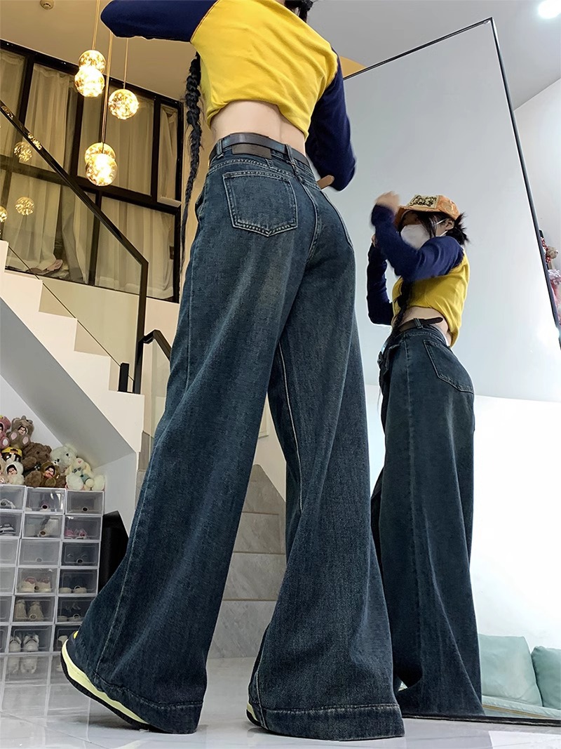 大码复古直筒牛仔裤女春秋设计感高腰显瘦宽松拖地阔腿裤子