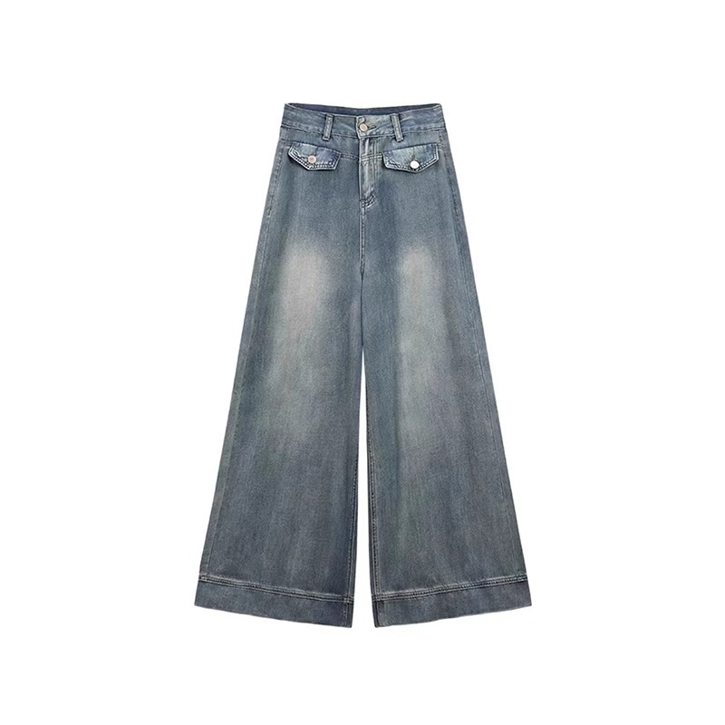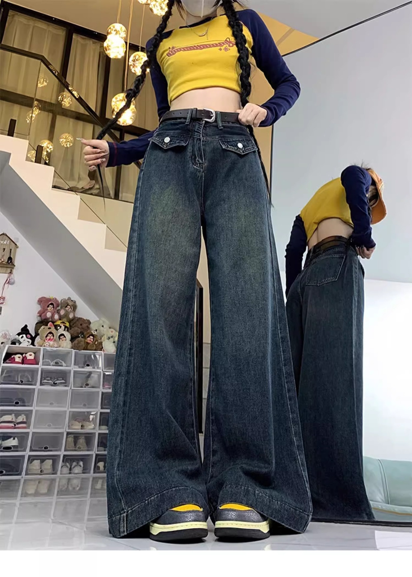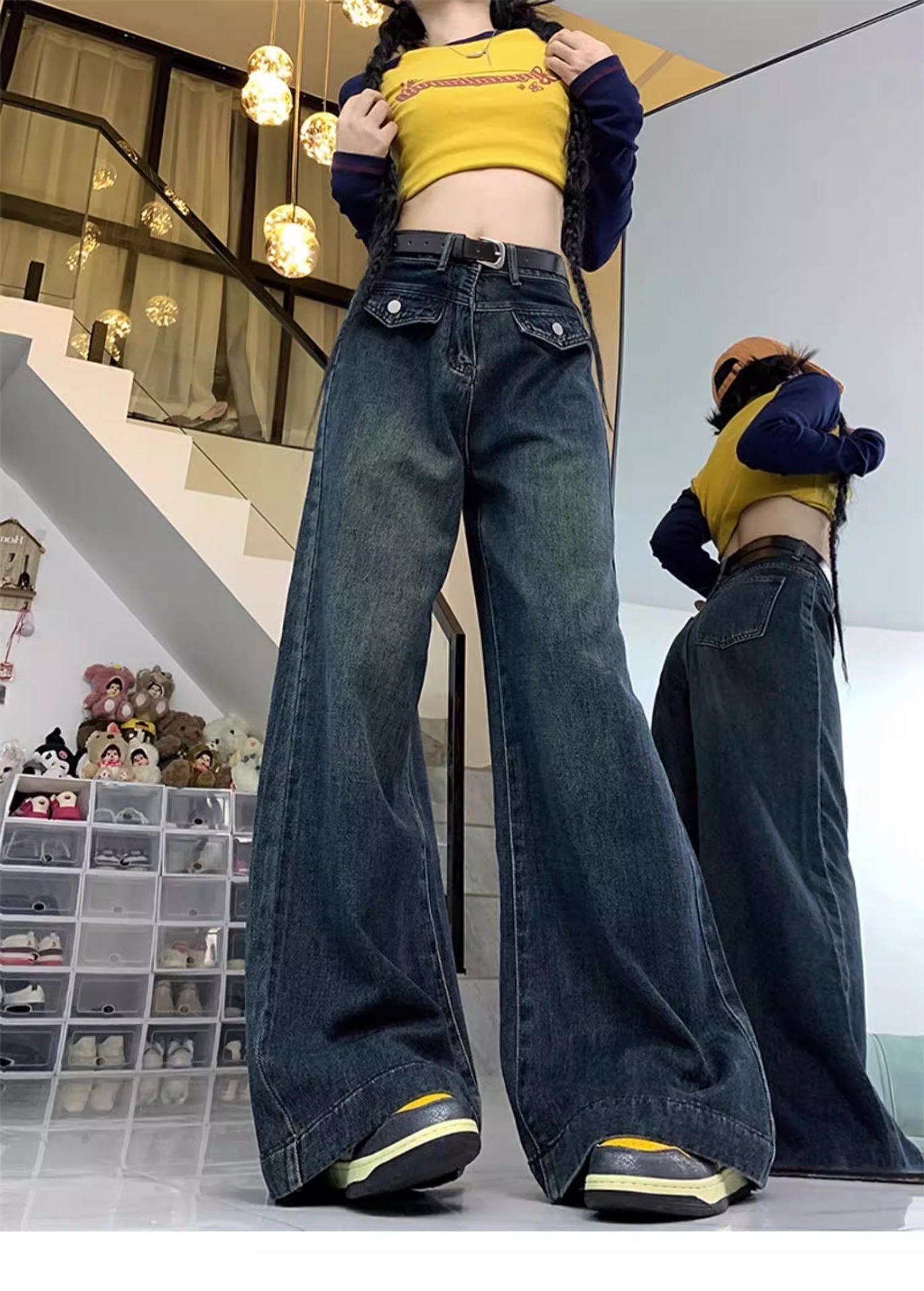 大码复古直筒牛仔裤女春秋设计感高腰显瘦宽松拖地阔腿裤子