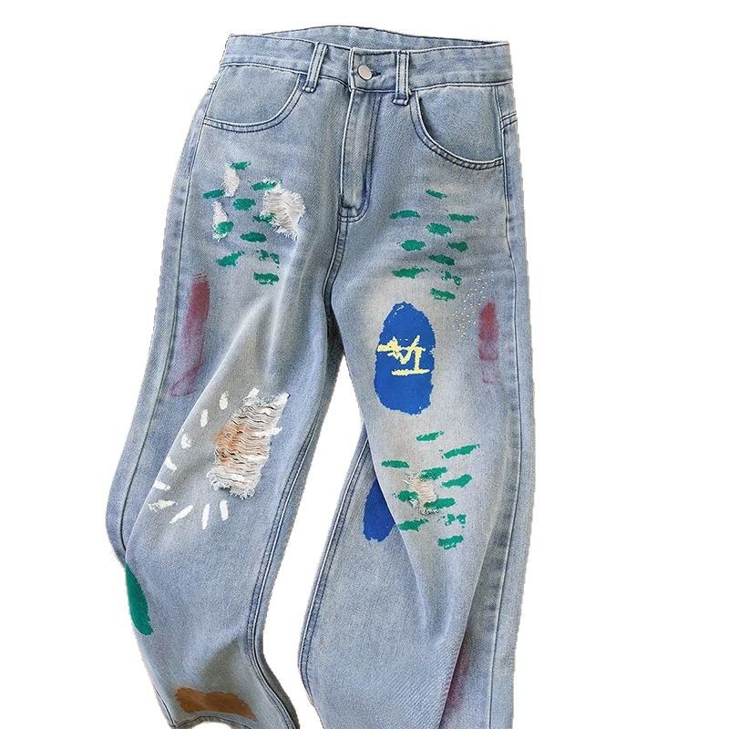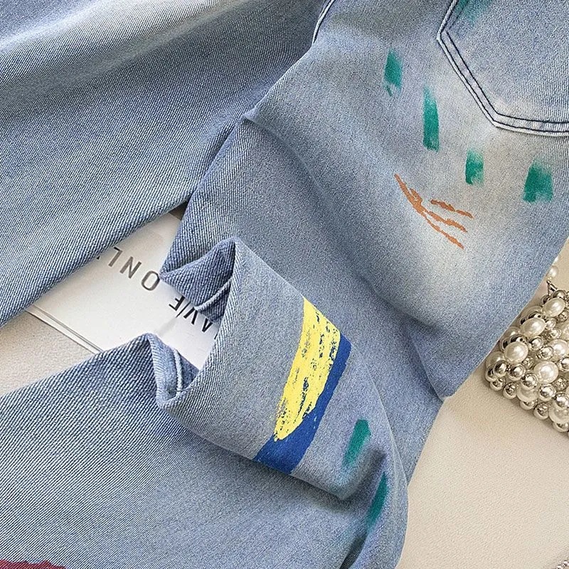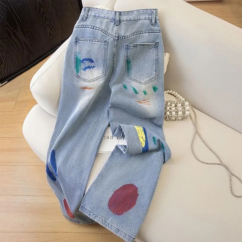 2025春秋新款涂鸦印花显瘦垂感直筒牛仔裤女高腰宽松显瘦阔腿裤子