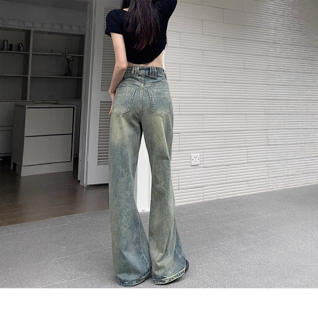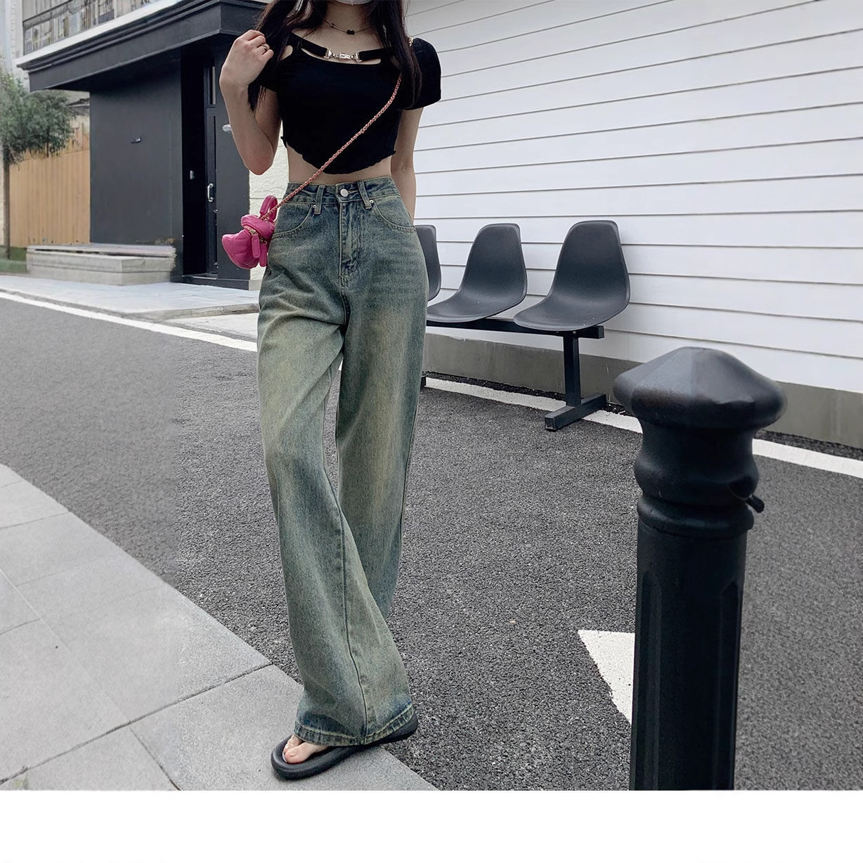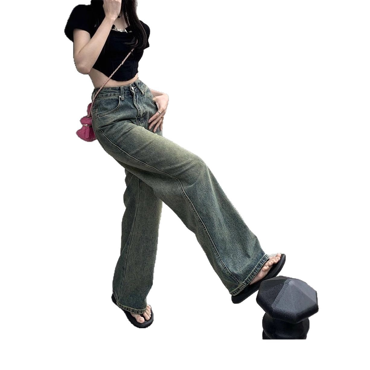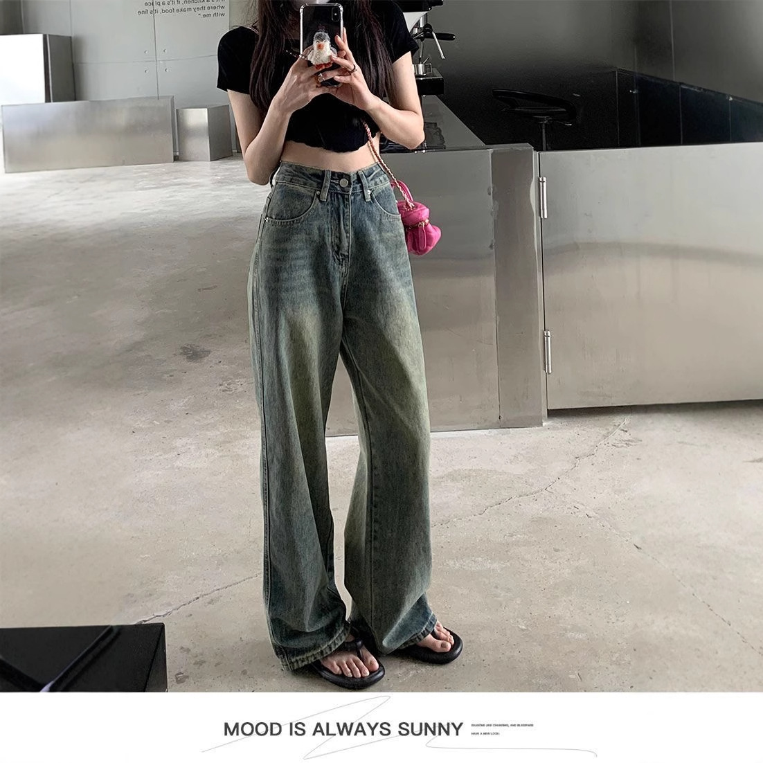 怀旧复古高腰直筒牛仔裤女梨形遮肉休闲美式宽松拖地阔腿长裤子秋