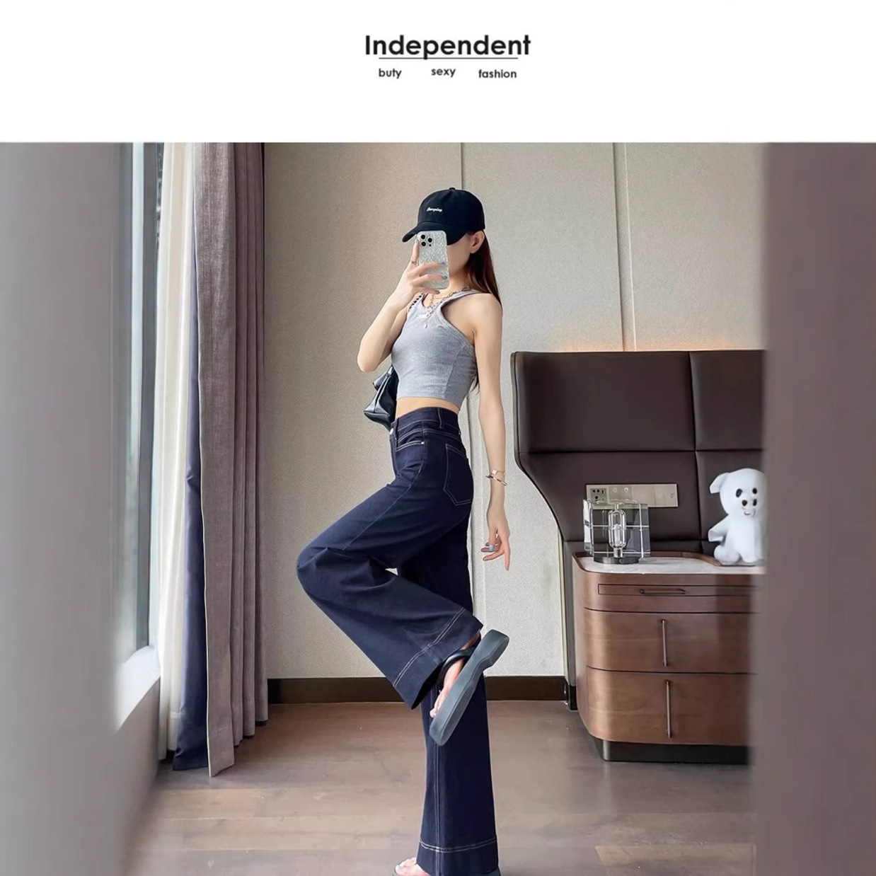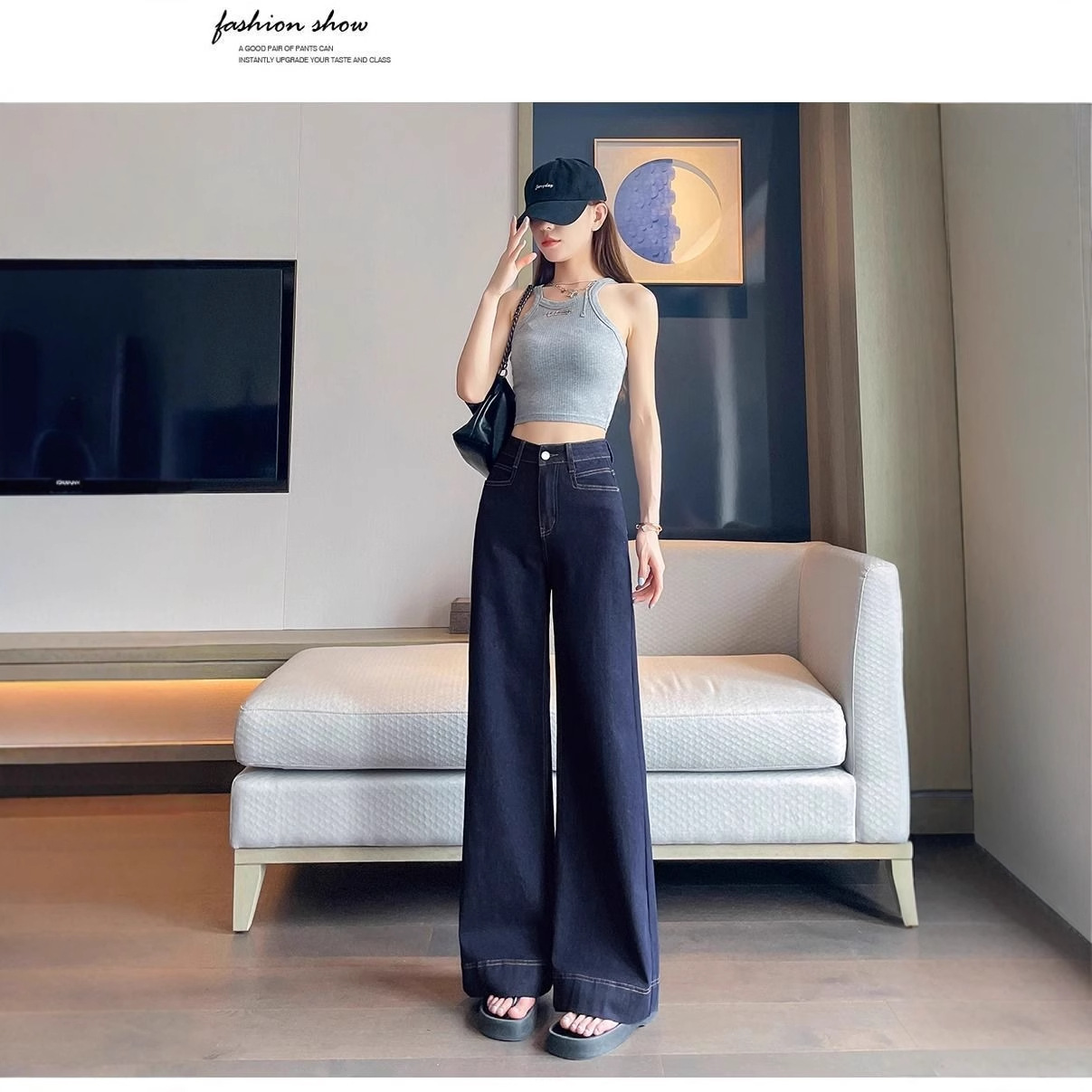 深蓝色直筒软牛仔裤女夏季薄款2025年新款高腰宽松原色大阔腿裤子