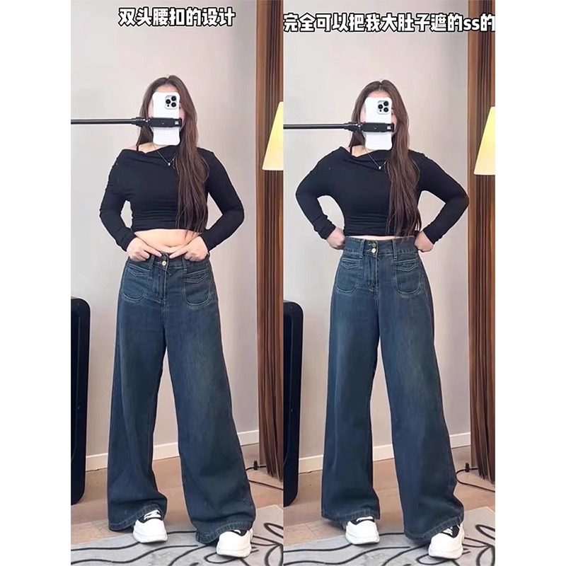 2025大码高级感复古牛仔裤女春季高腰阔腿裤胖MM遮肉显瘦拖地裤子