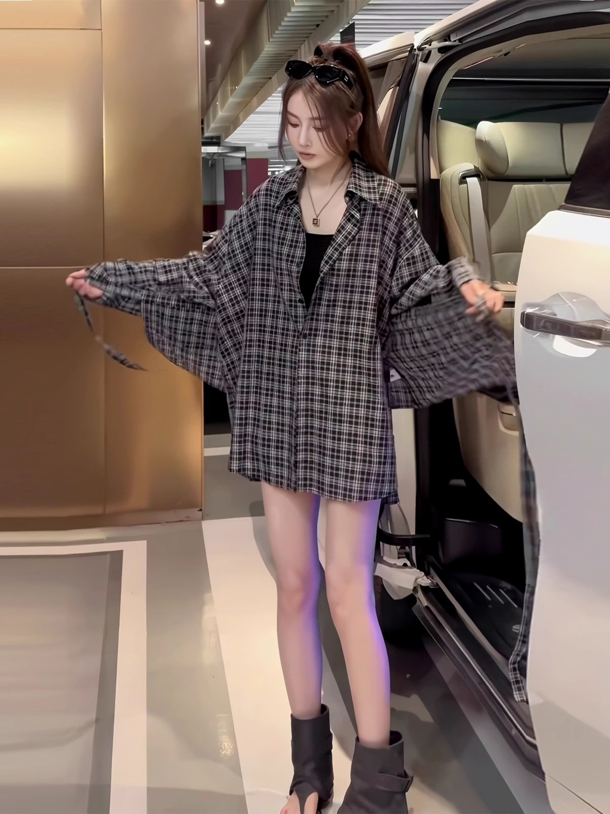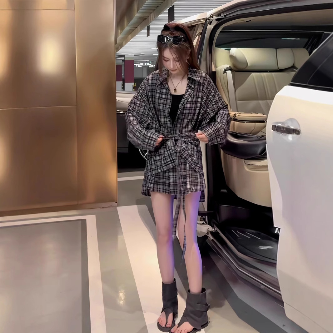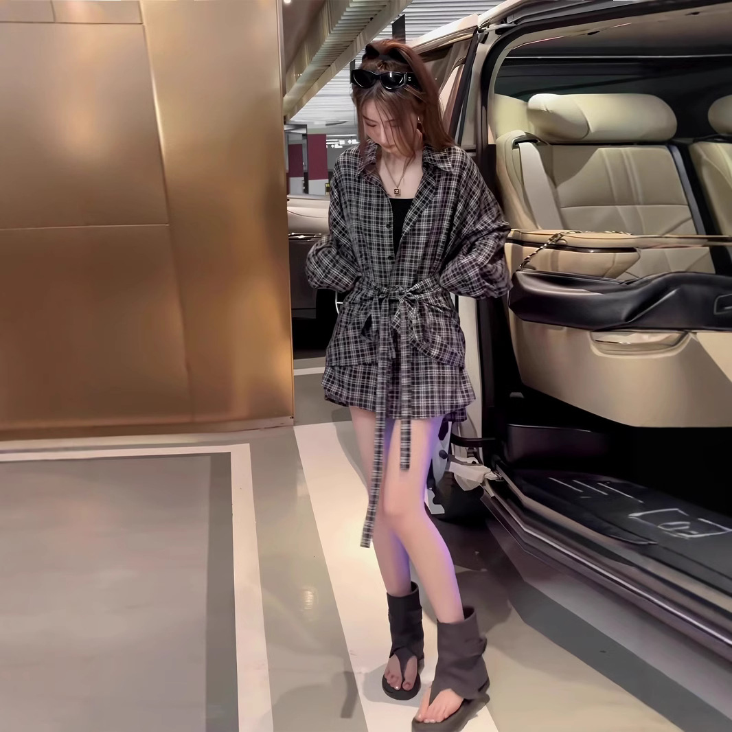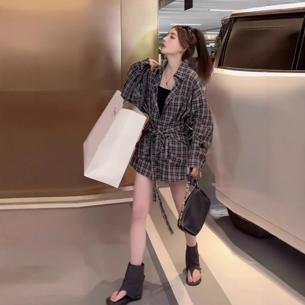 复古宽松慵懒风百搭黑白格衬衫2025新款韩版时尚显瘦防晒两件套女
