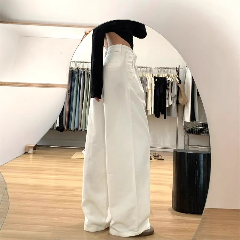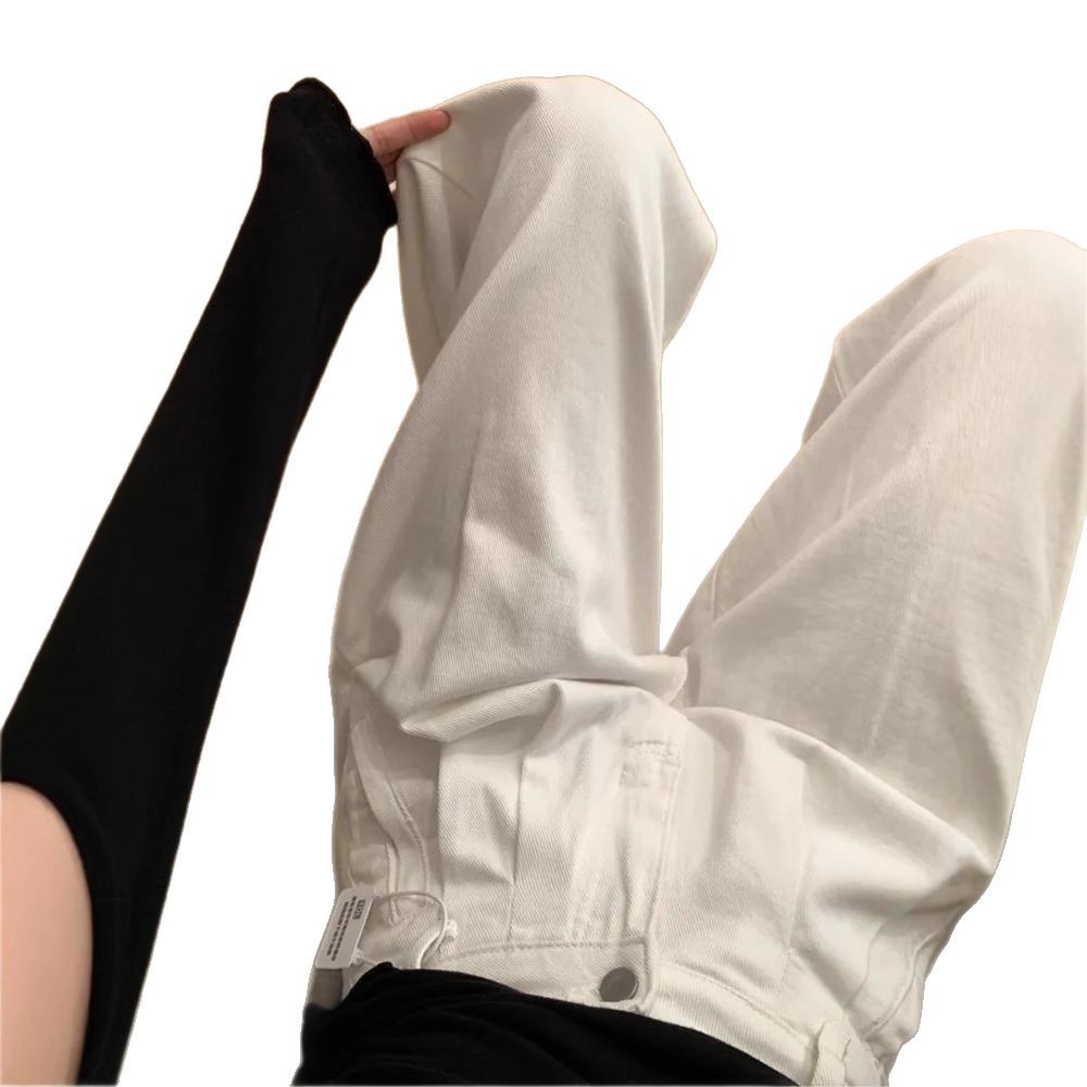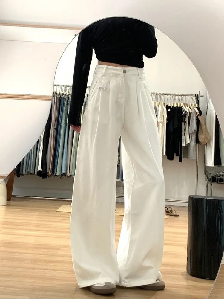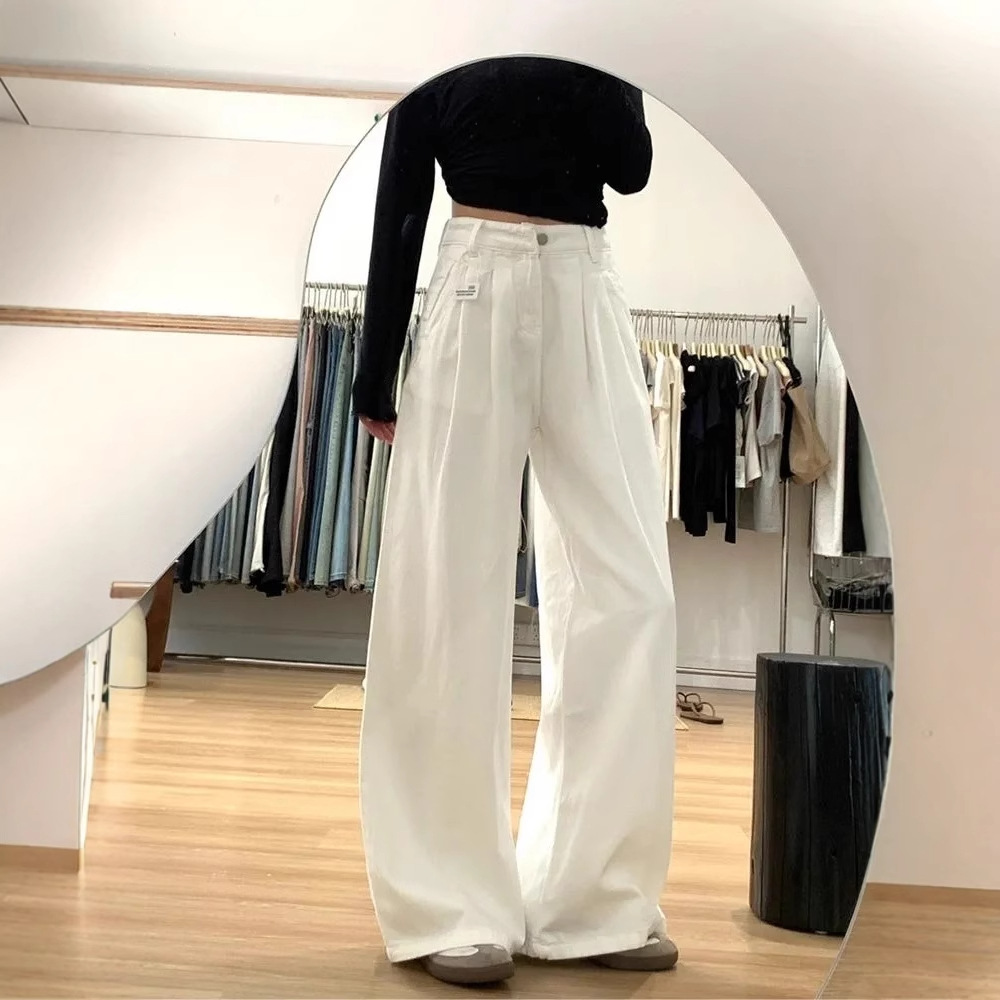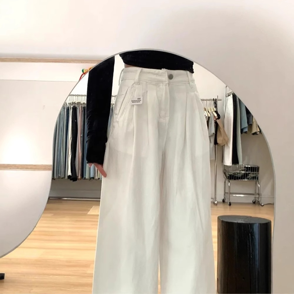 大码白色褶皱阔腿牛仔裤女春秋新款高腰胖mm宽松直筒垂感拖地裤子