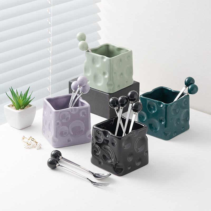 新款奶油风陶瓷果叉罐套装创意奶酪收纳罐高颜值圆珠水果叉勺