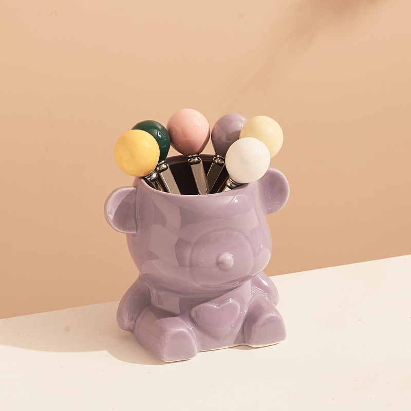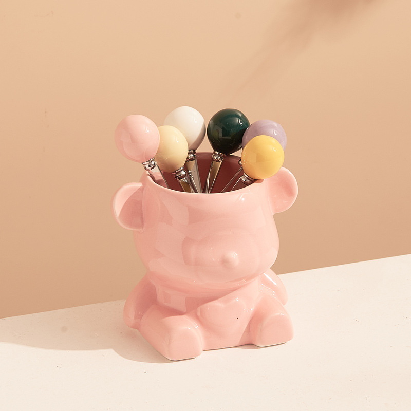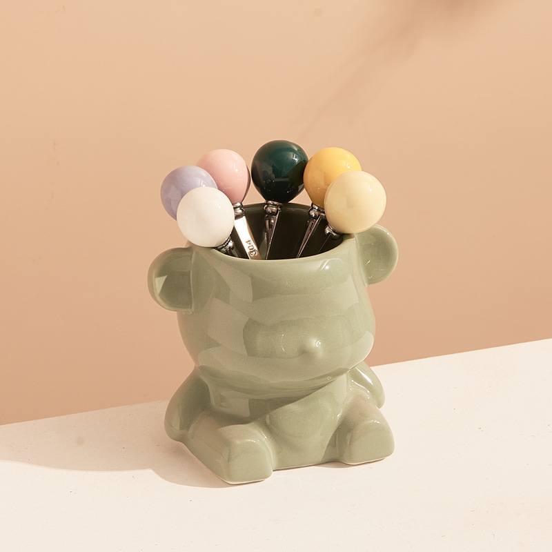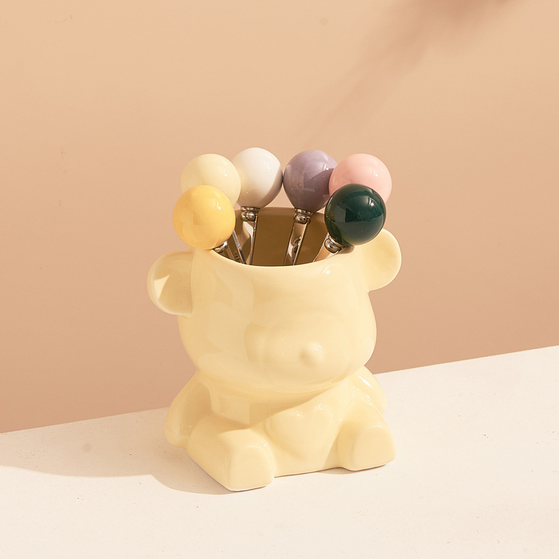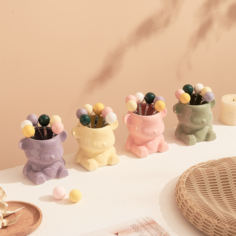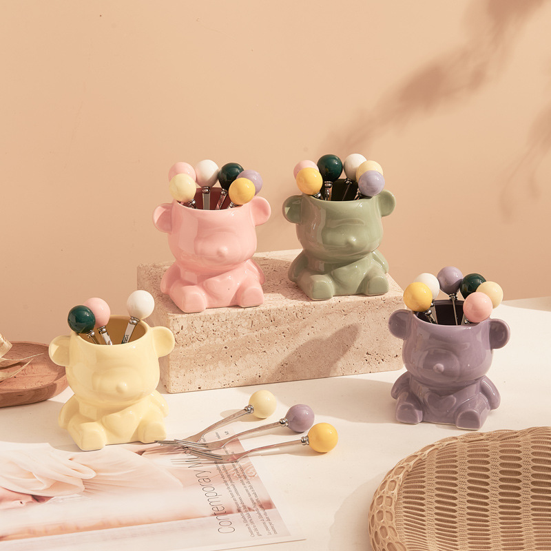 新款奶油风陶瓷小熊挂果叉罐套装高颜值家居好物下午茶水果叉勺子