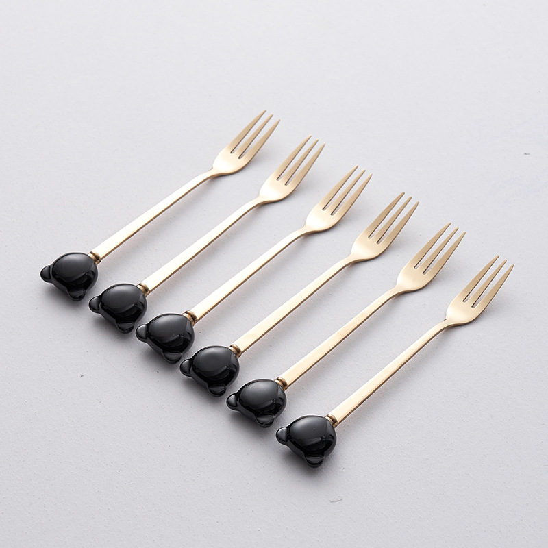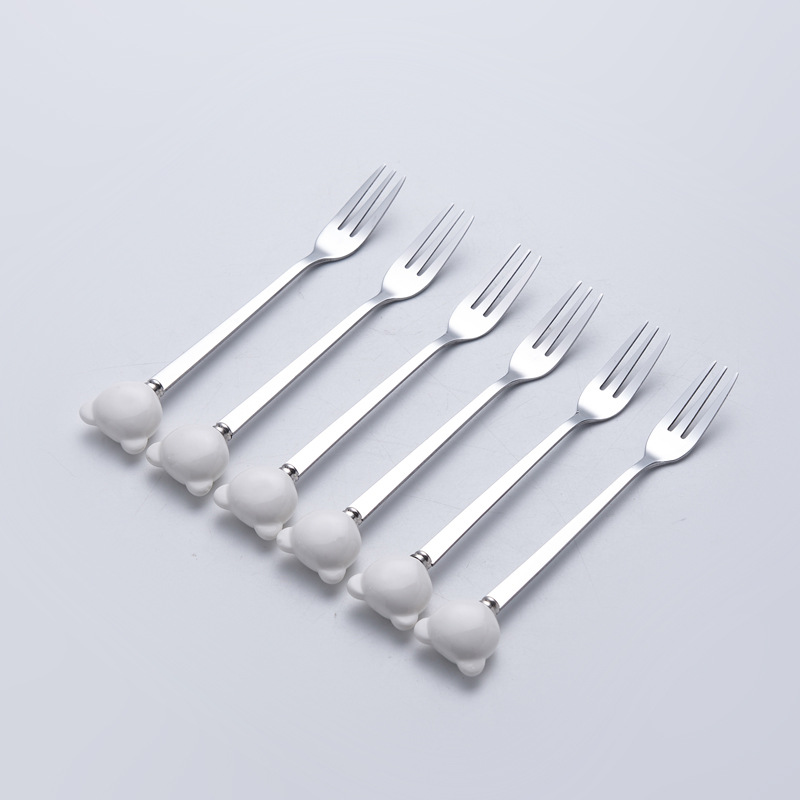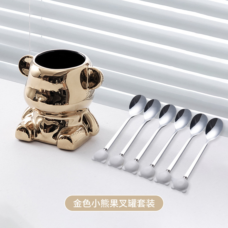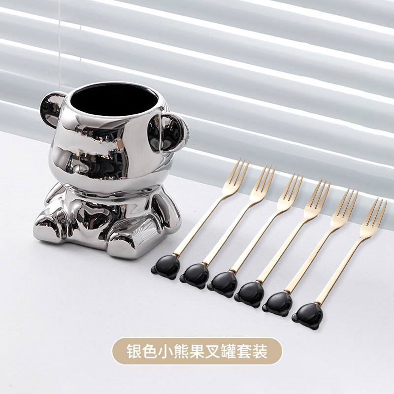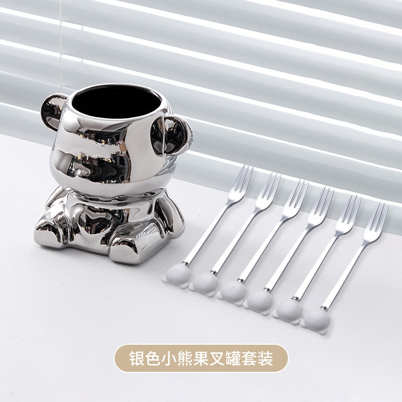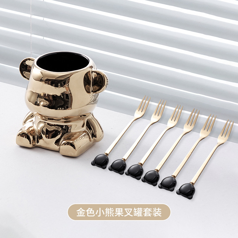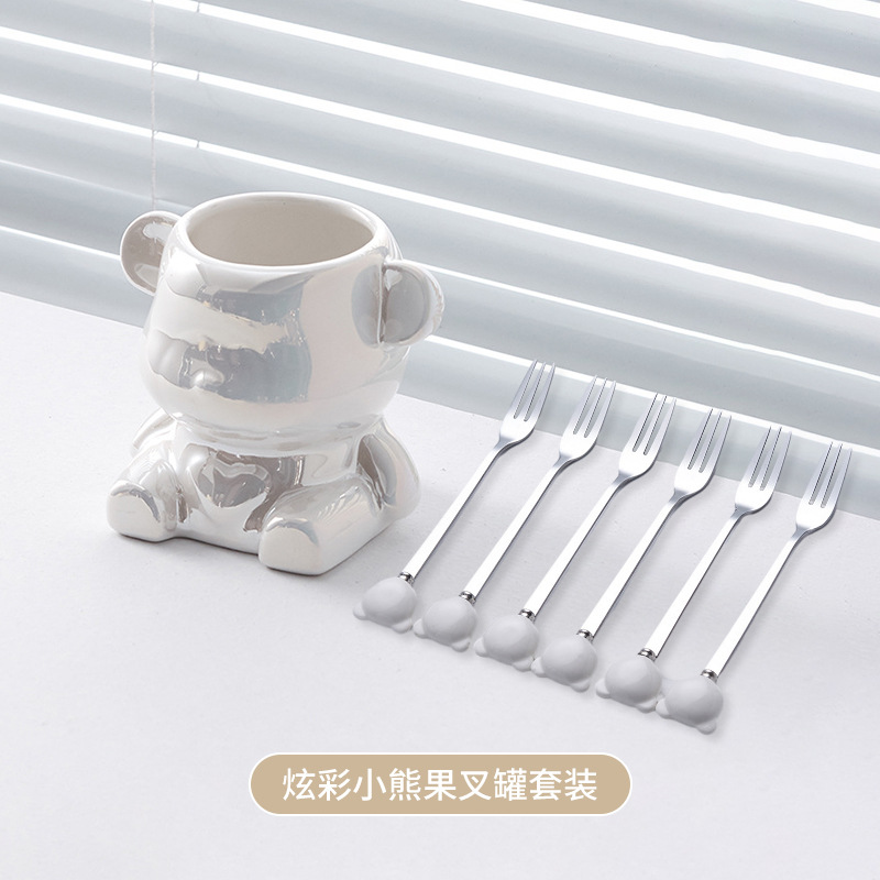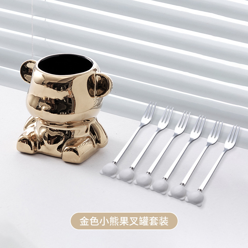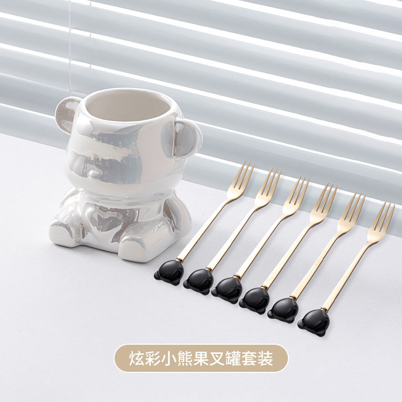 陶瓷小熊不锈钢水果叉套装高颜值水果签家用轻奢叉勺水果叉子
