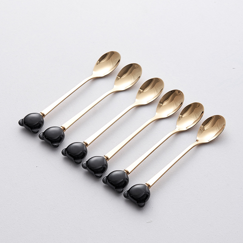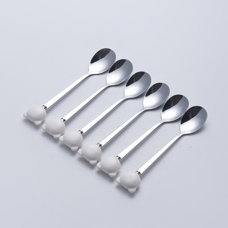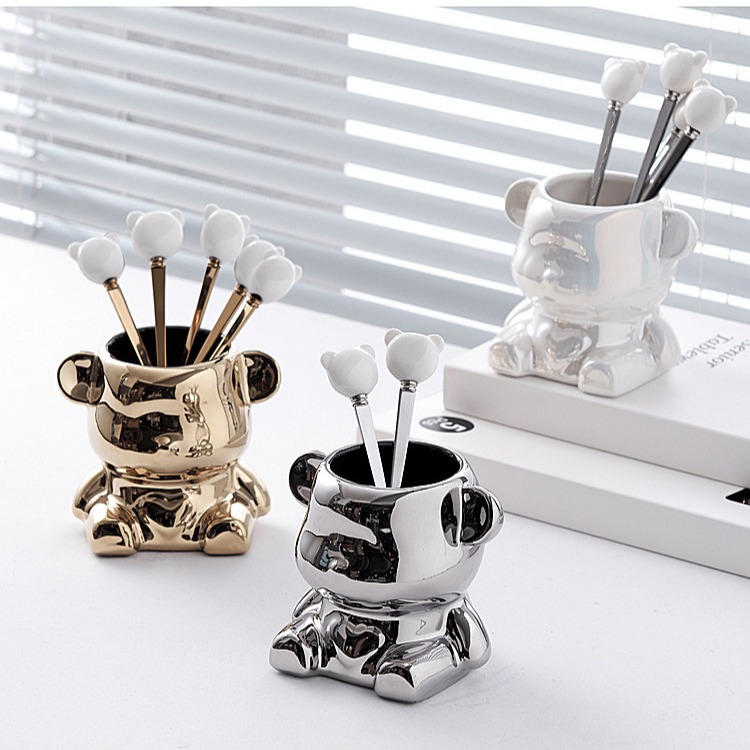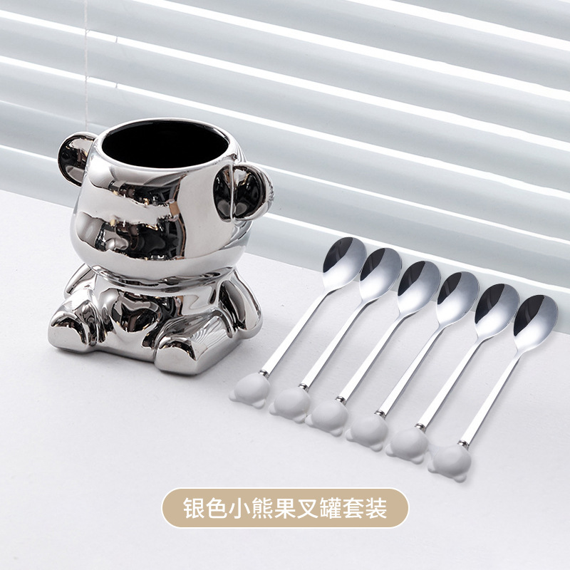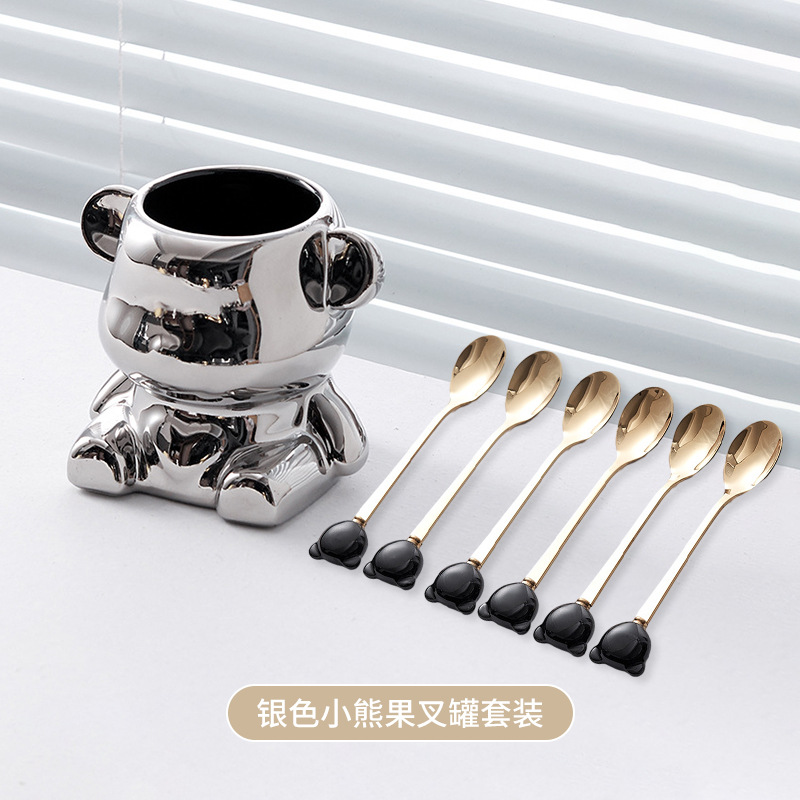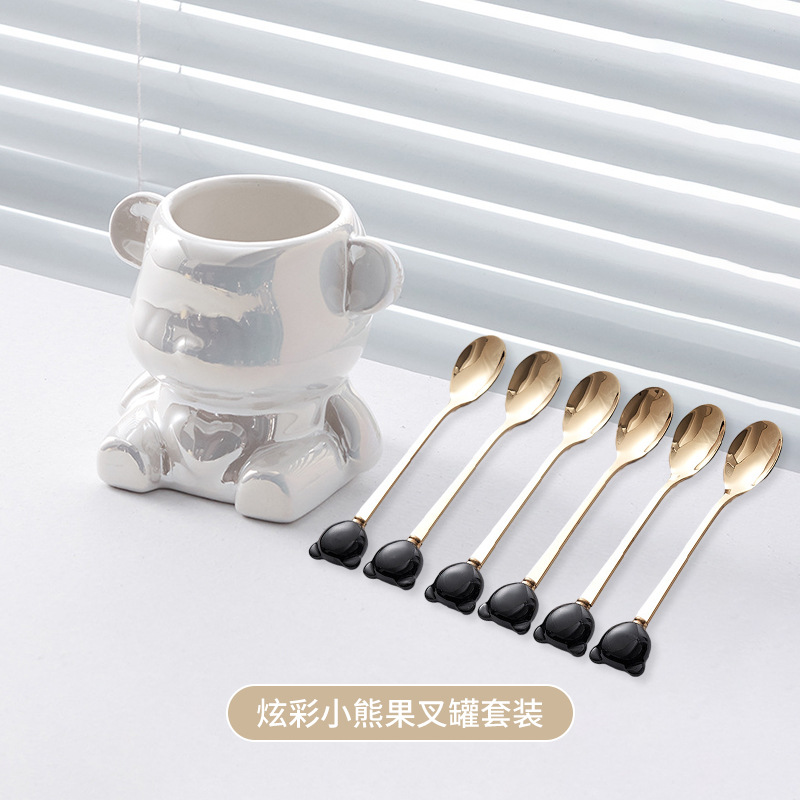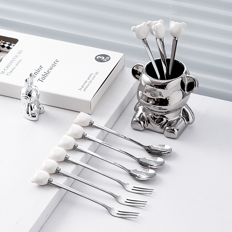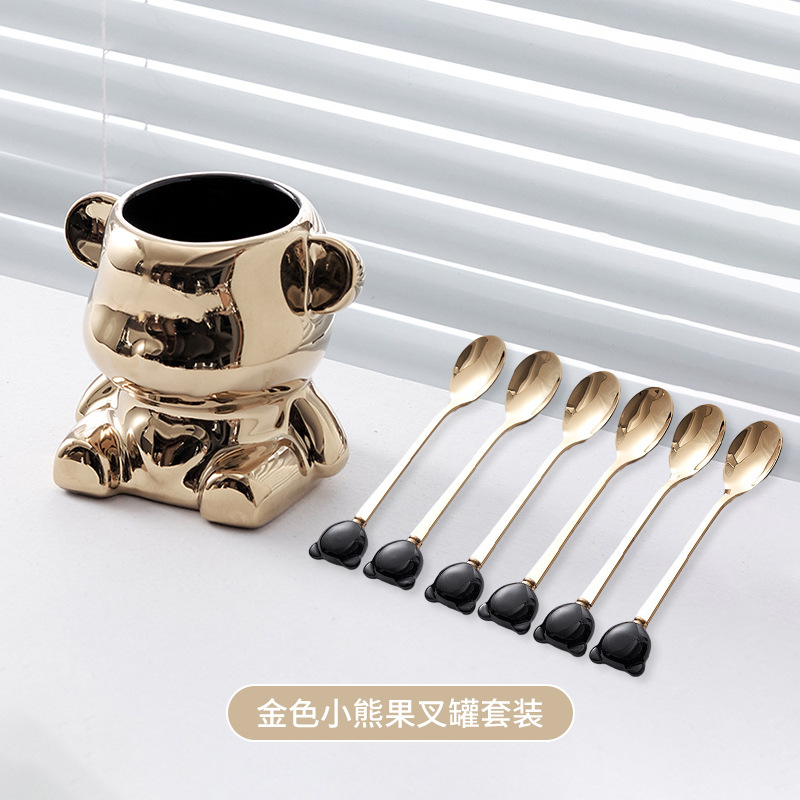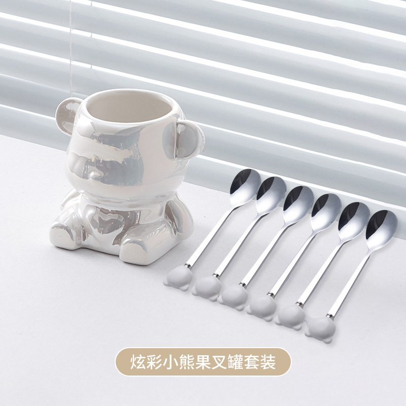 陶瓷小熊不锈钢水果叉套装高颜值水果签家用轻奢叉勺水果叉子