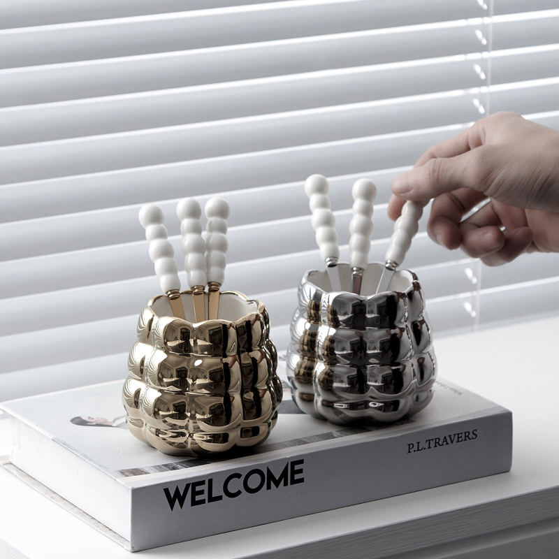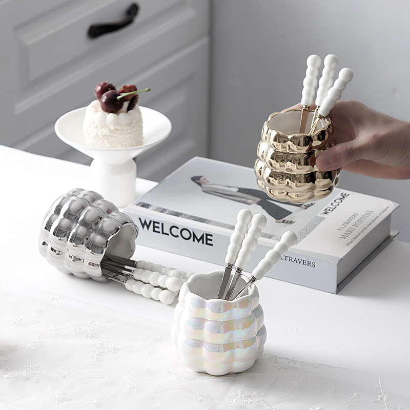 轻奢ins珍珠水果签陶瓷收纳罐创意叉勺家用不锈钢水果叉套装