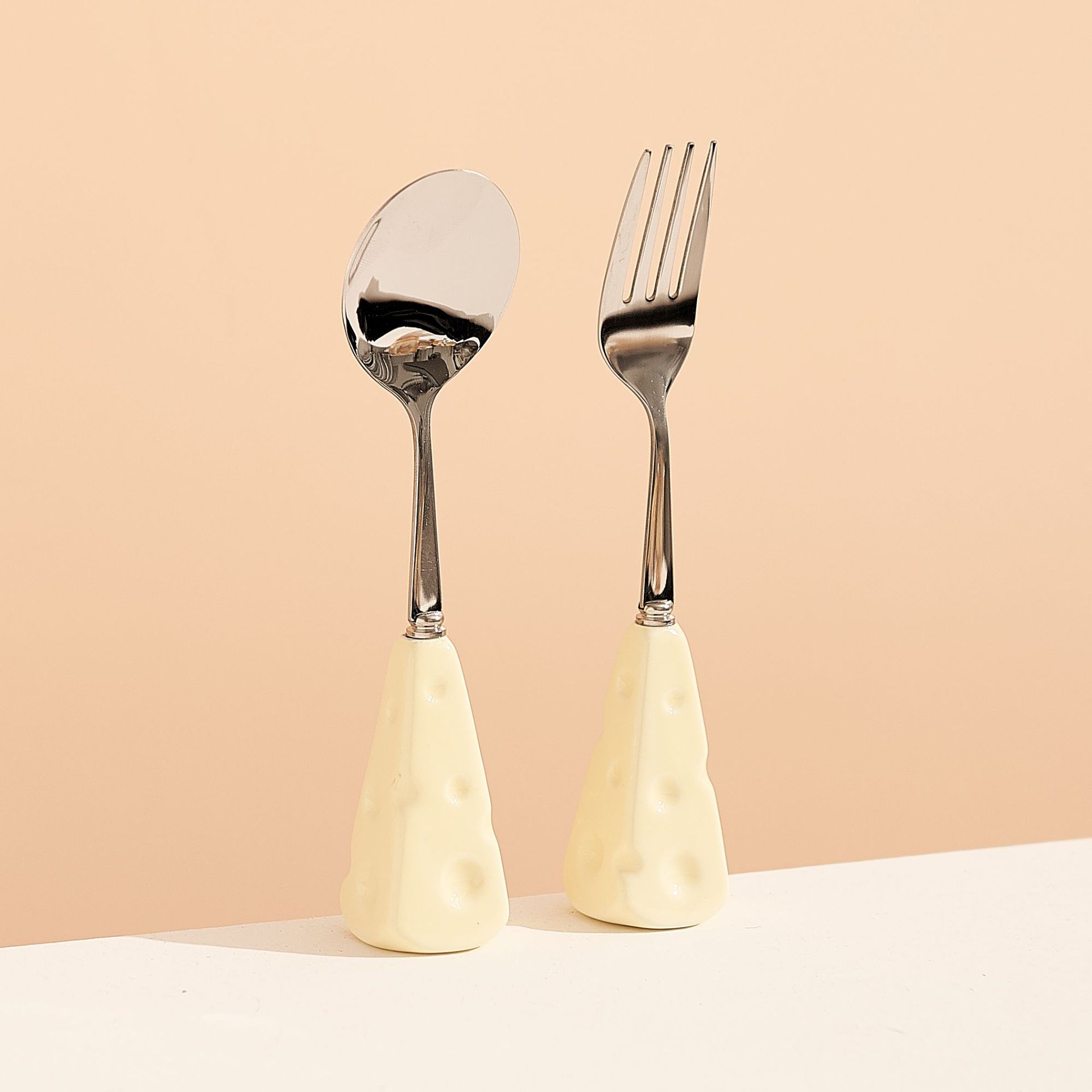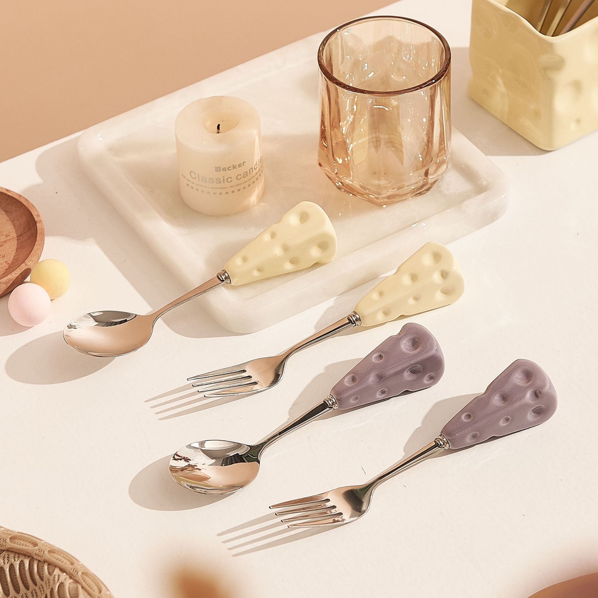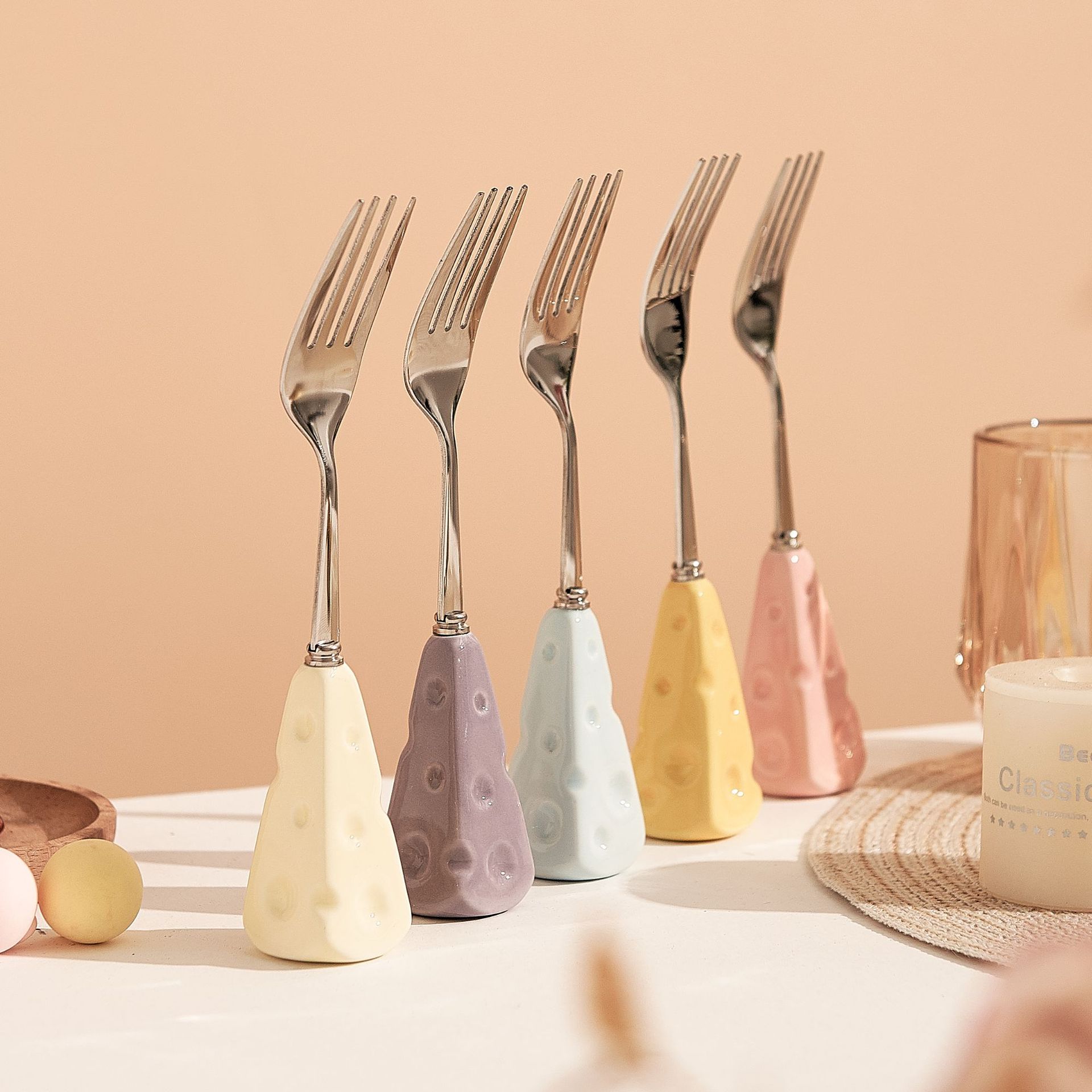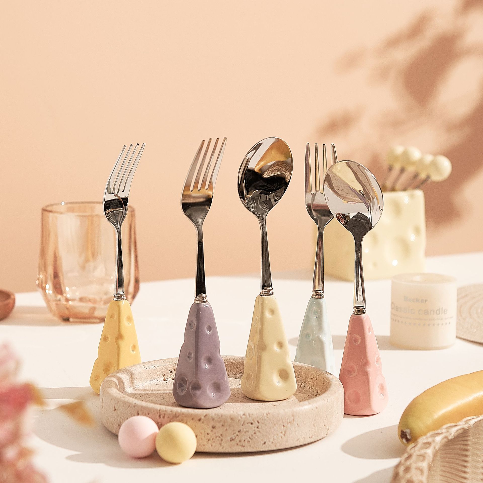 ins风高级感奶酪不锈钢叉勺耐高温陶瓷手柄勺子创意儿童餐具叉子
