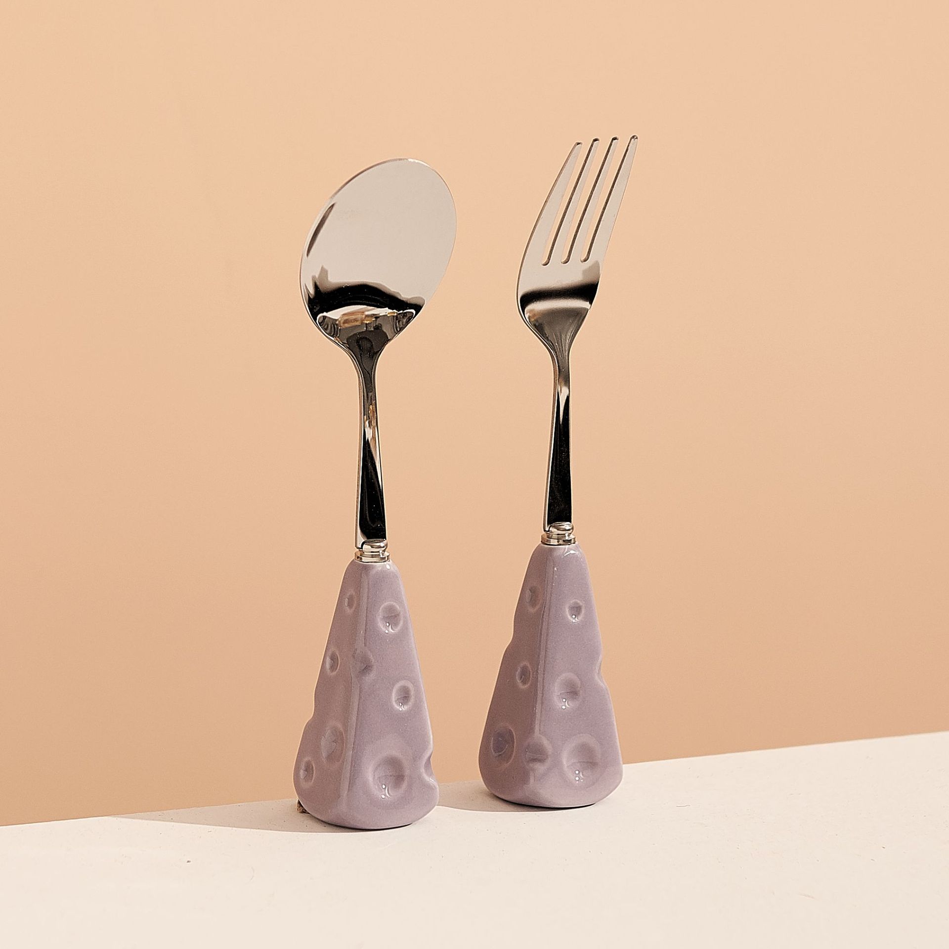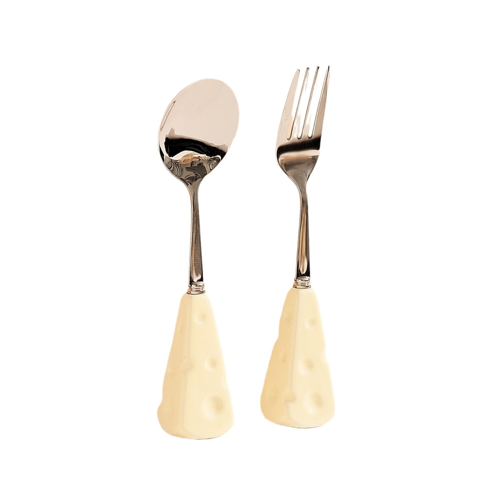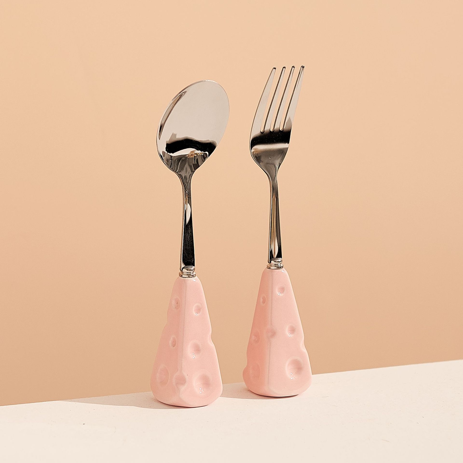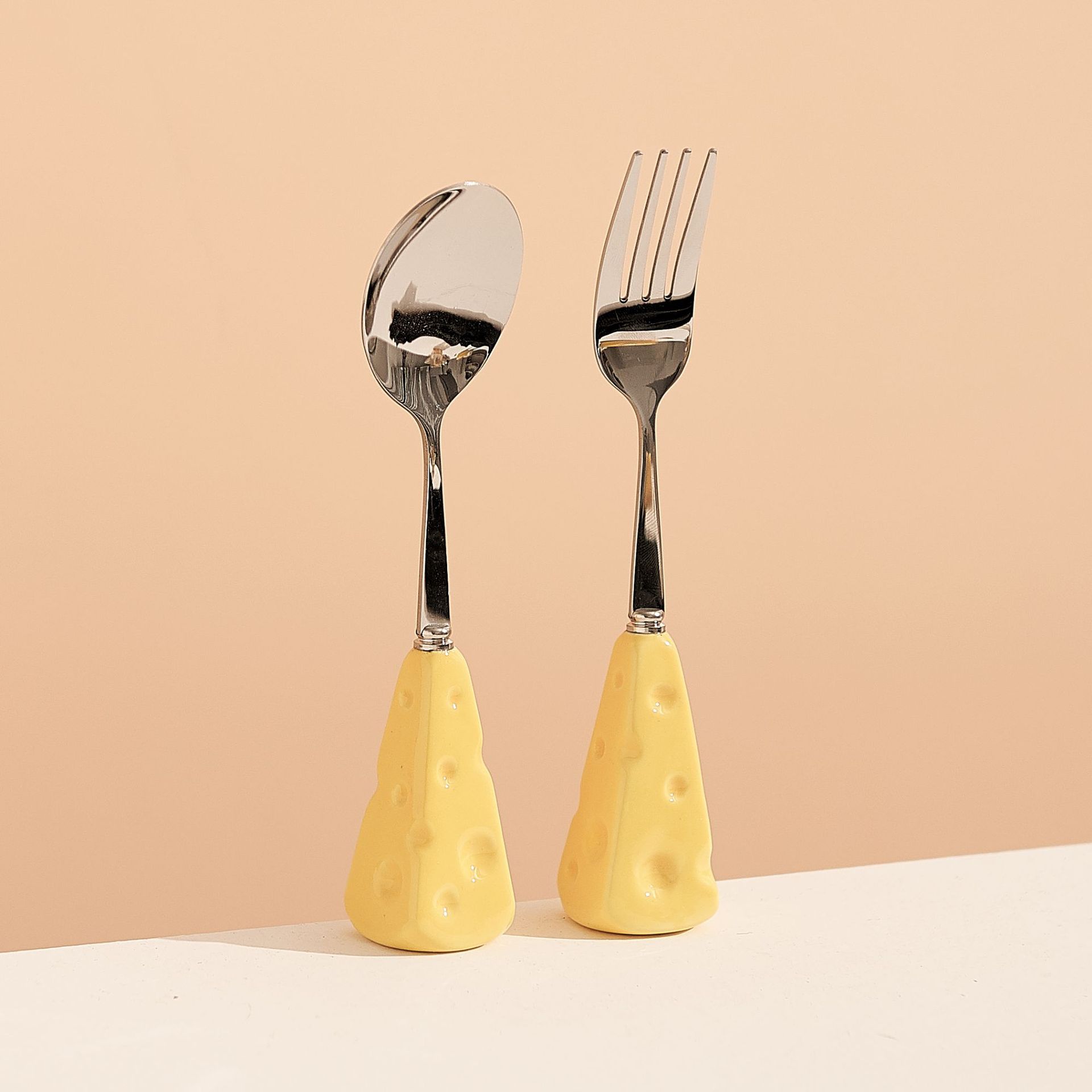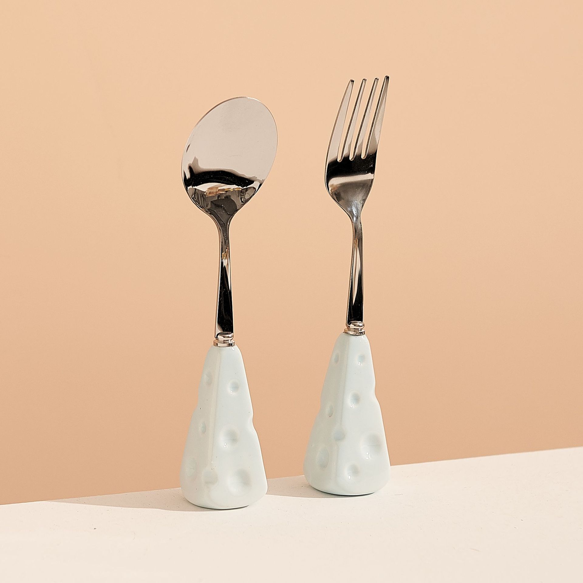 ins风高级感奶酪不锈钢叉勺耐高温陶瓷手柄勺子创意儿童餐具叉子