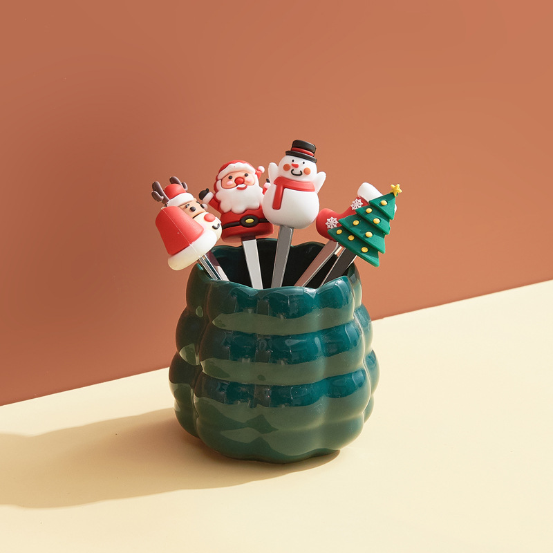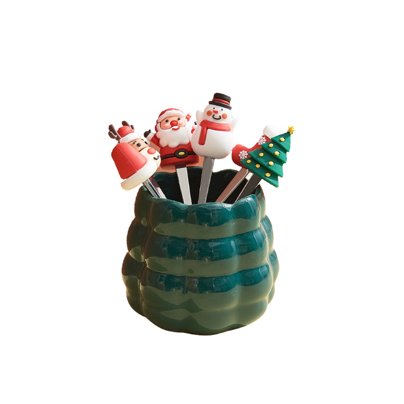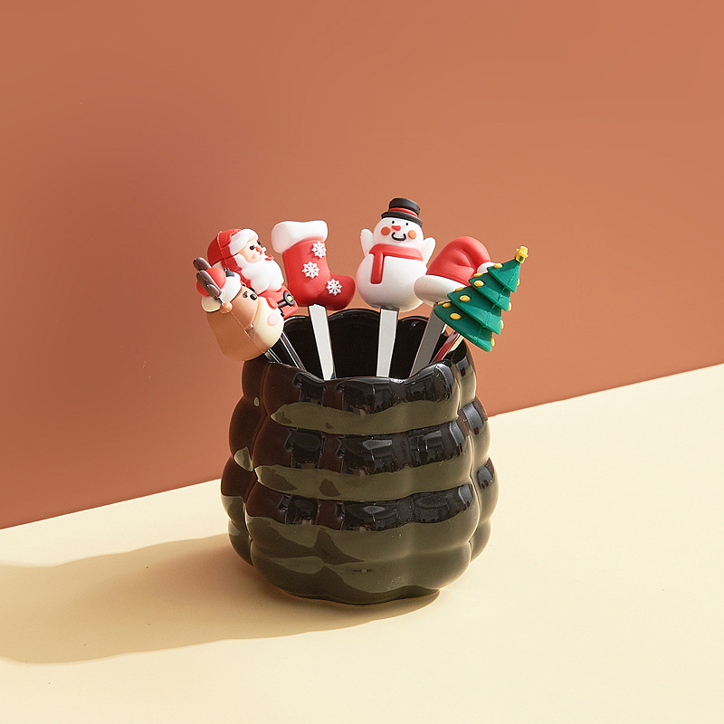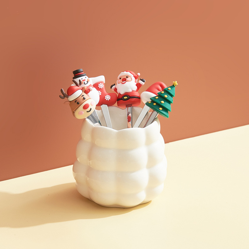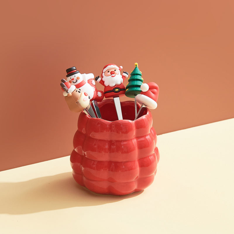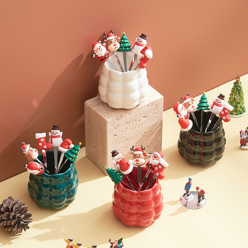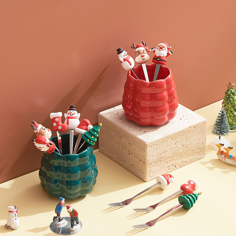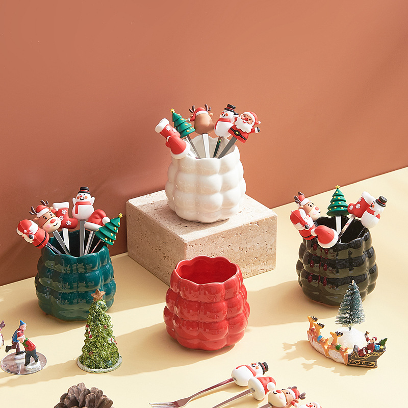 跨境创意圣诞水果叉套装家用桌面摆件高颜值陶瓷叉勺收纳罐乔迁礼