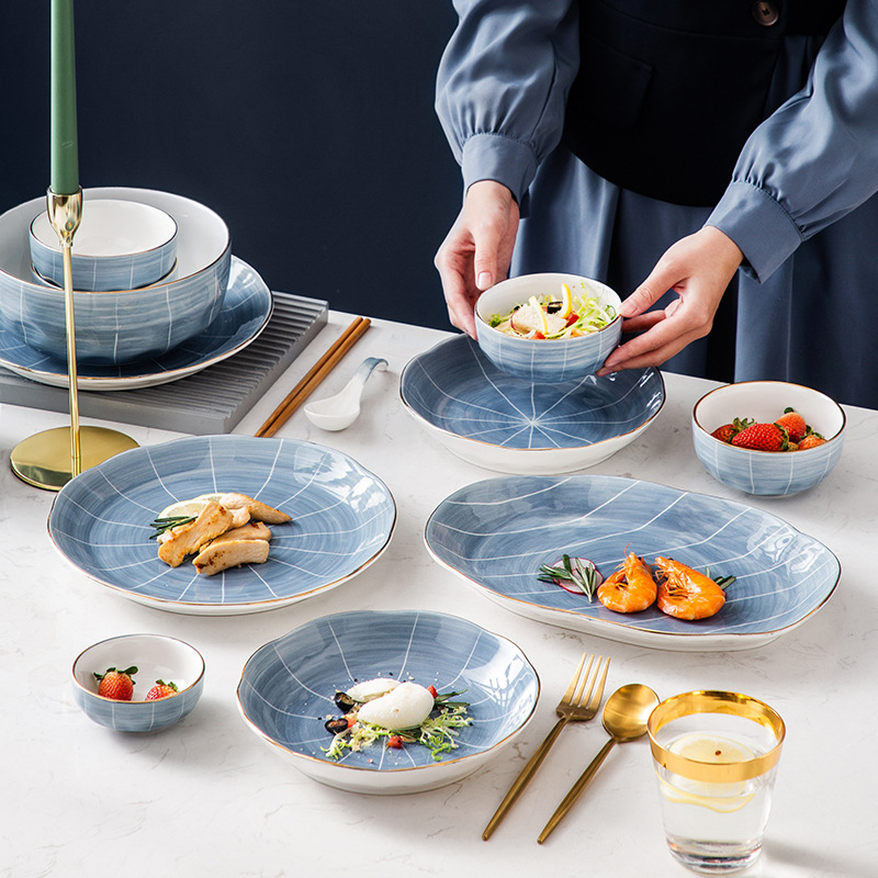 ins北欧轻奢高档金边陶瓷餐具碗碟套装饭碗菜盘组合家用菜盘汤碗