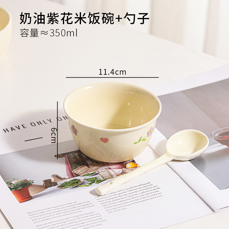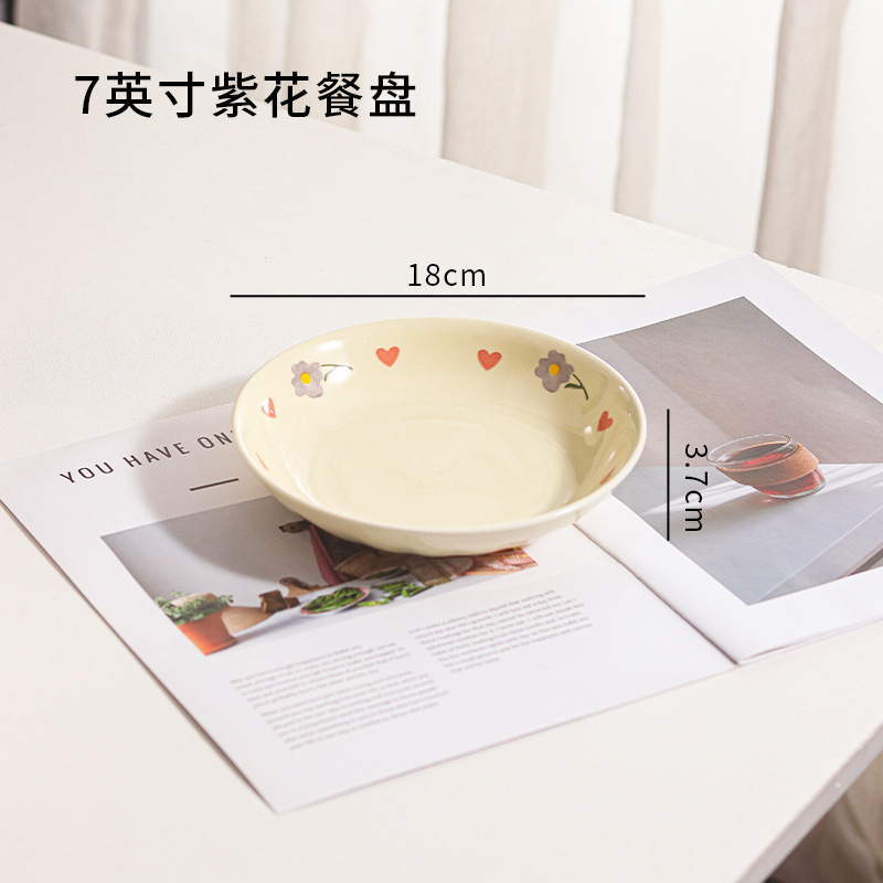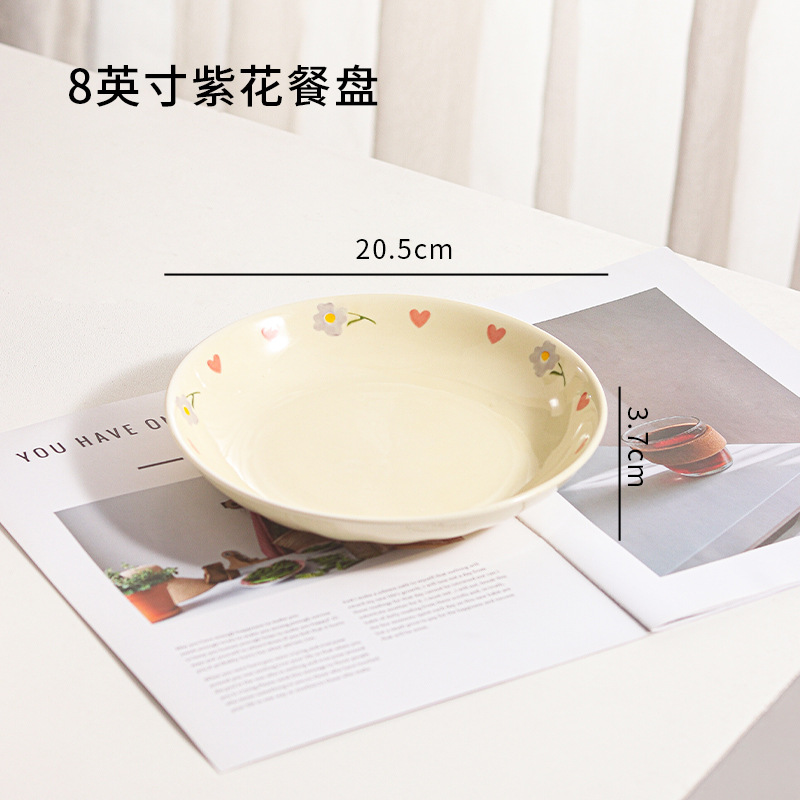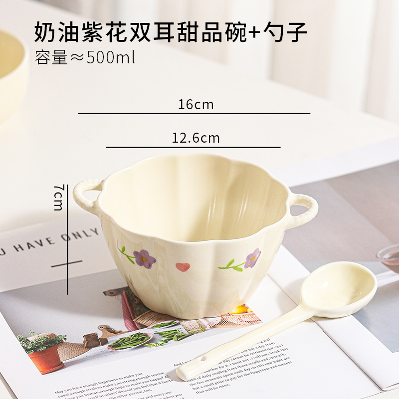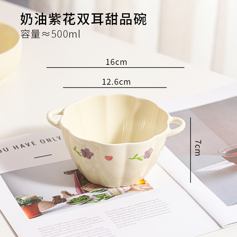 紫藤花奶油风ins盘碗套装家用饭碗陶瓷盘子碗双耳面碗大汤碗配勺