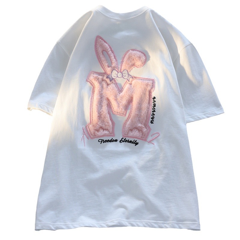 美式复古毛巾绣兔子纯棉短袖t恤女宽松原宿风设计感小众情侣上衣
