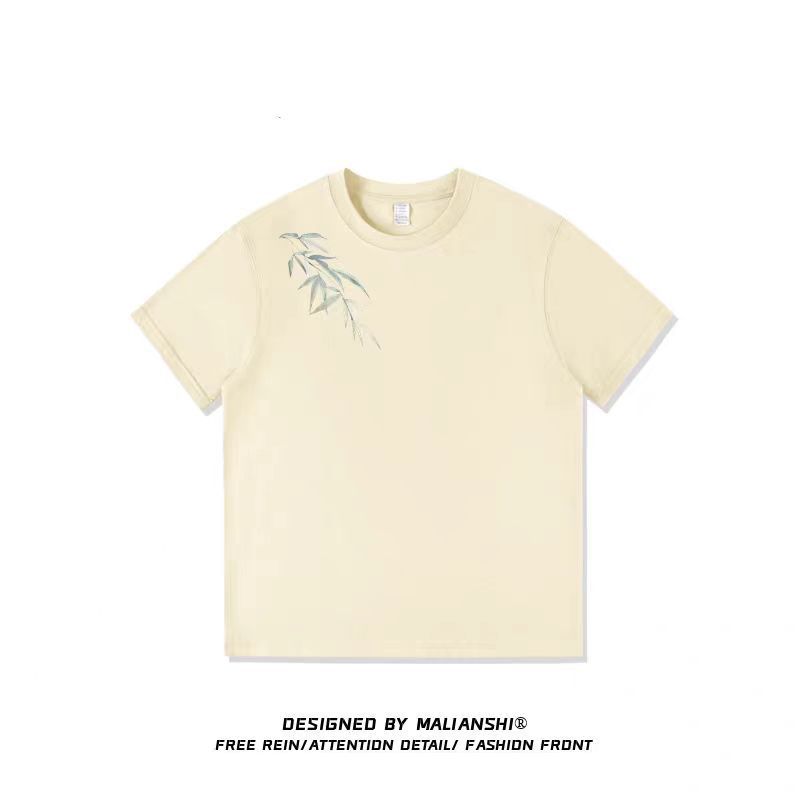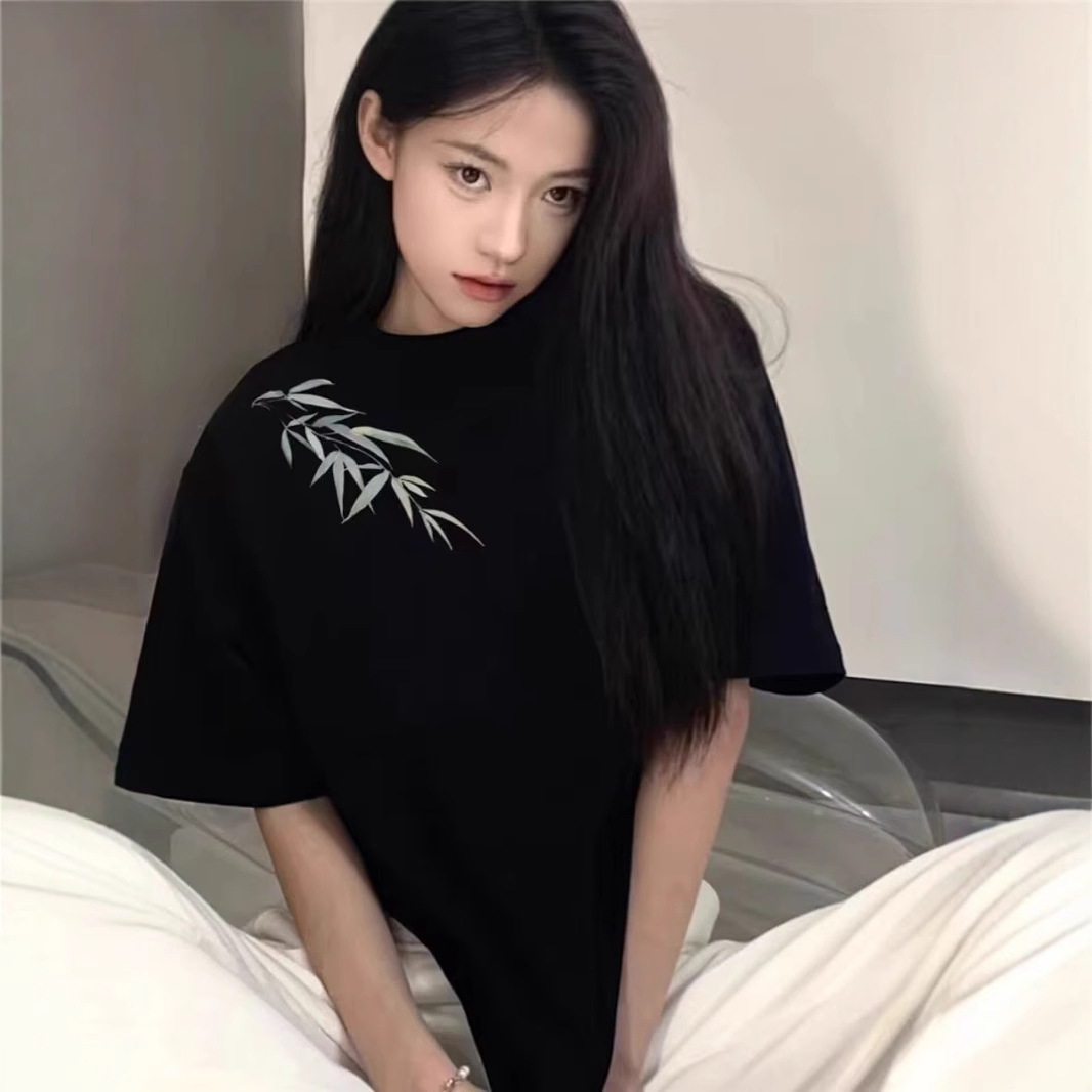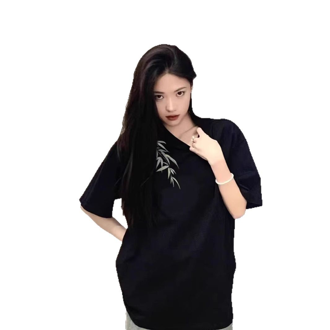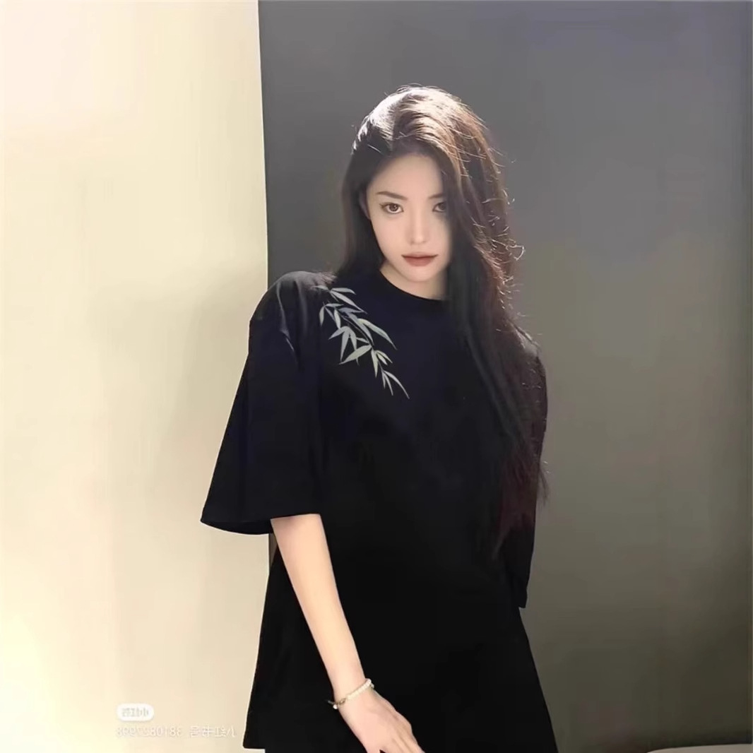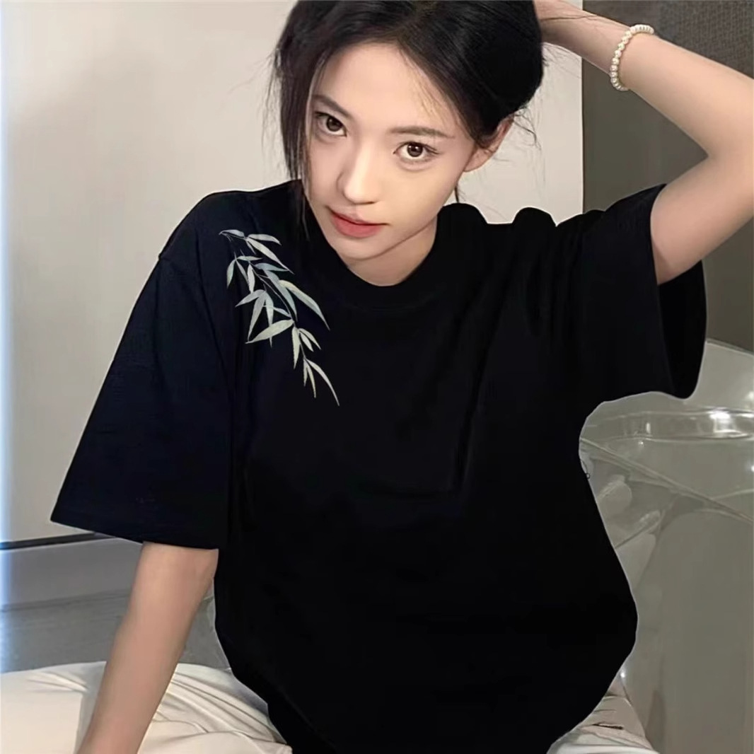 夏季纯棉正肩设计感小众短袖t恤女2025新款宽松潮牌高街树叶上衣