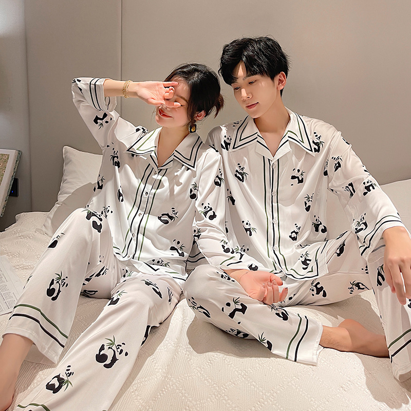 熊猫睡衣女春秋新款仿真丝两件套 长袖长裤子薄款女士家居服套装