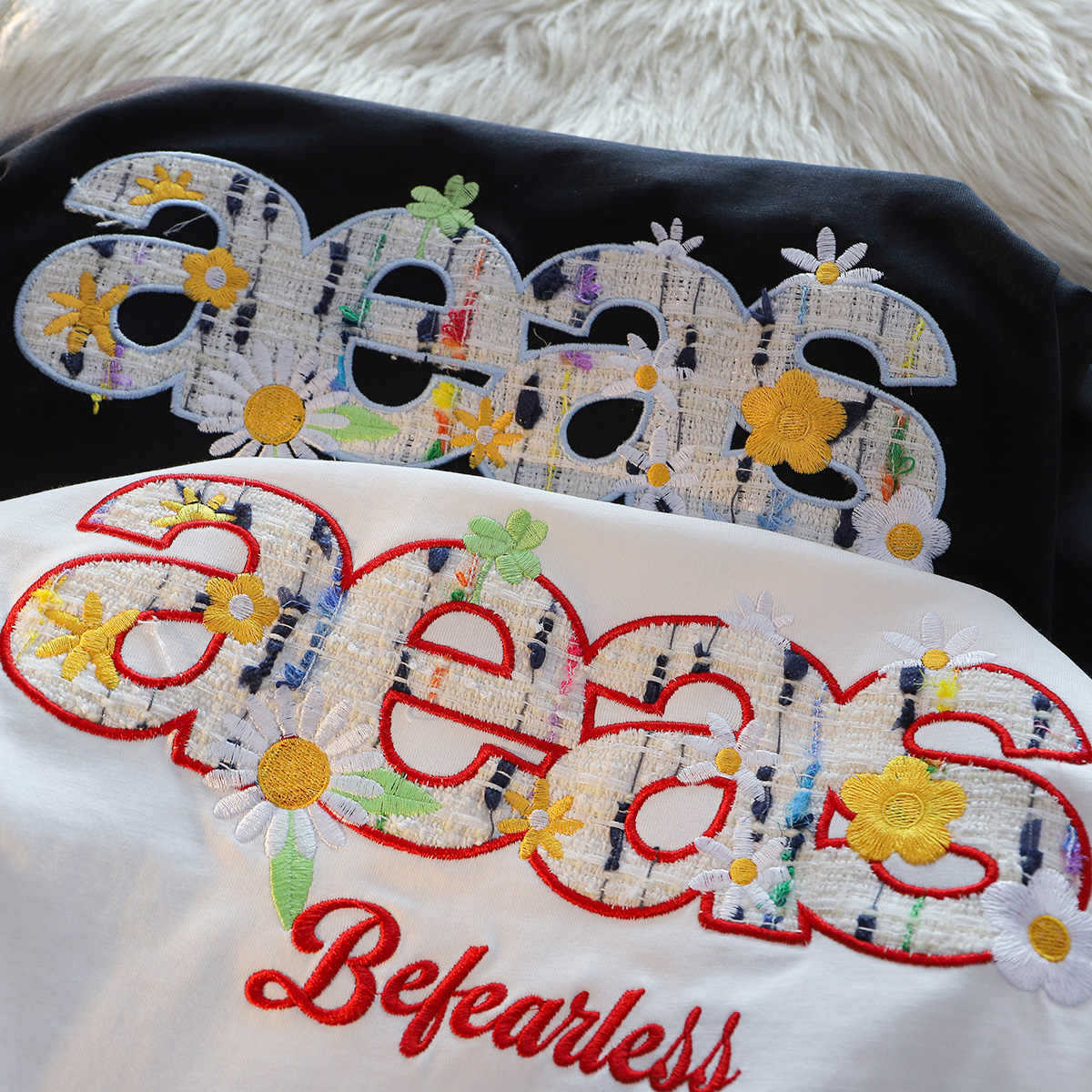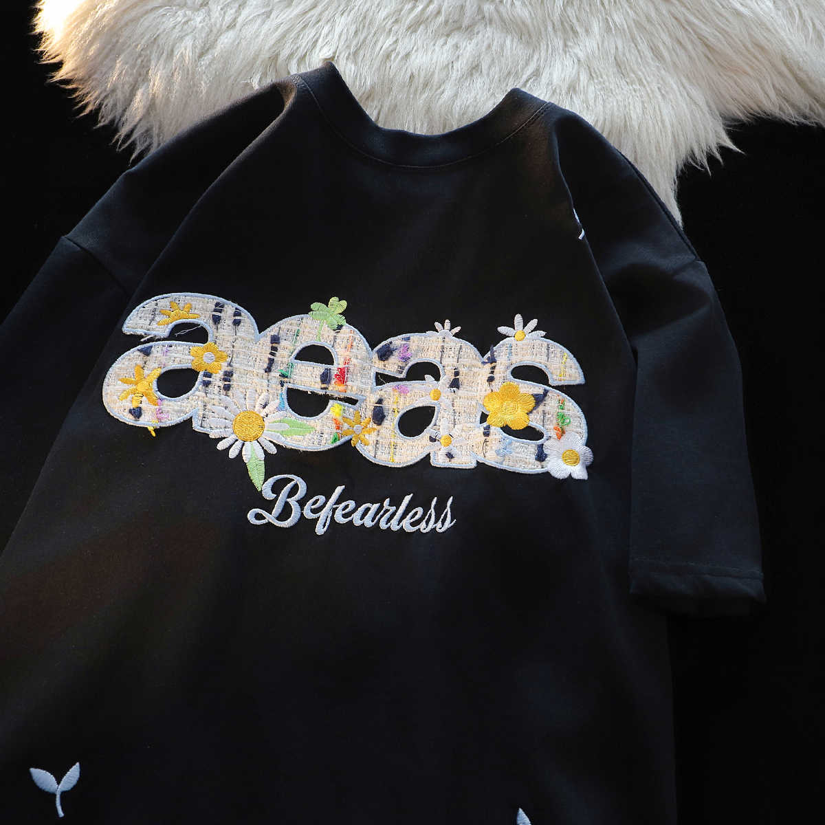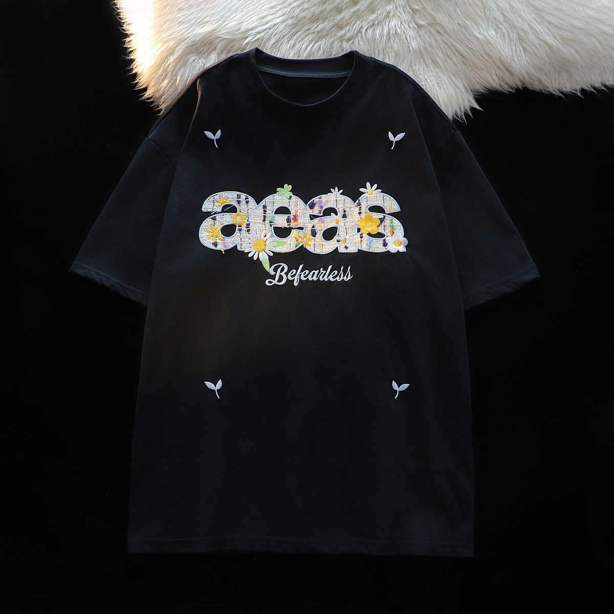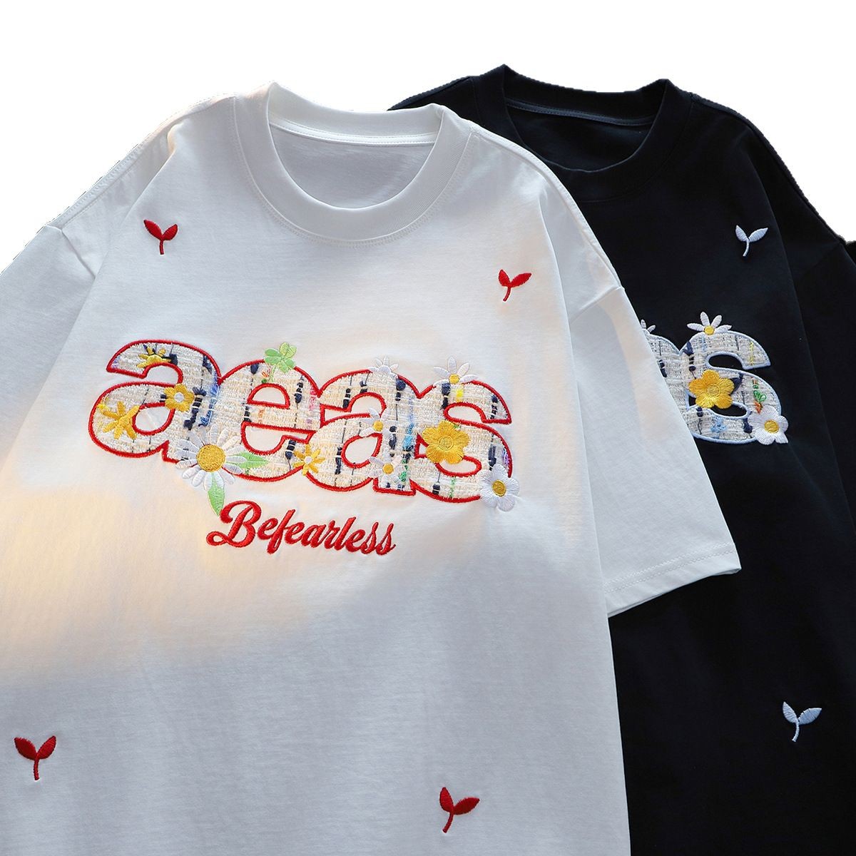 美式重磅刺绣花朵短袖t恤男女纯棉夏情侣宽松半袖hiphop潮牌上衣