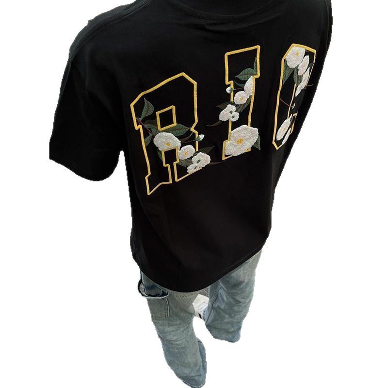 美式复古山茶花毛巾绣纯棉短袖t恤女夏季新款宽松ins潮牌小众上衣
