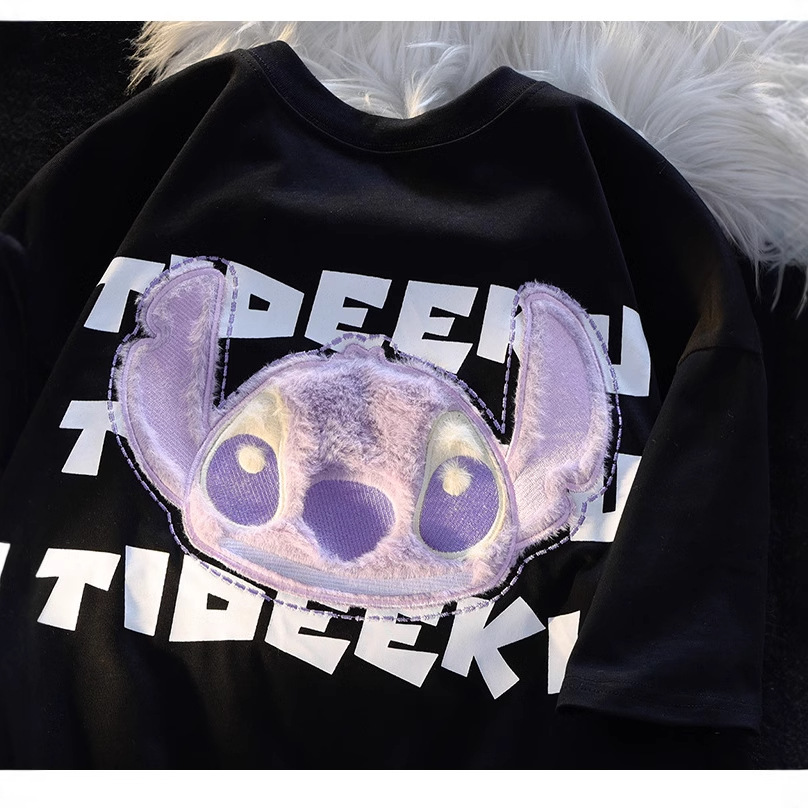 美式短袖男女植绒卡通毛绒兔子刺绣宽松inst恤小众百搭情侣上衣