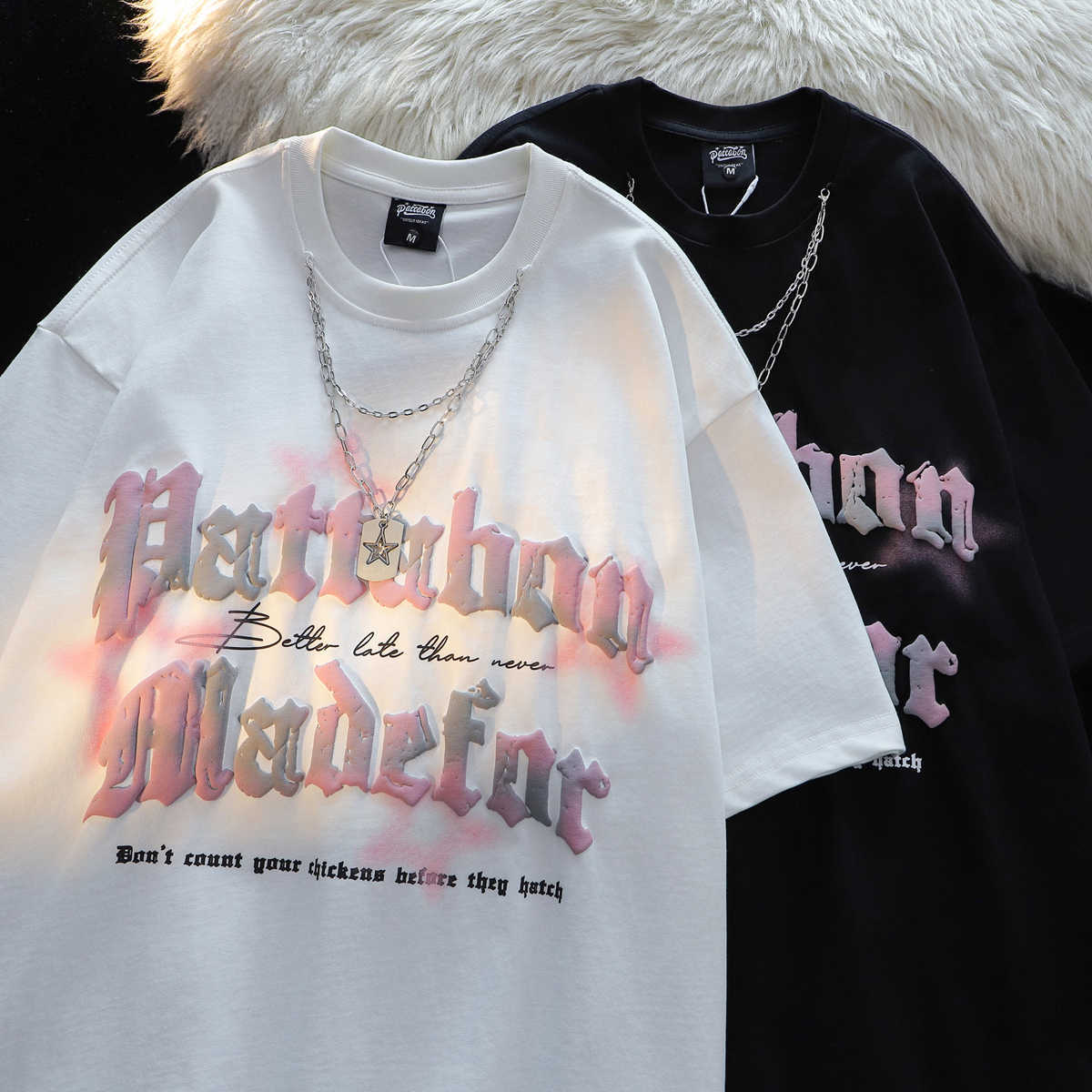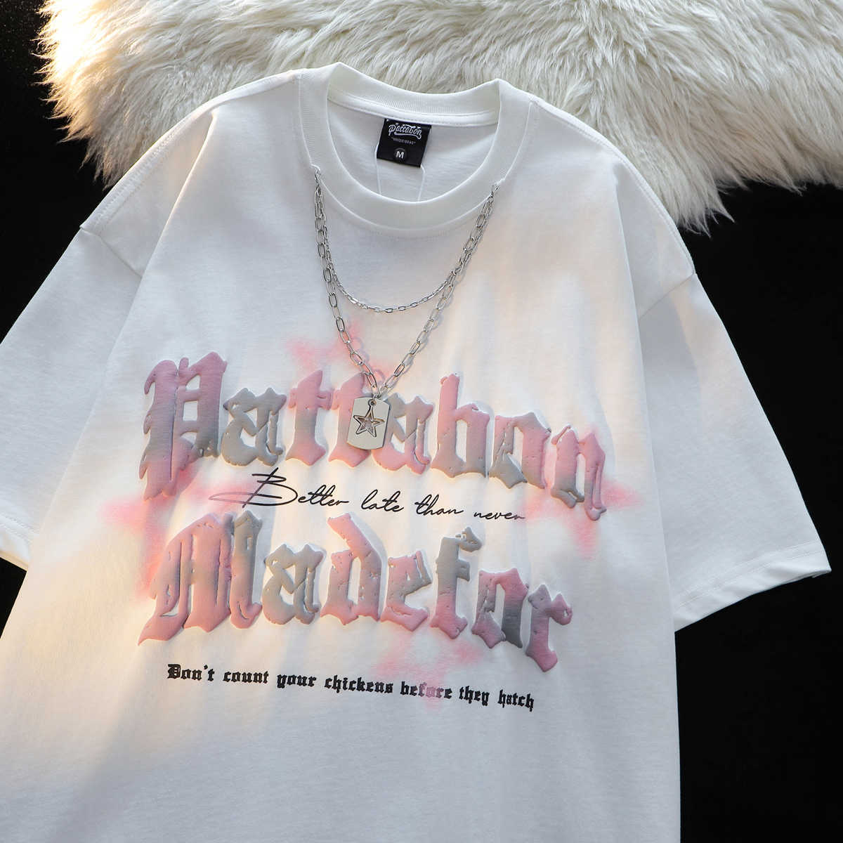 美式潮牌印花字母项链t恤女情侣短袖夏季宽松街头半袖hiphop上衣