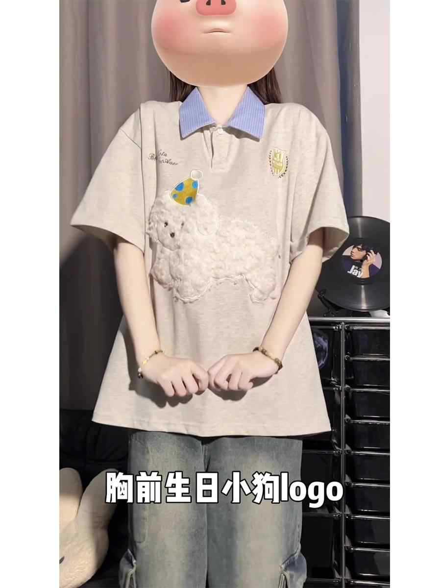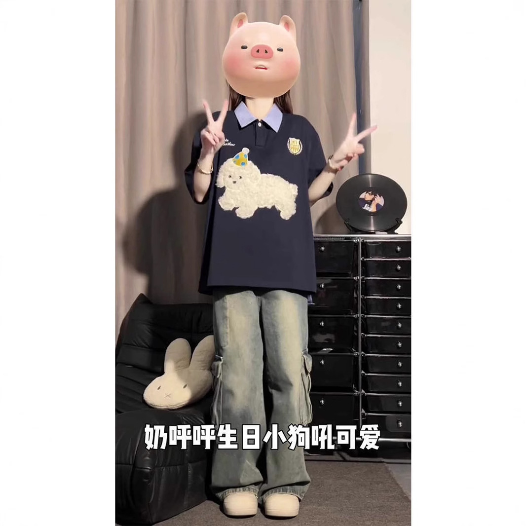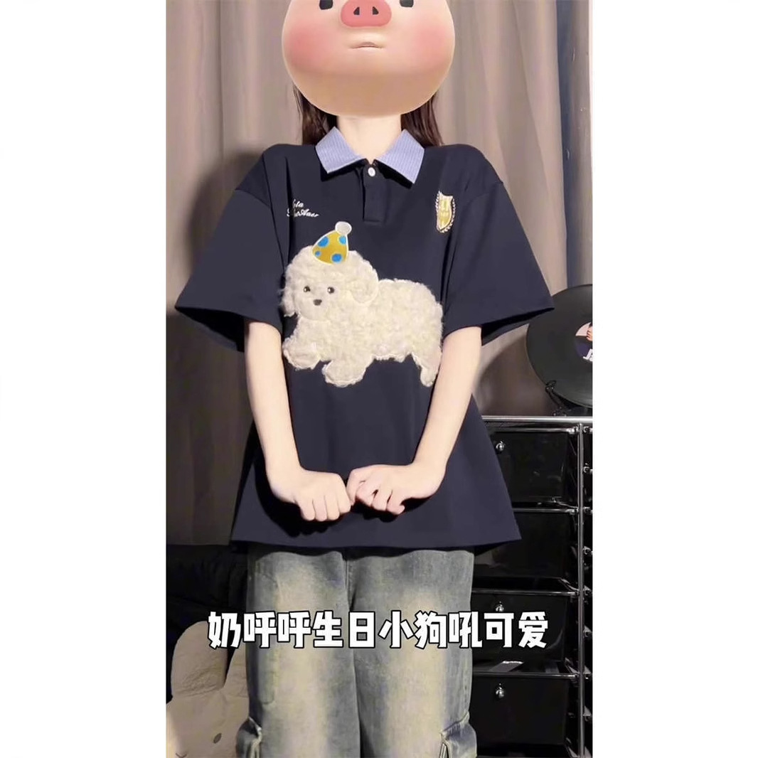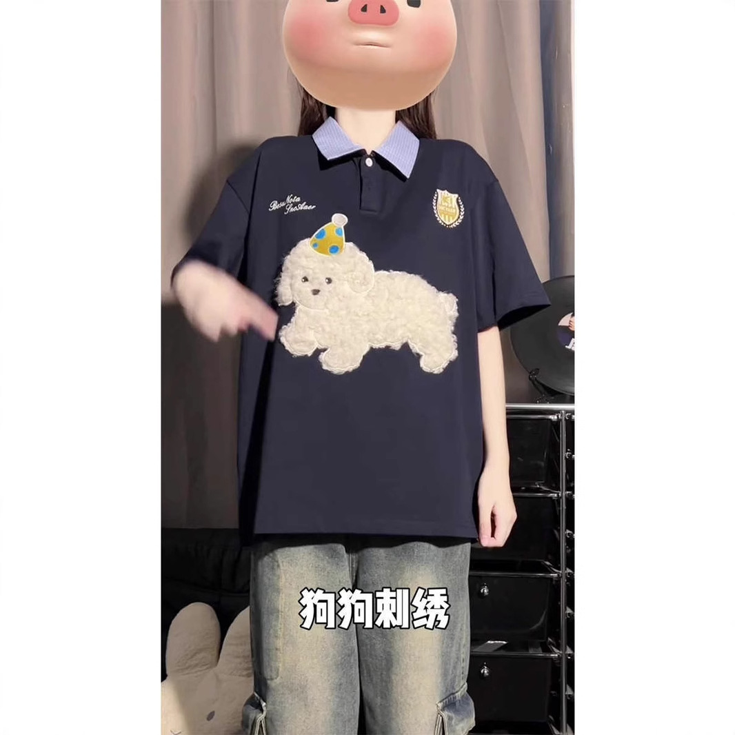 美式复古学院风刺绣狗狗短袖t恤女夏季宽松慵懒风百搭情侣上衣ins