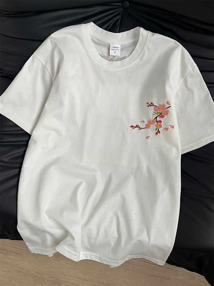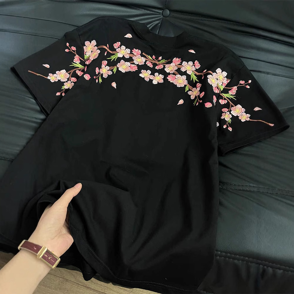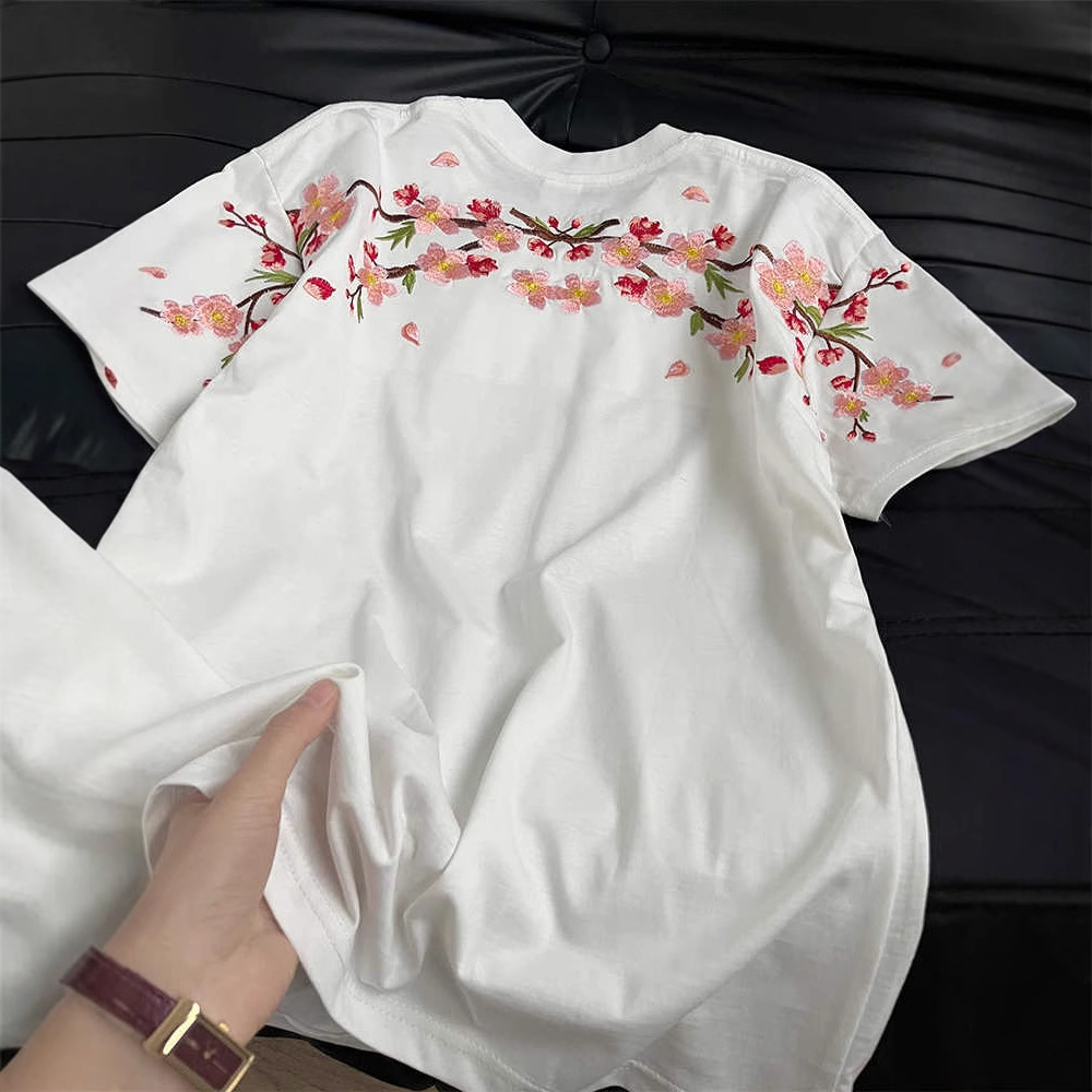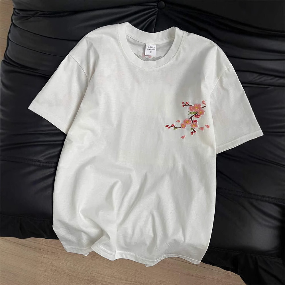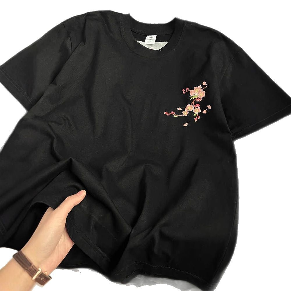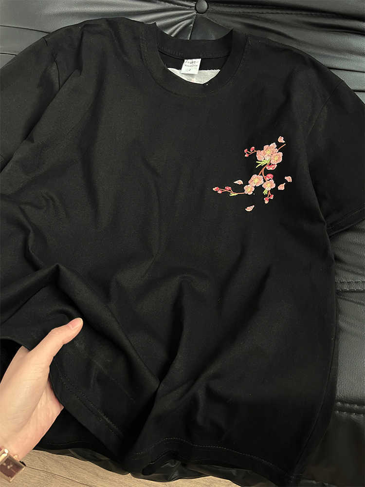 新中式国潮重工梅花刺绣纯棉短袖T恤男女夏季宽松情侣半袖上衣ins