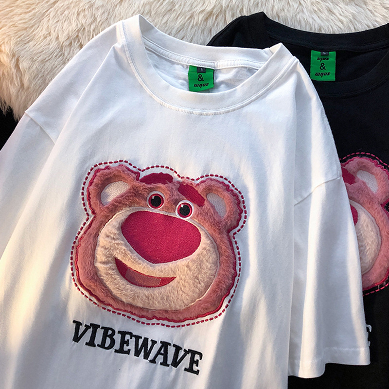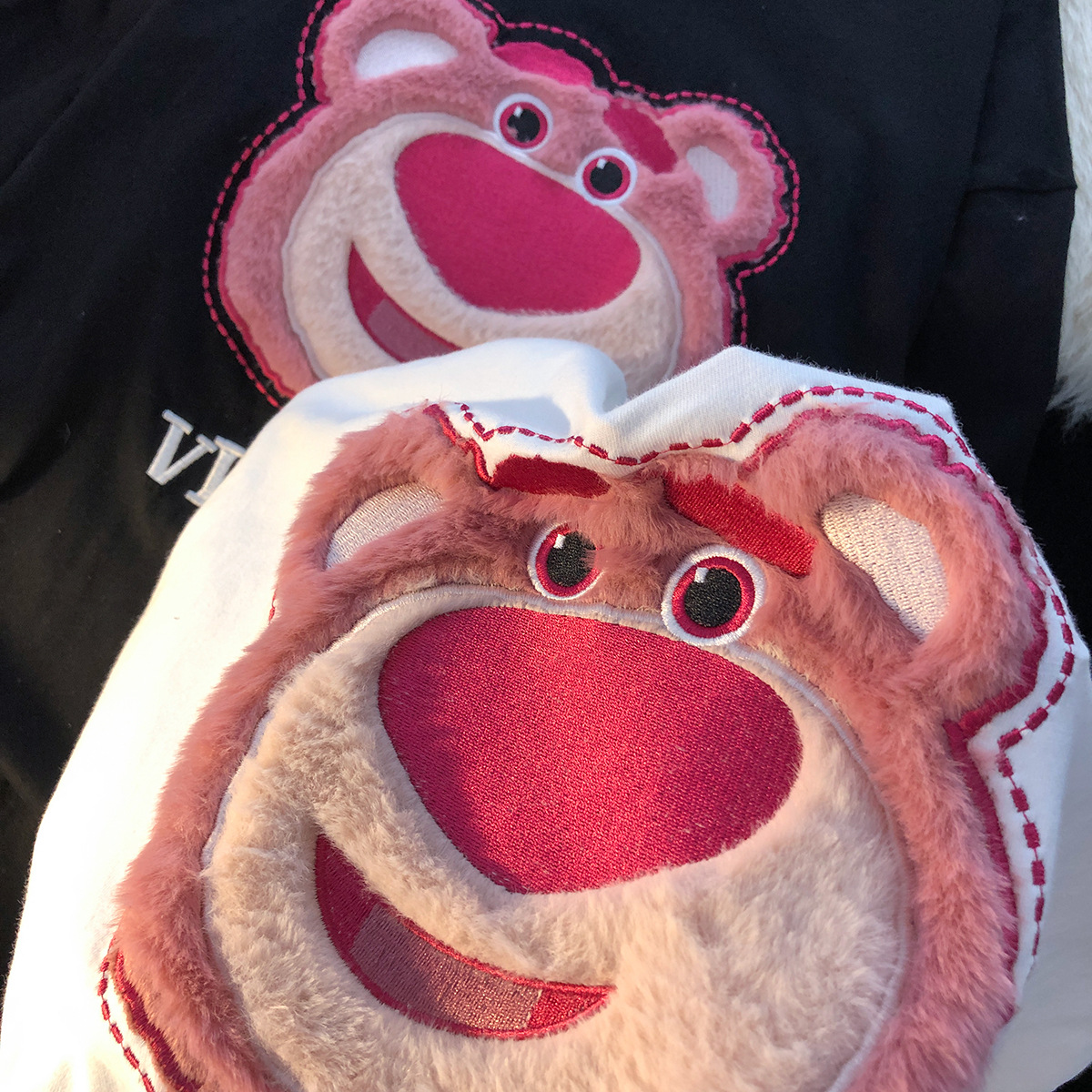 卡通植绒草莓熊刺绣短袖T恤男夏季新款日系可爱情侣装潮牌男