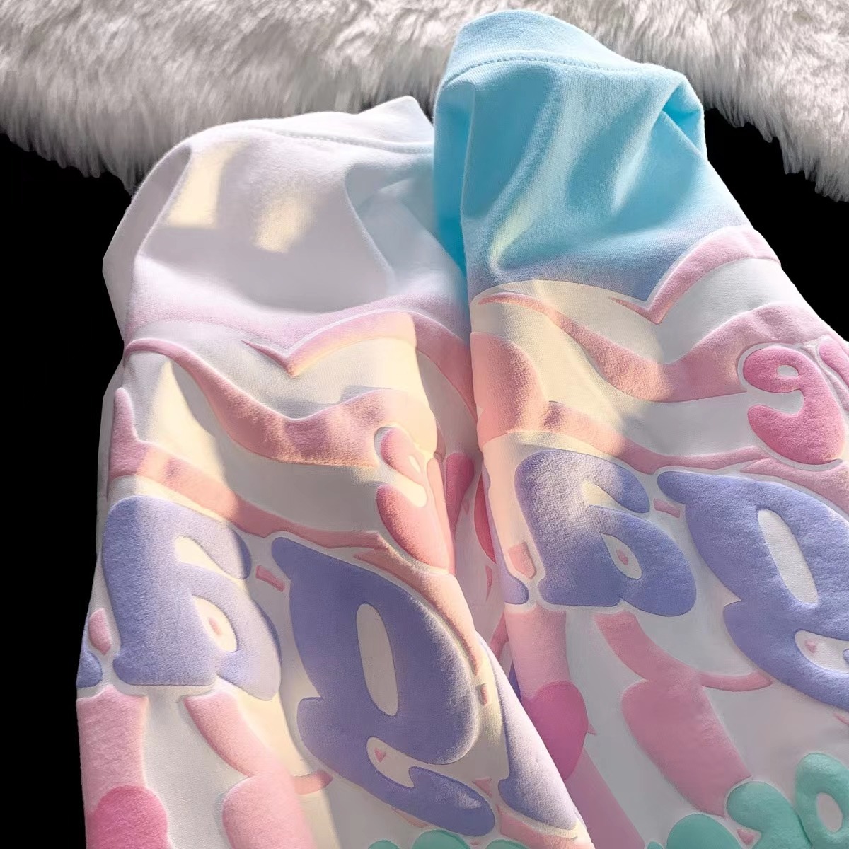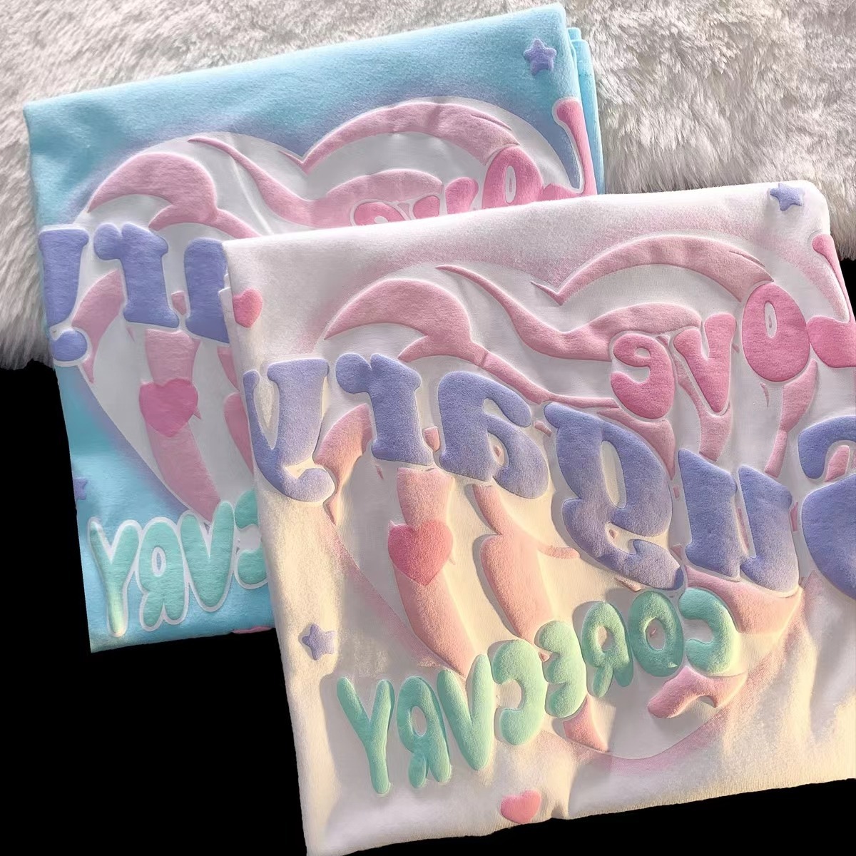 显白奶蓝色含棉短袖t恤女宽松oversize爱心甜辣上衣设计感小众夏