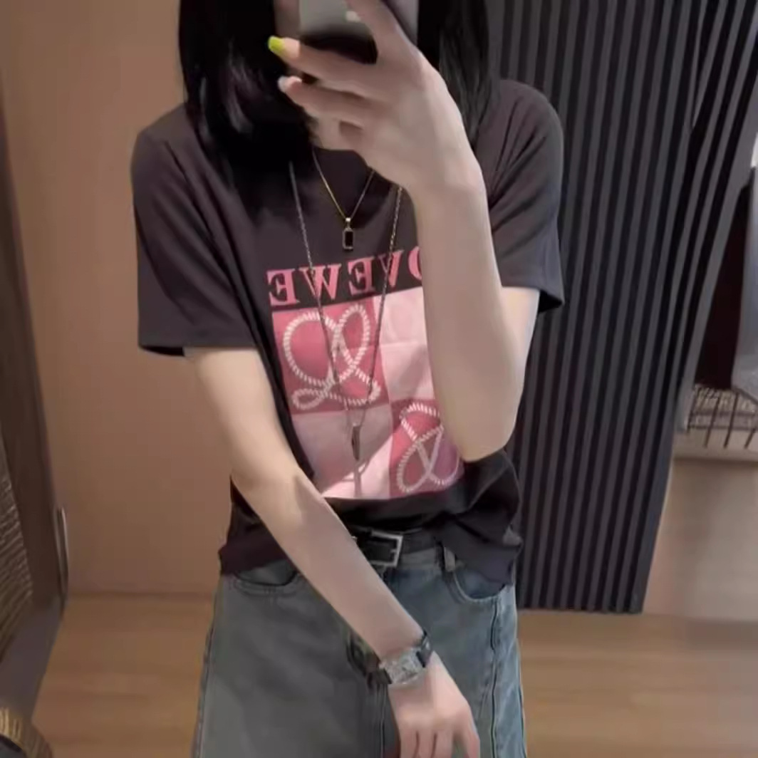 高品质纯棉长袖夏季新款印花圆领T恤短袖设计洋气修身打底上衣