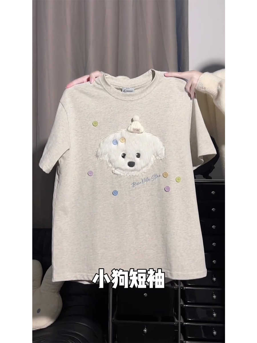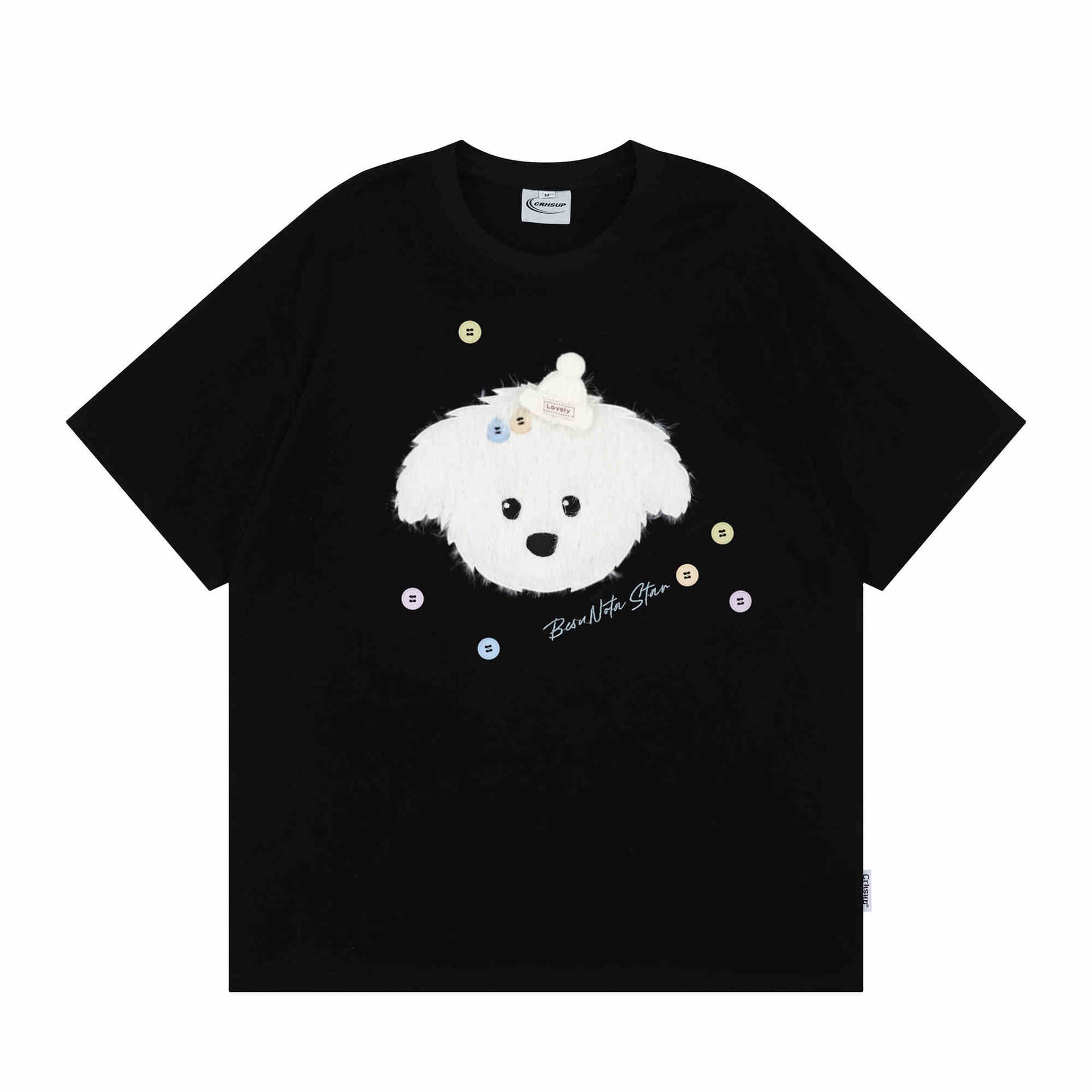 美式复古卡通毛绒小狗纯棉短袖t恤男女潮牌夏季宽松休闲情侣半袖